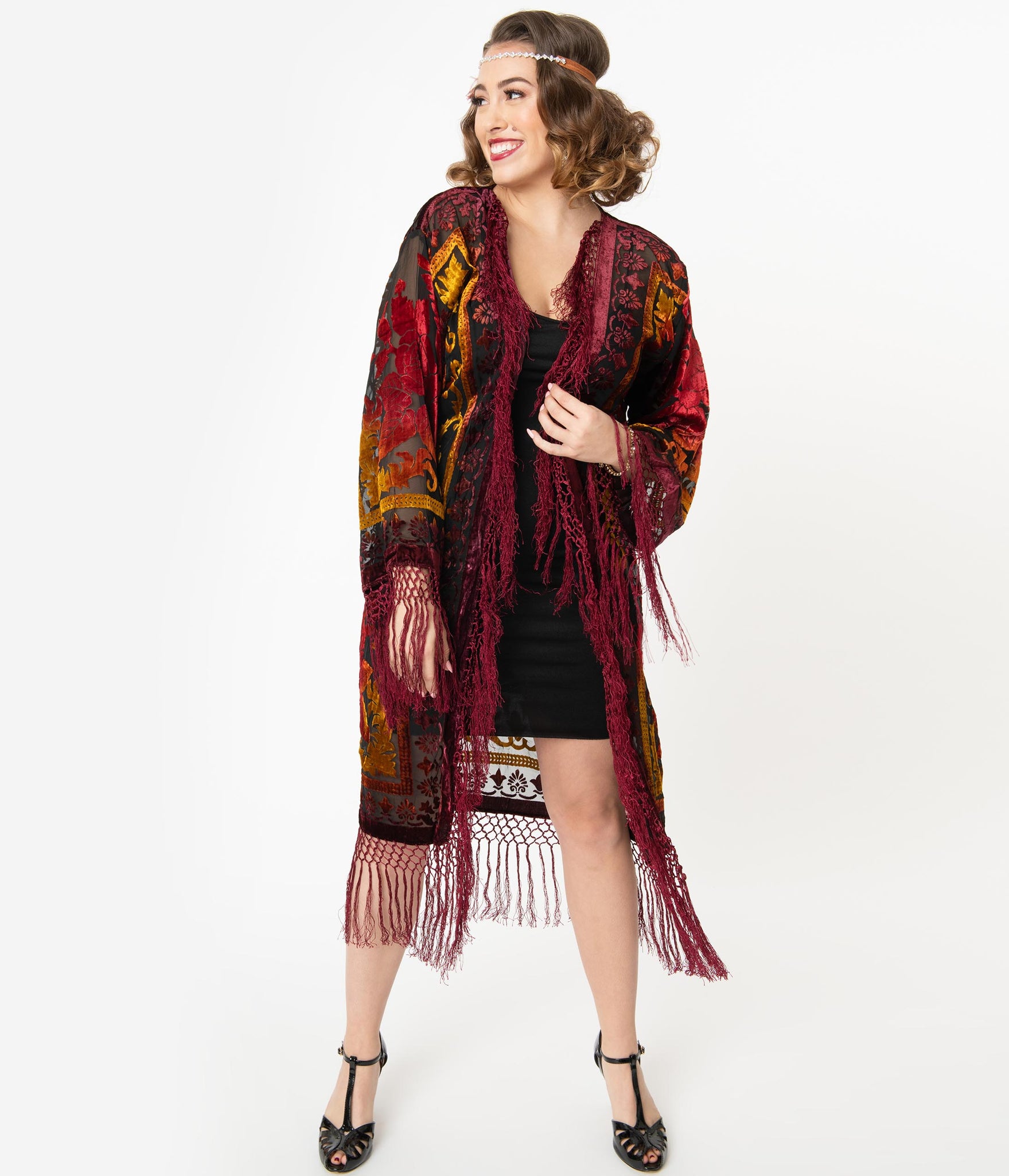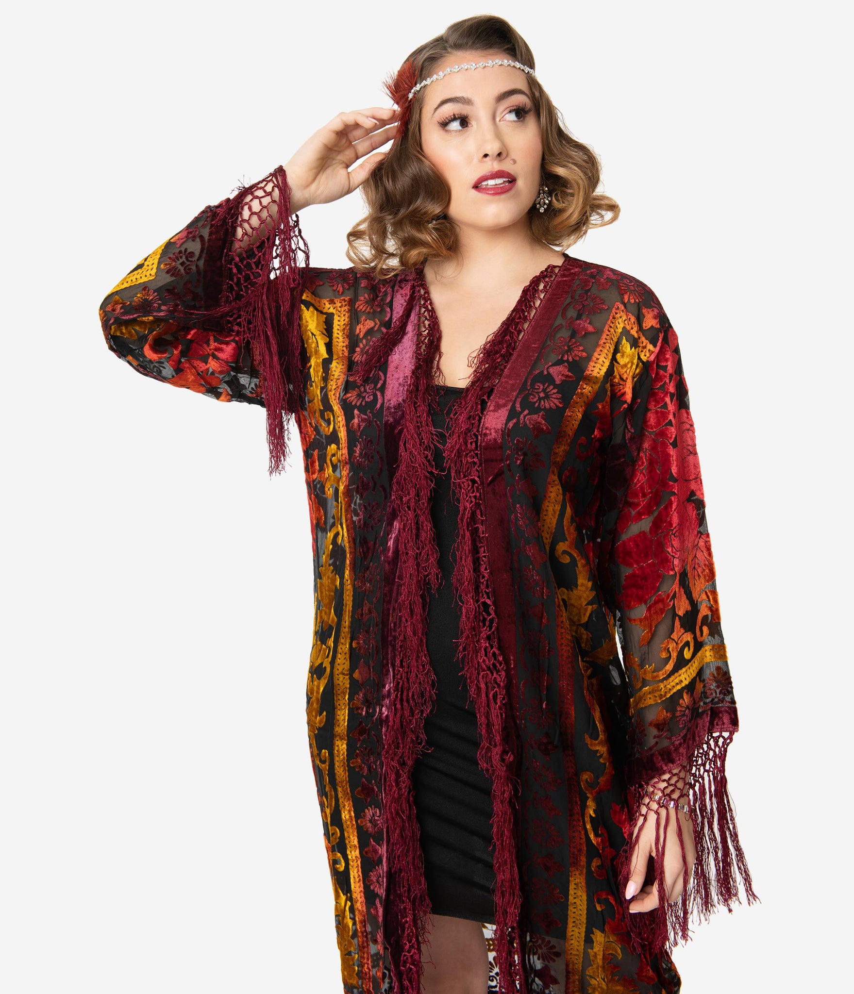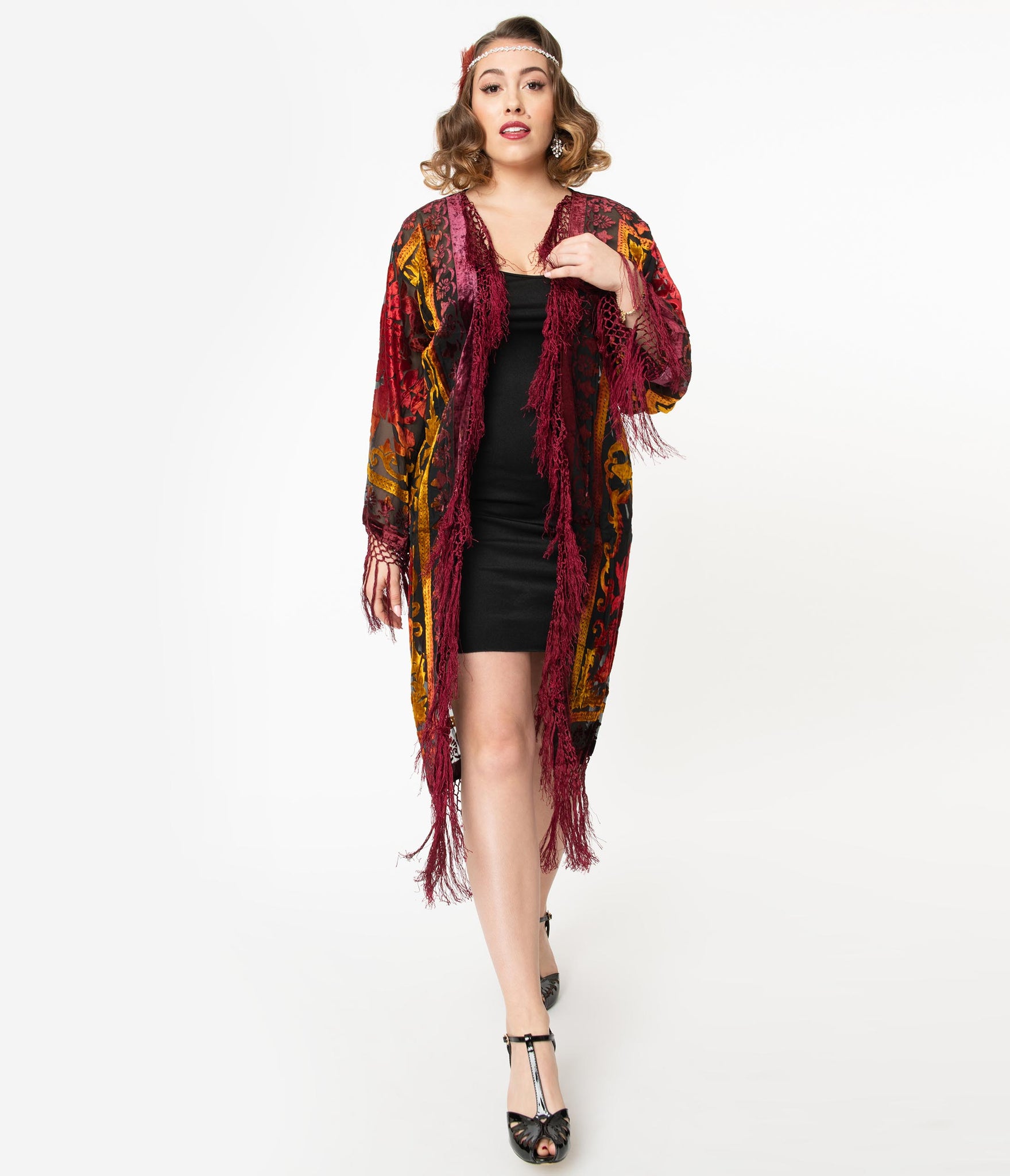 Radiant glamour! This elegant 1920s inspired scarf coat is a gorgeous burgundy red Devore velvet with gorgeous deco florals in orange and yellow hues. With graceful long sleeves and diamond lattice working along the hem and cuffs, and subtle tassels throughout.