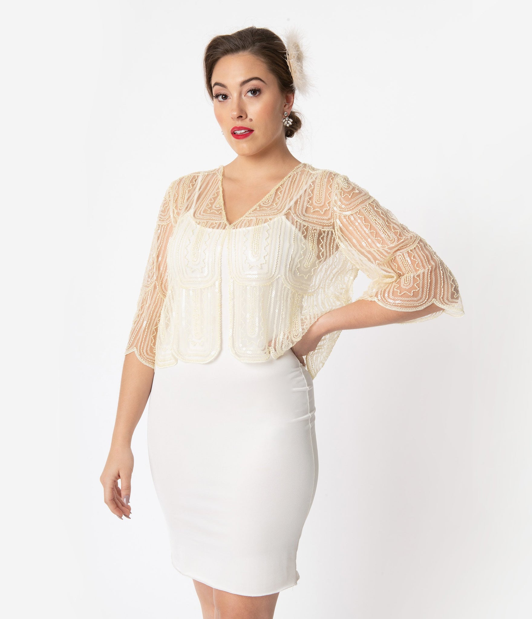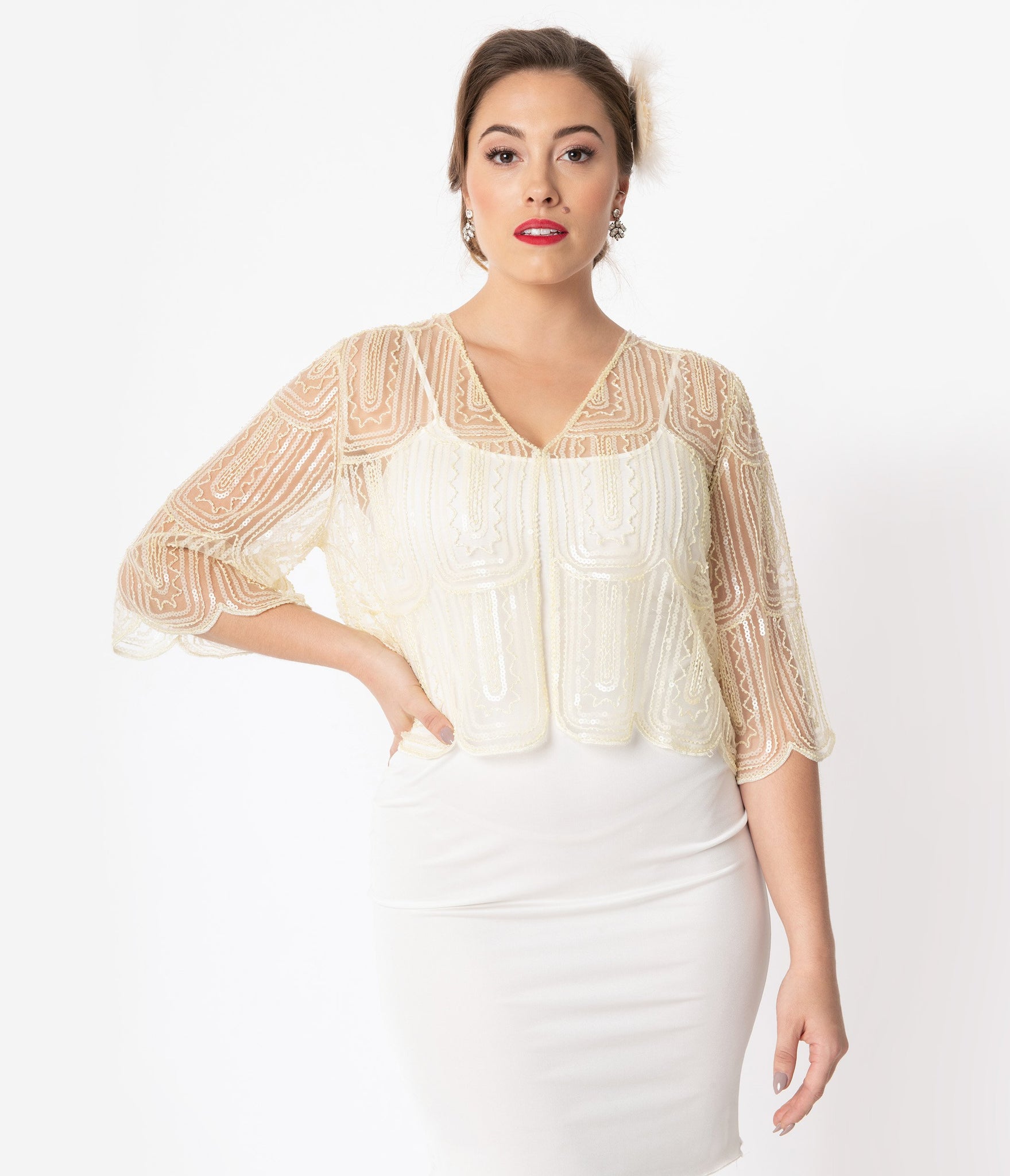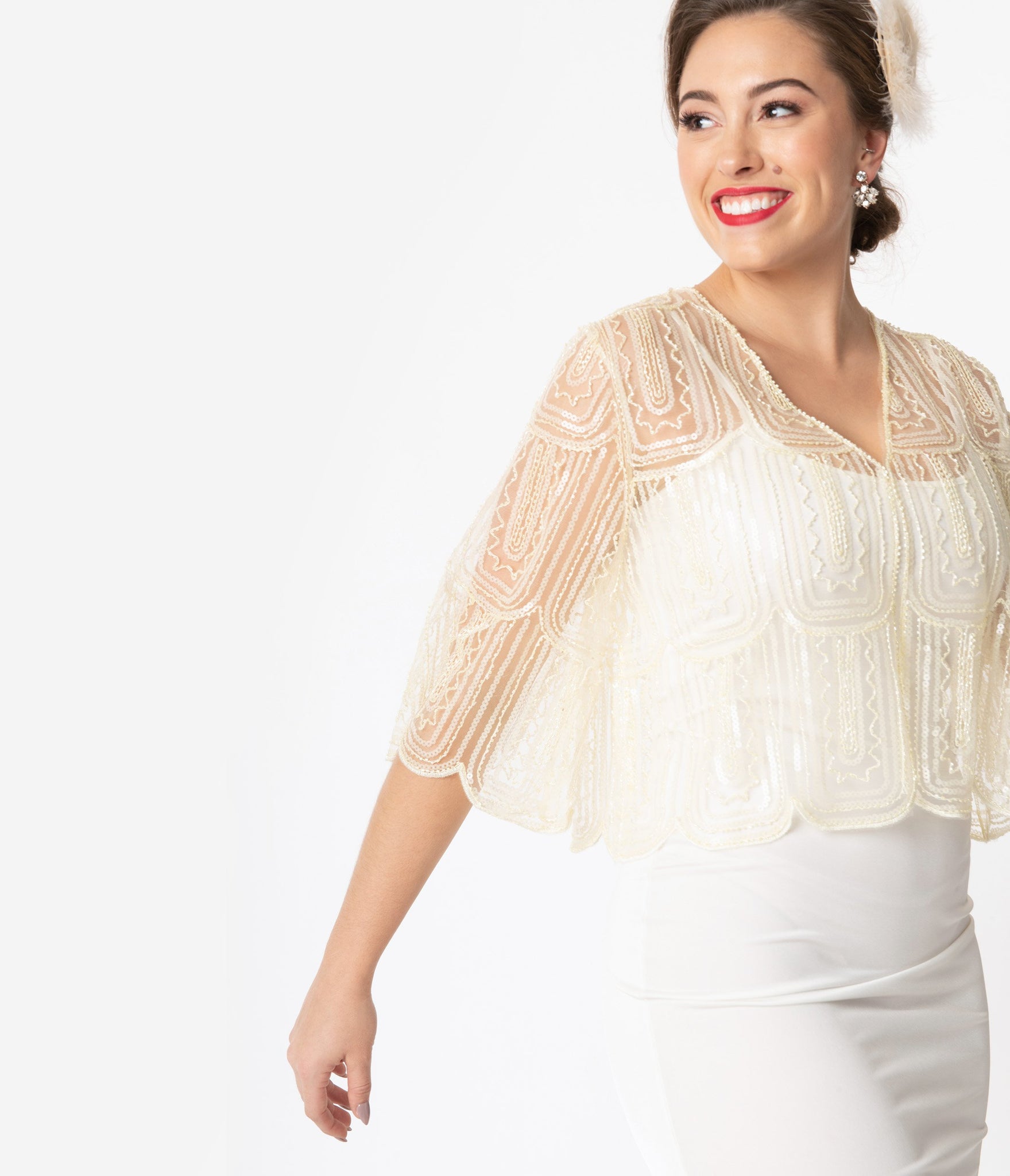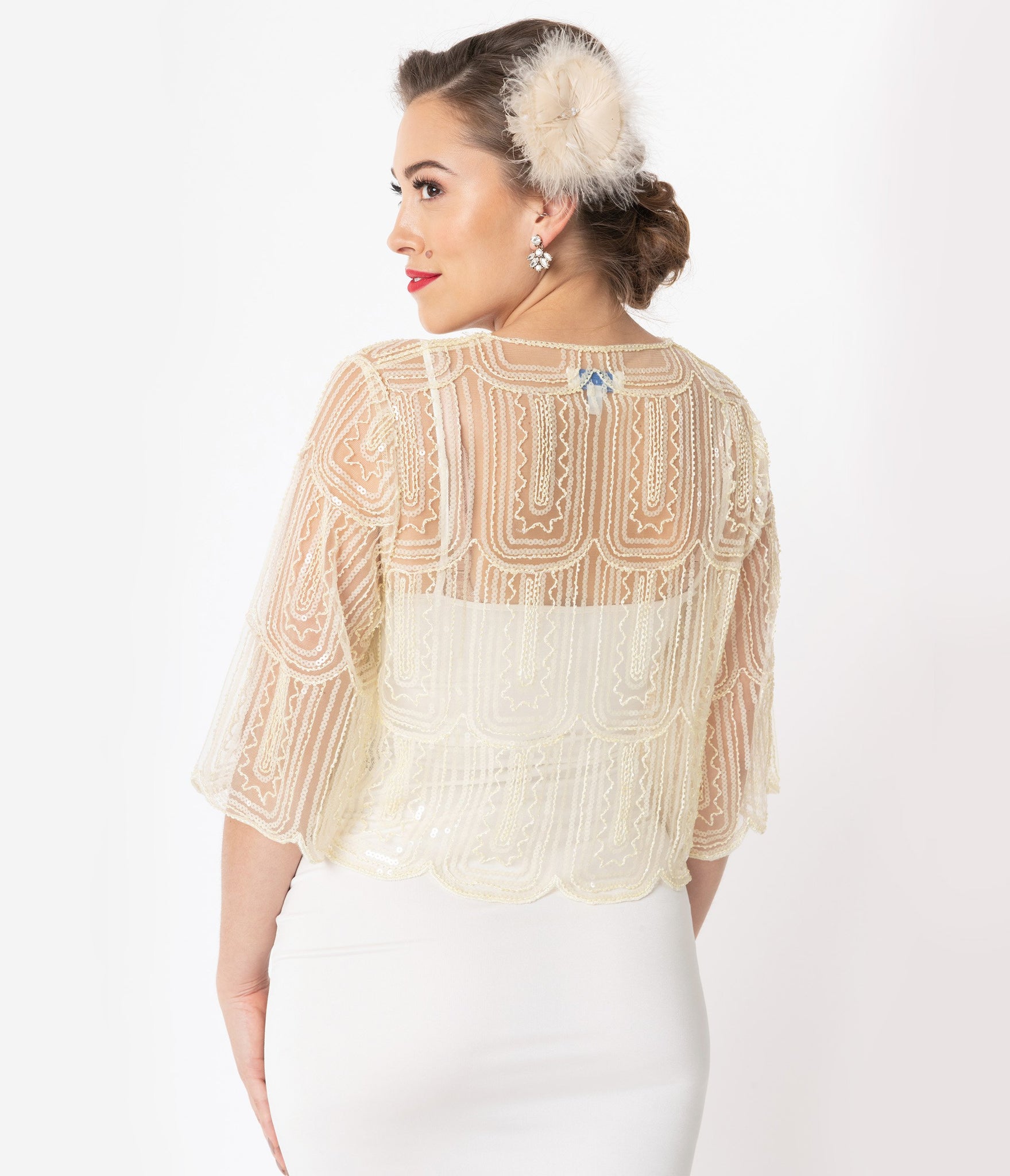 Add a little something extra, doll! This ivory beaded 1920s inspired bolero will top off your favorite flapper outfit. This beautifully crafted bolero is made from a thin mesh and intricately woven with beads and sequins. Scalloped edges and a hook closure add the final details to this vintage inspired piece. Make a statement, babe!