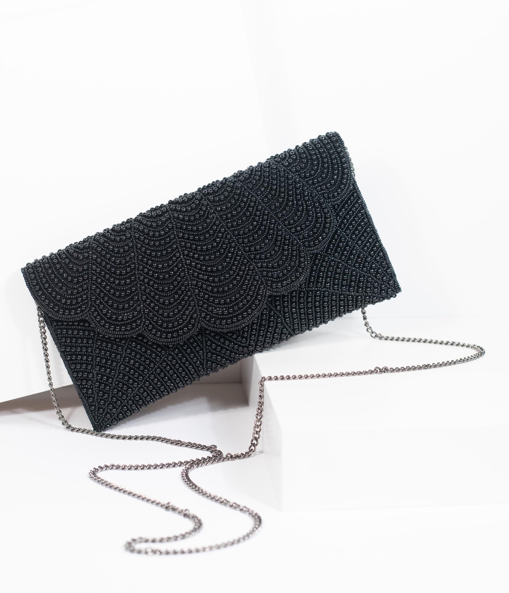 Outfit your glamorous ensemble with a bit of sparkle! This marvelous beaded envelope clutch features a beautiful array of black beaded patterns. The magnetic fold over closure opens to an inner slip pocket and fabric interior. Complete with a thin, removable chain shoulder strap to keep this stunning partner at your side!