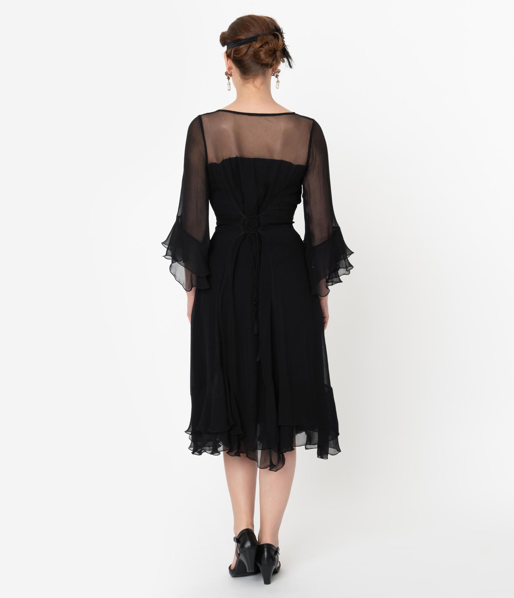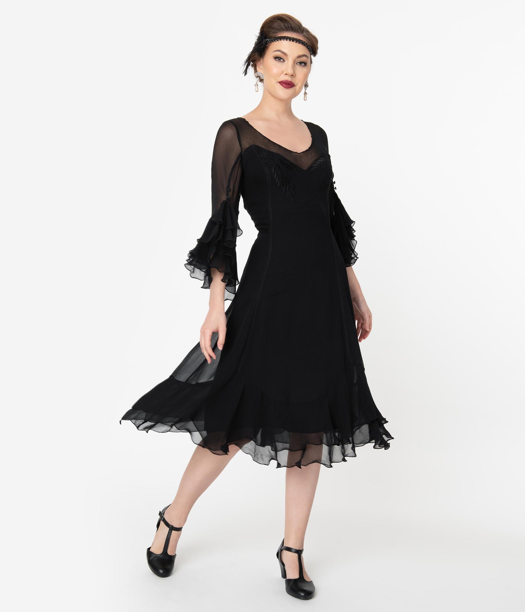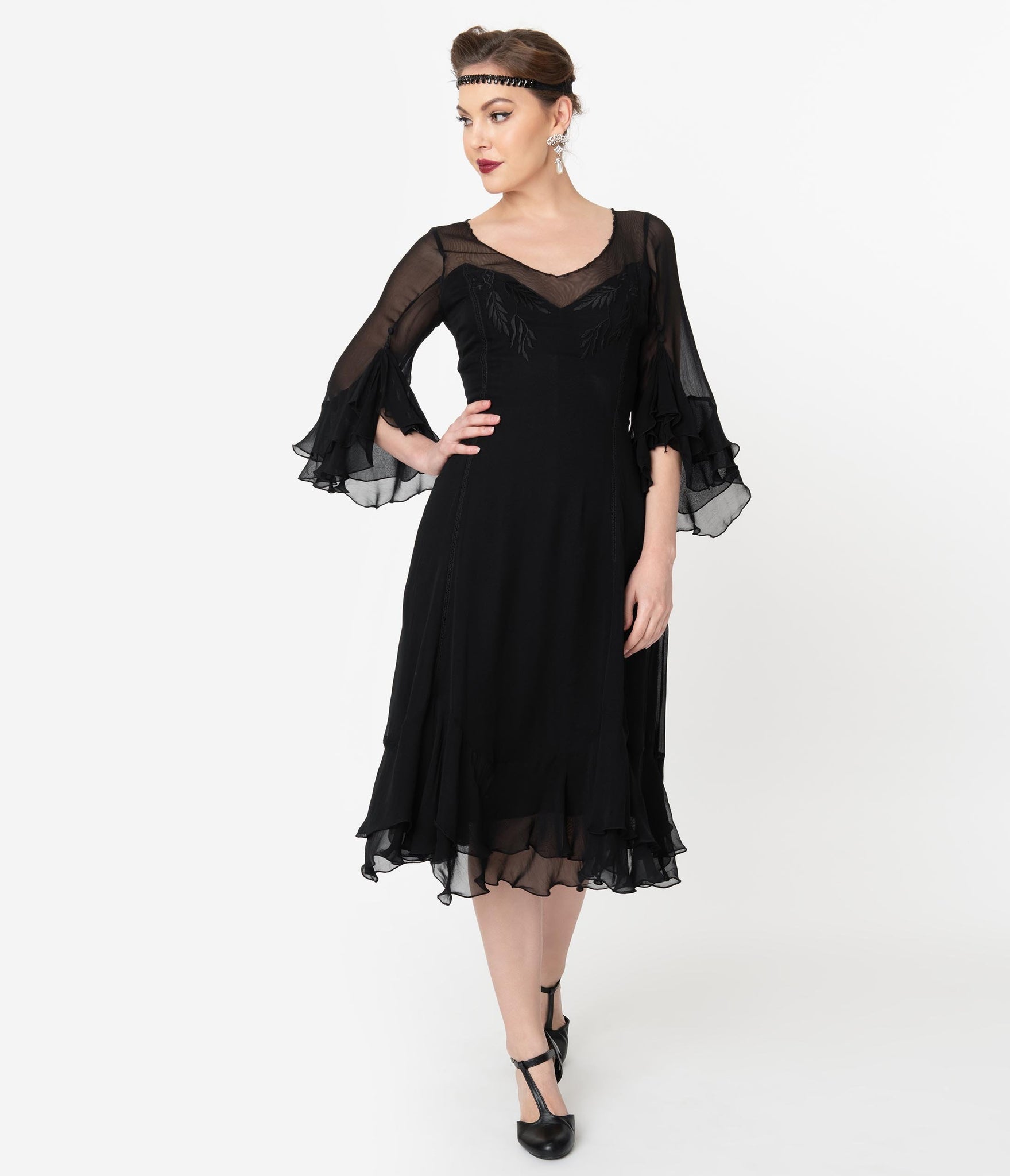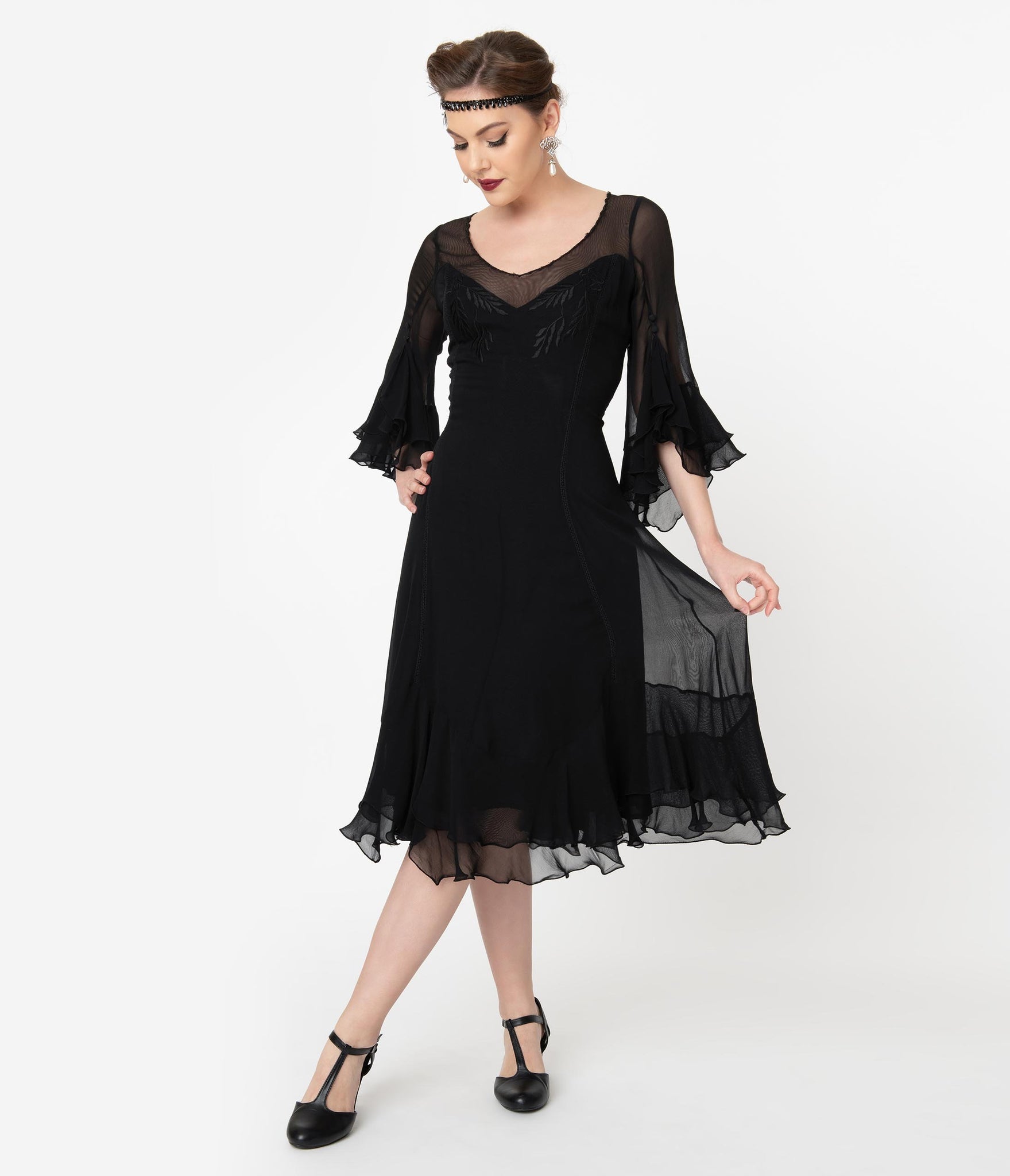 Bewitch them with your beauty, dames! An elegant confection for midnight mavens, this elegant 1920s style dress is cast in a lightweight black mesh that flutters throughout your form. The illusion neckline is framed by sheer three-quarter length sleeves that drop into a tiered cuff while the princess seaming flatters your hourglass. With a dash of black embroidered detail on the bust, a hidden side zipper, and a dancing ruffle tiered hem to steal the show!