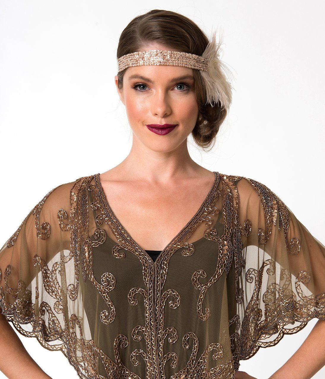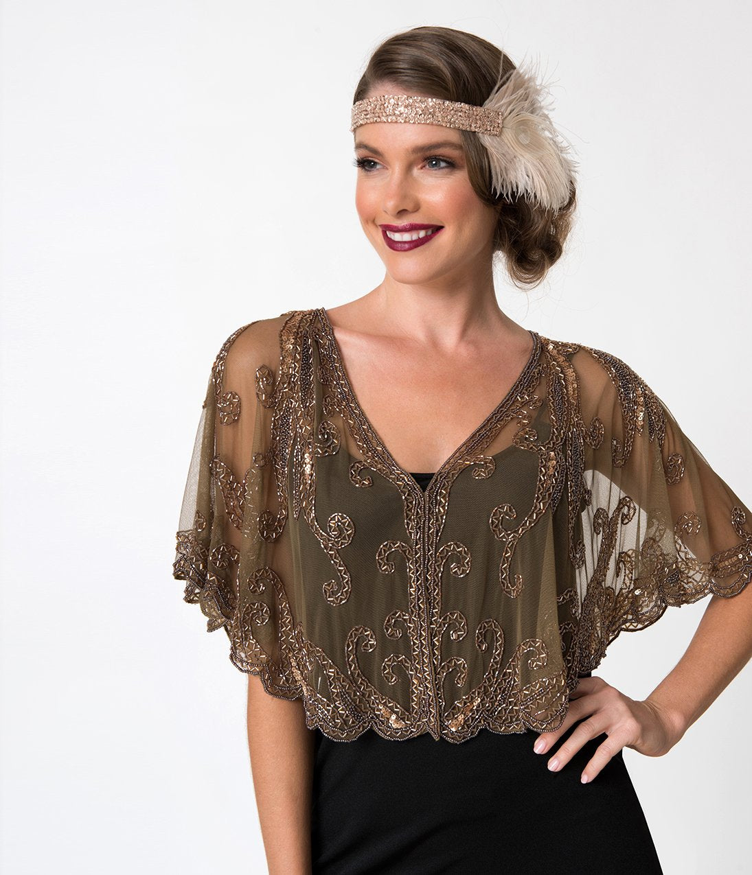 1920s Style Brown & Dusty Rose Gold Beaded Sheer Mesh Capelet