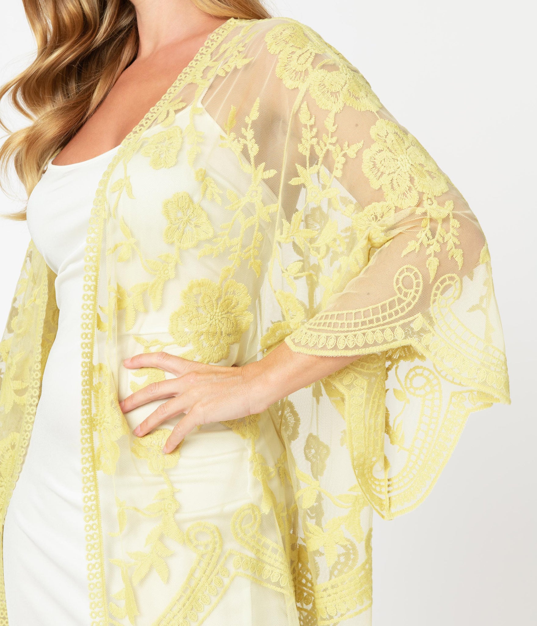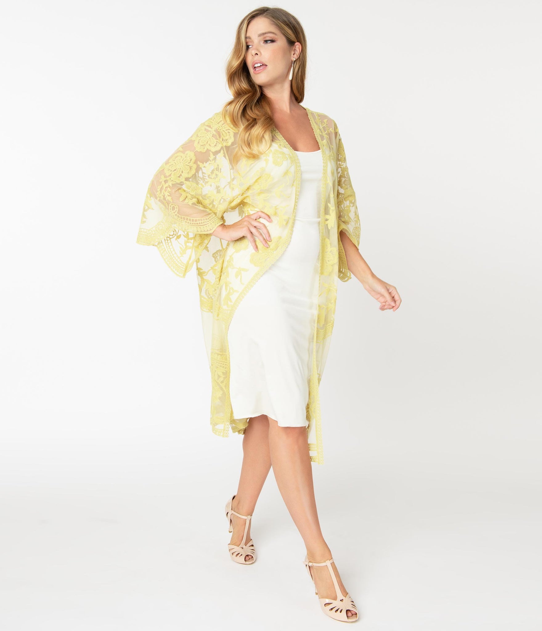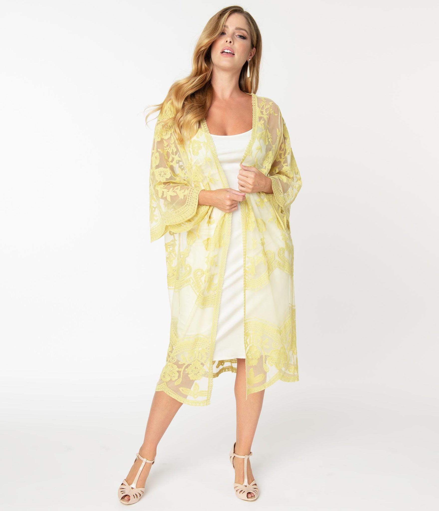 Feminine grace, dolls! A fabulous scarf coat for your flapper ensemble, this sheer piece boasts light pink crochet lace embellishment throughout the long open design. Complete with breezy three-quarter length sleeves, don’t forget to pair with gin, darling!