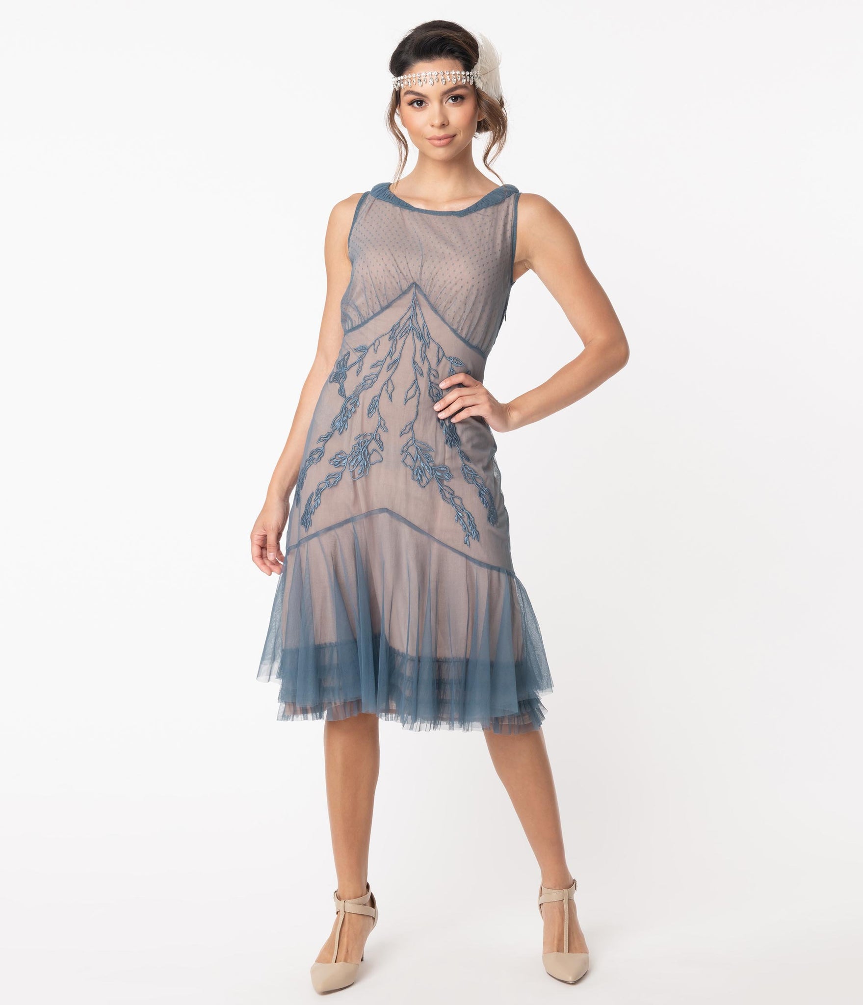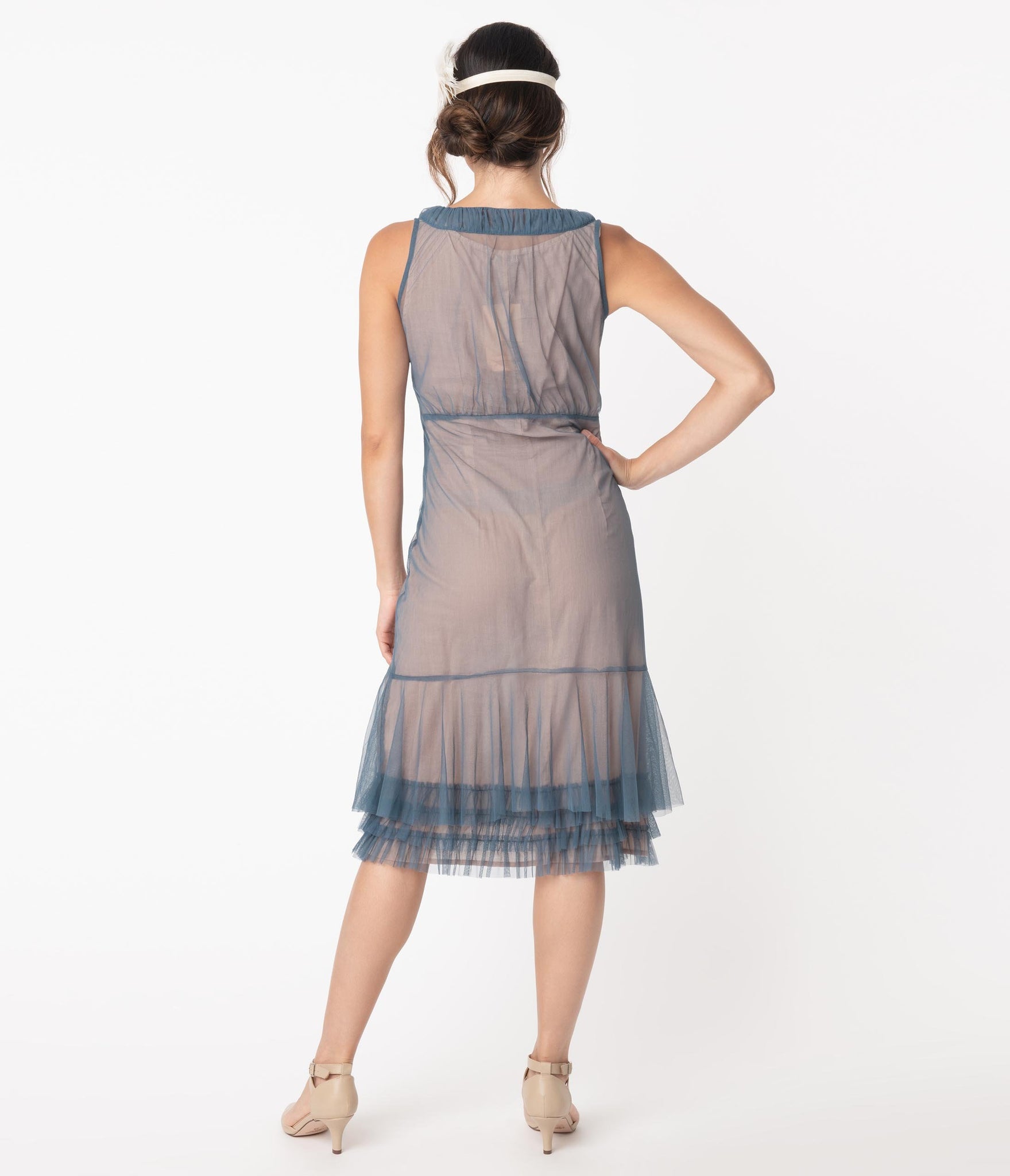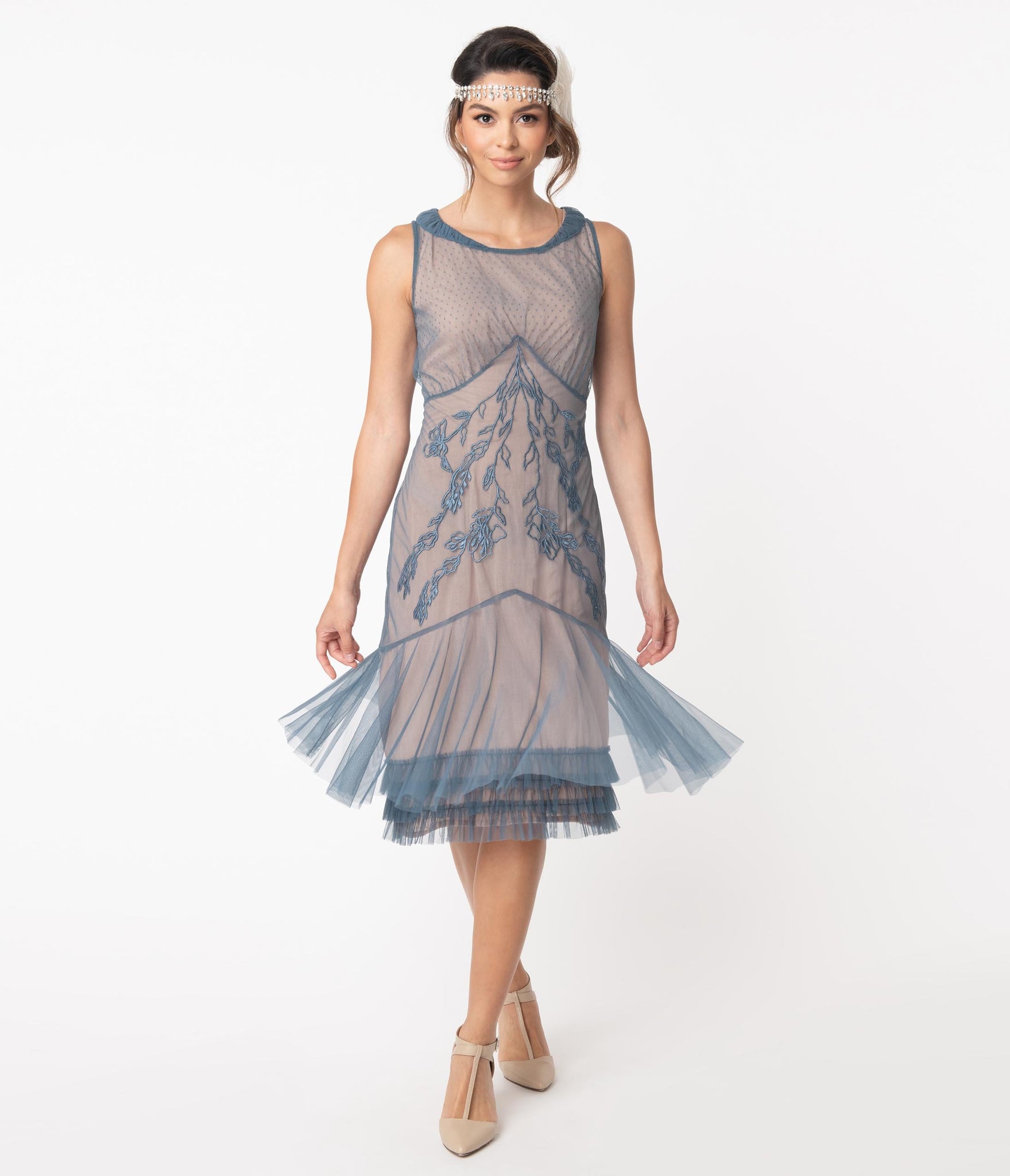 Cruise through the Art Deco days, darling! A lightweight beige slip rests under the sapphire blue mesh cover to give your closet a little 1920s style boost. This fantasy piece gathers around the knees while ruching around the bust flatters your natural curves. A simple hidden side zipper makes this dress easy to slide into, and the rich embroidery turns you into a vintage dream!