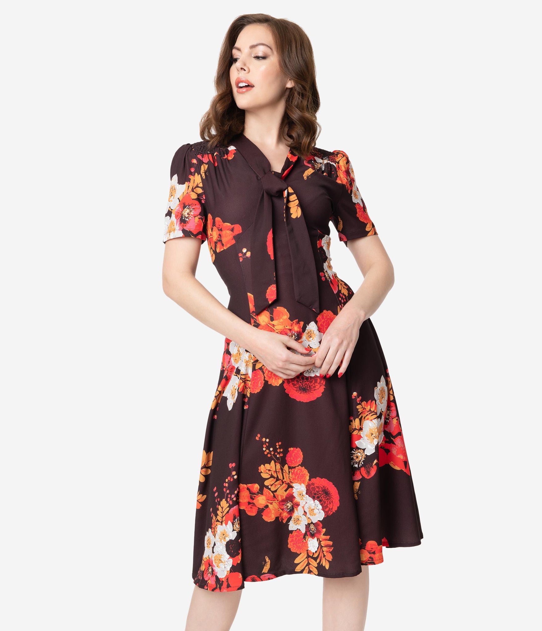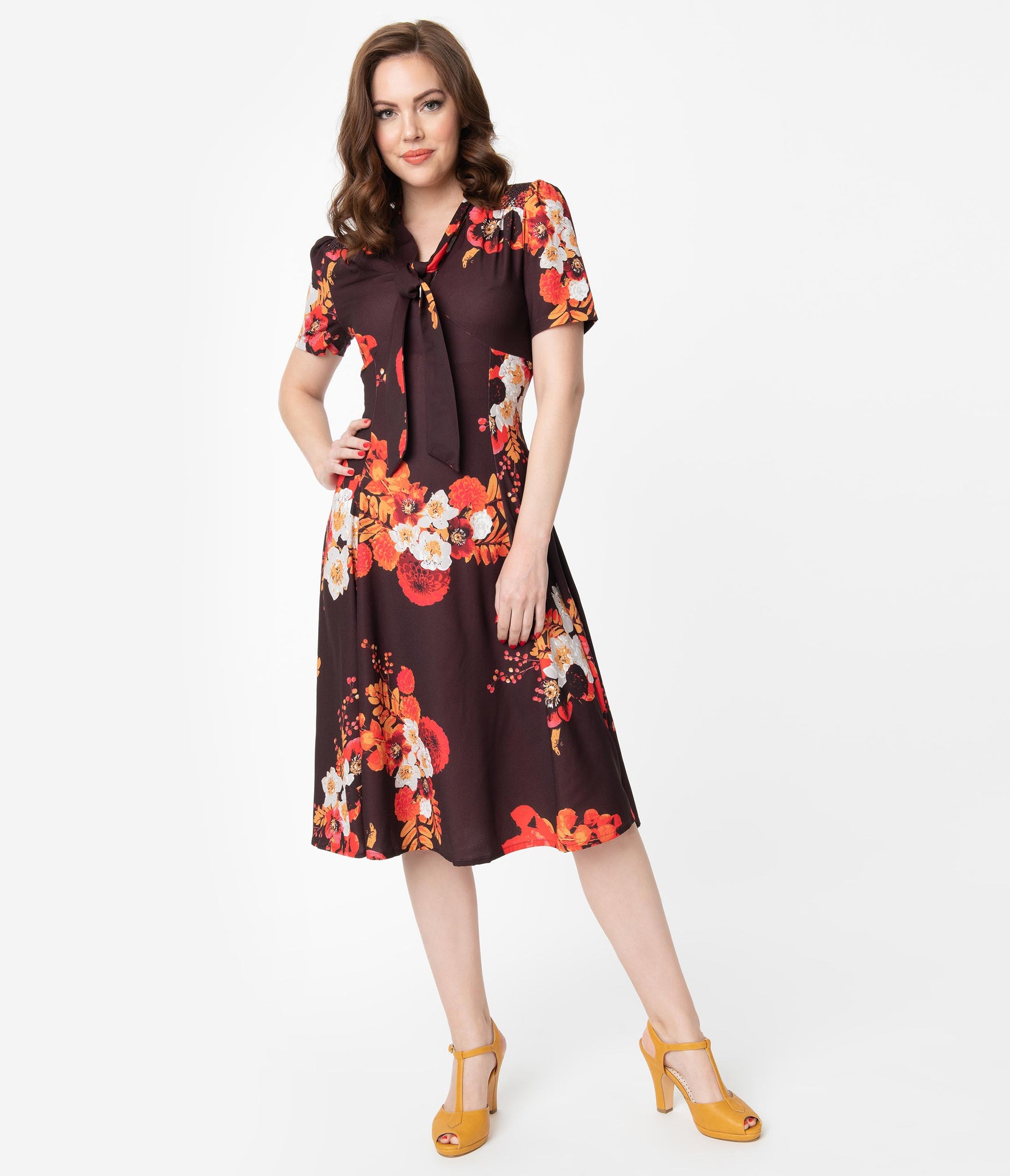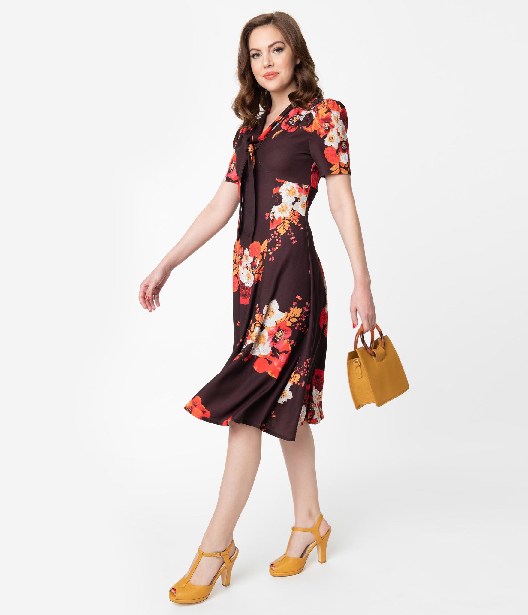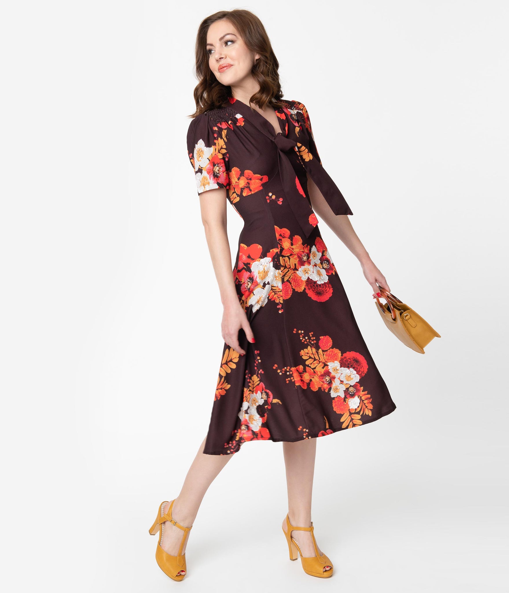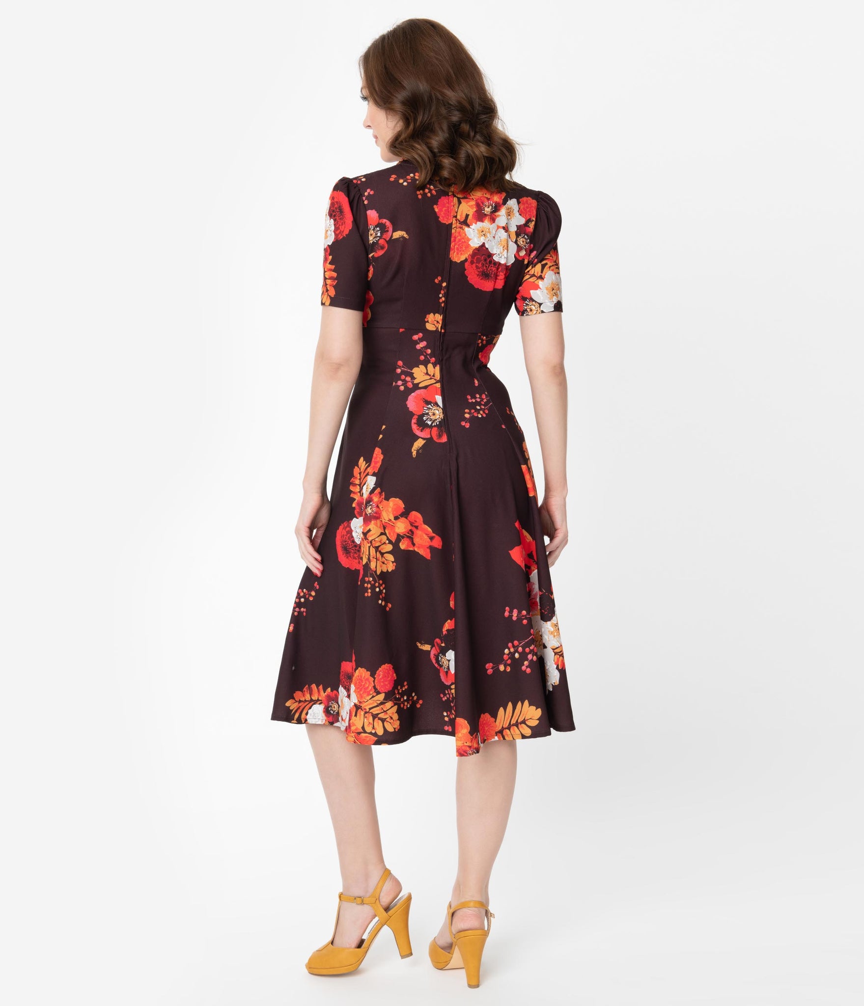1940s Style Brown Autumn Floral Izzy Swing Dress