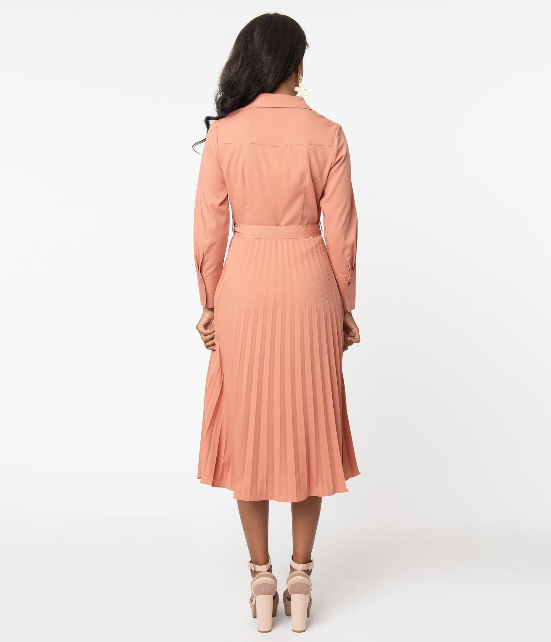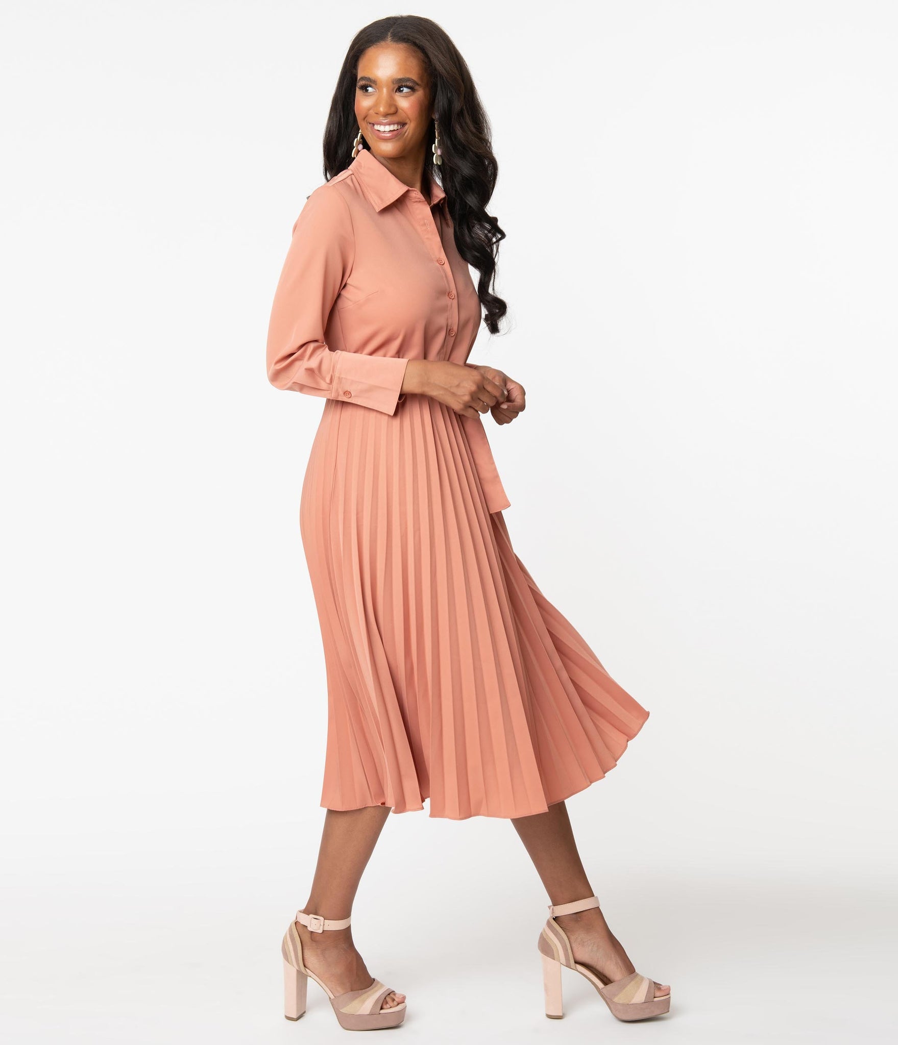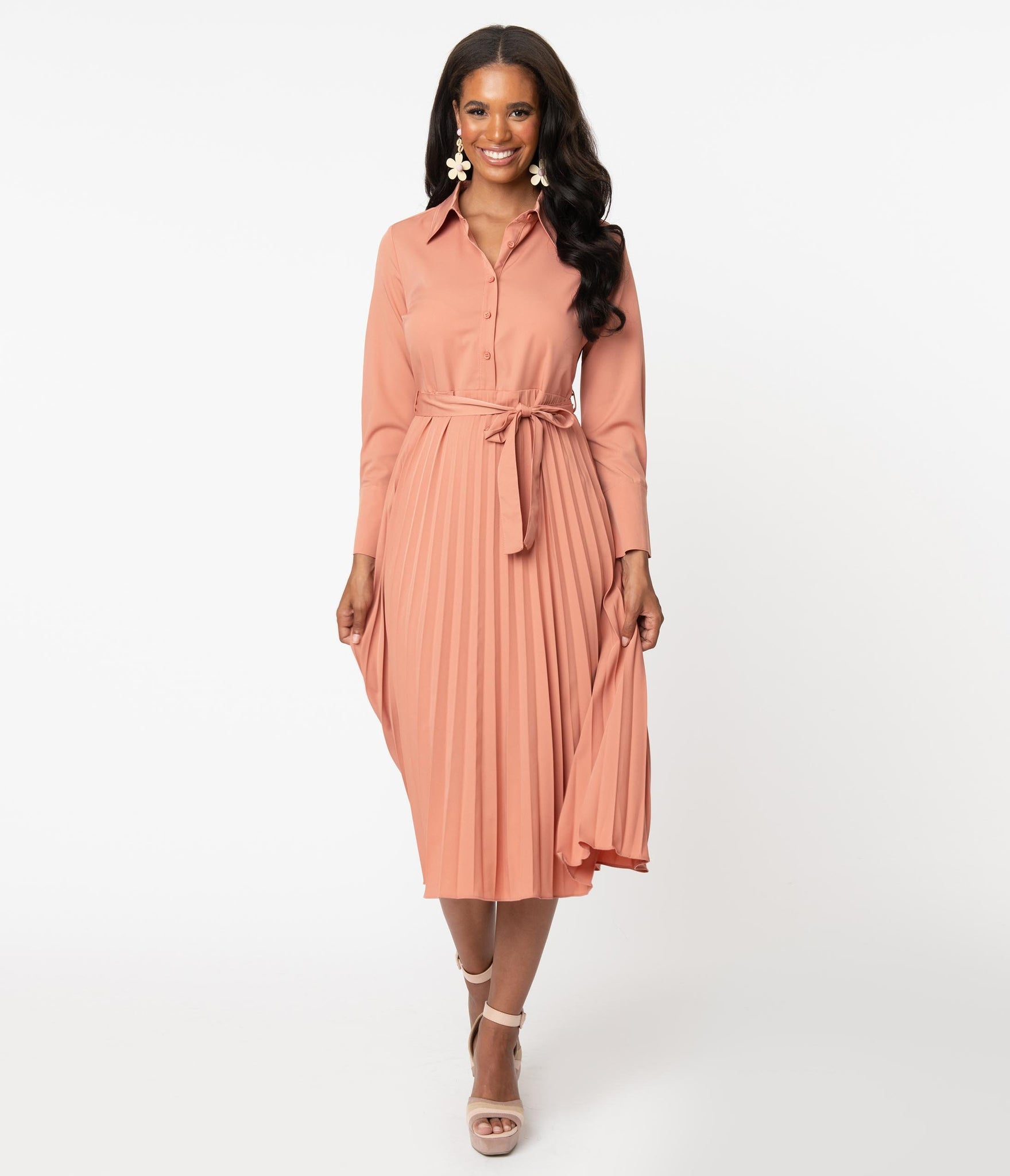 Sweep away those cloudy days, darling! This gorgeous vintage style frock is a modest and sophisticated piece, crafted in a marvelous rose pink woven fabric. The button up bodice leads to a classic collar framed by slender long sleeves that drop into a button cuff while the seamed waist is cinched with a matching sash and side zipper. The sweeping midi skirt is a delight with soft accordion pleats throughout!