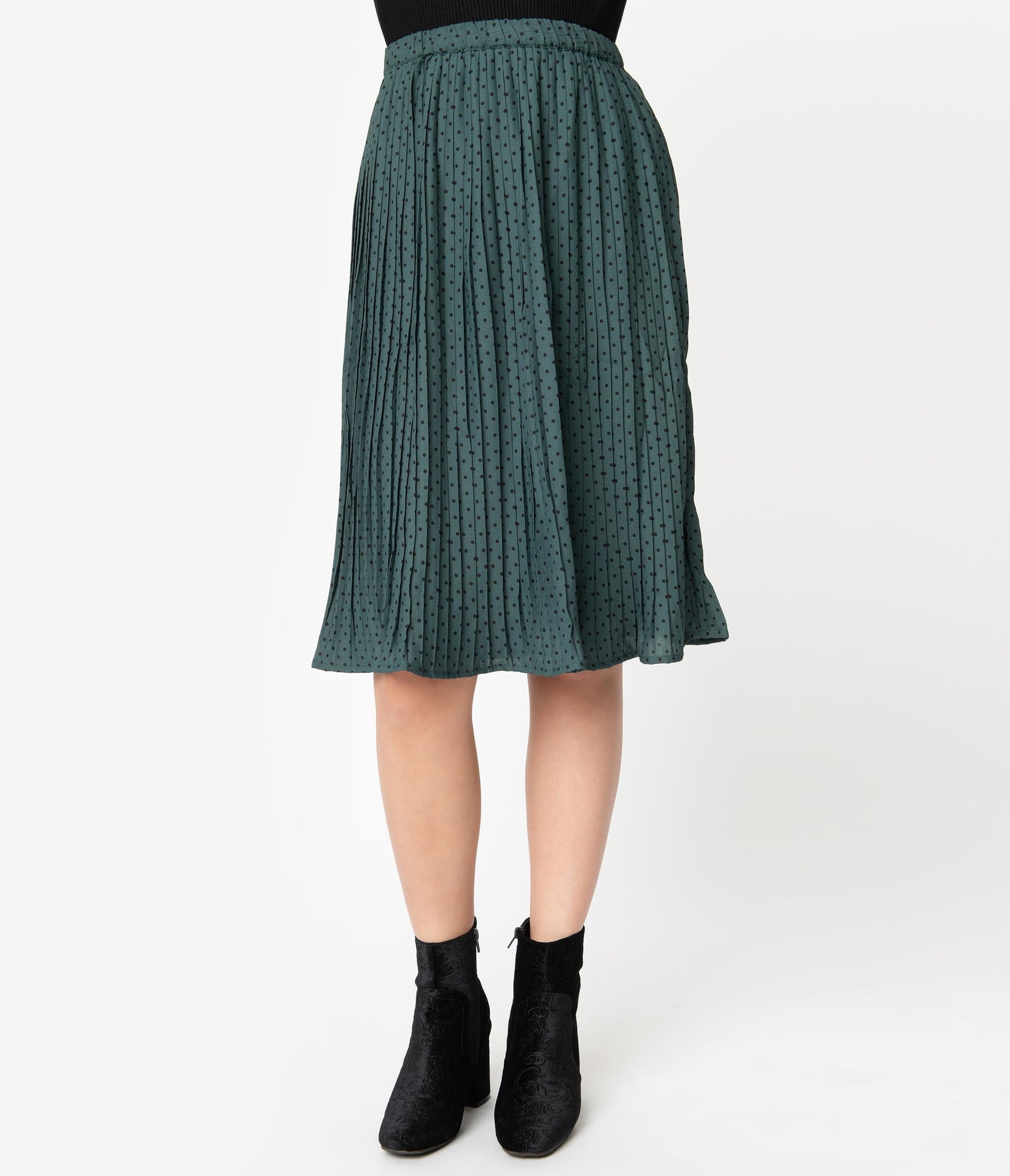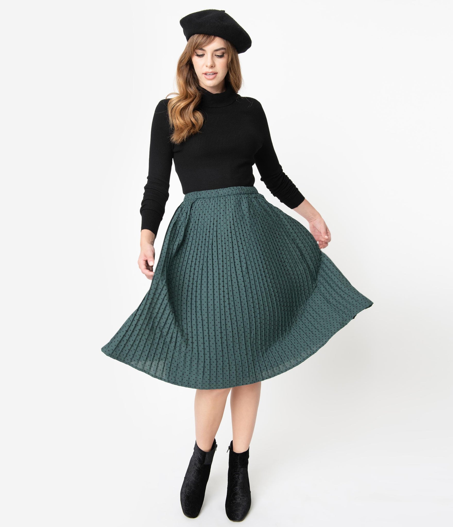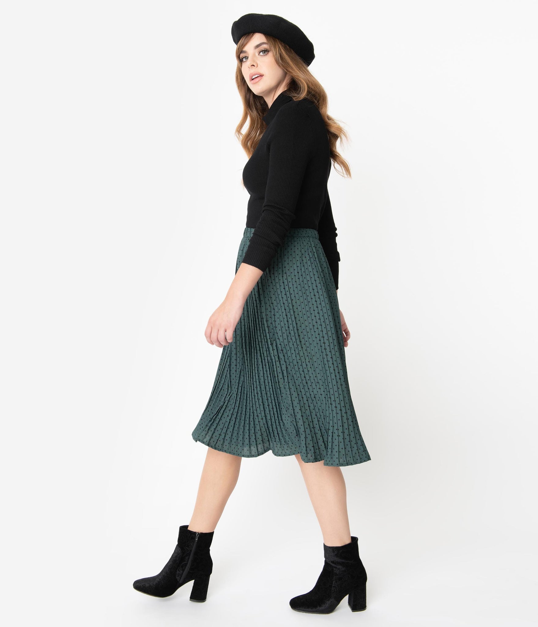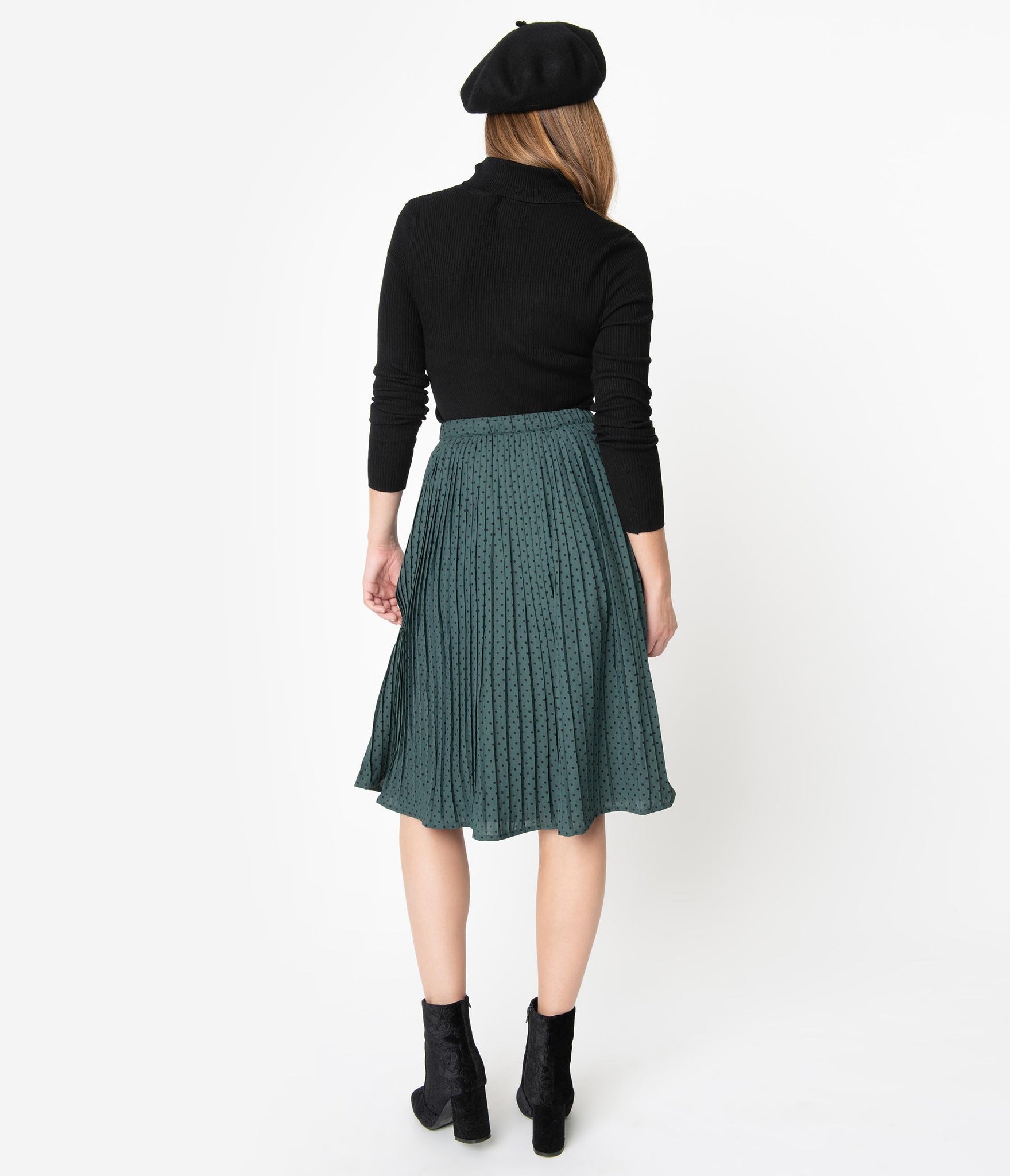 1940s Style Emerald Green & Black Pin Dot Pleated Skirt