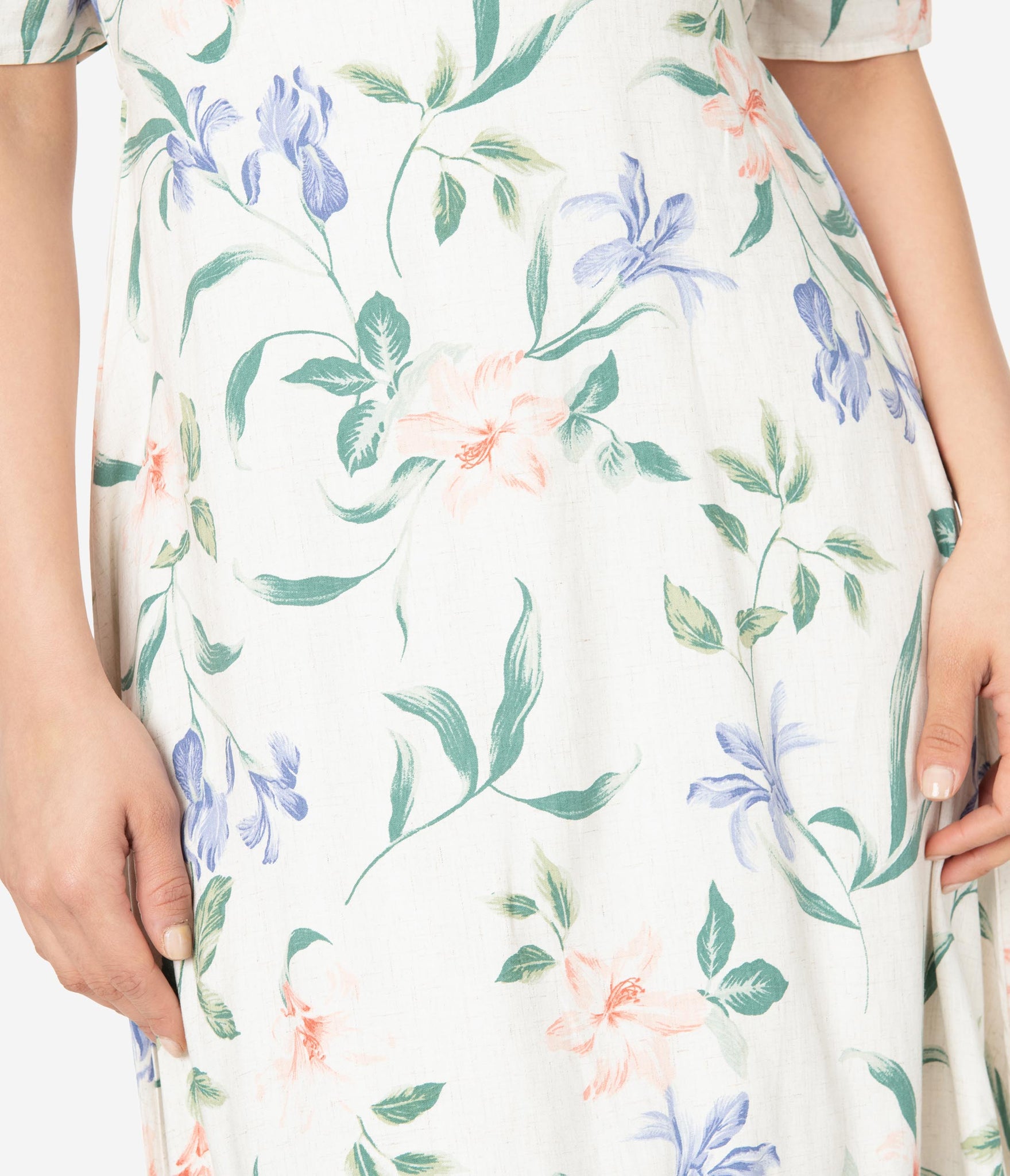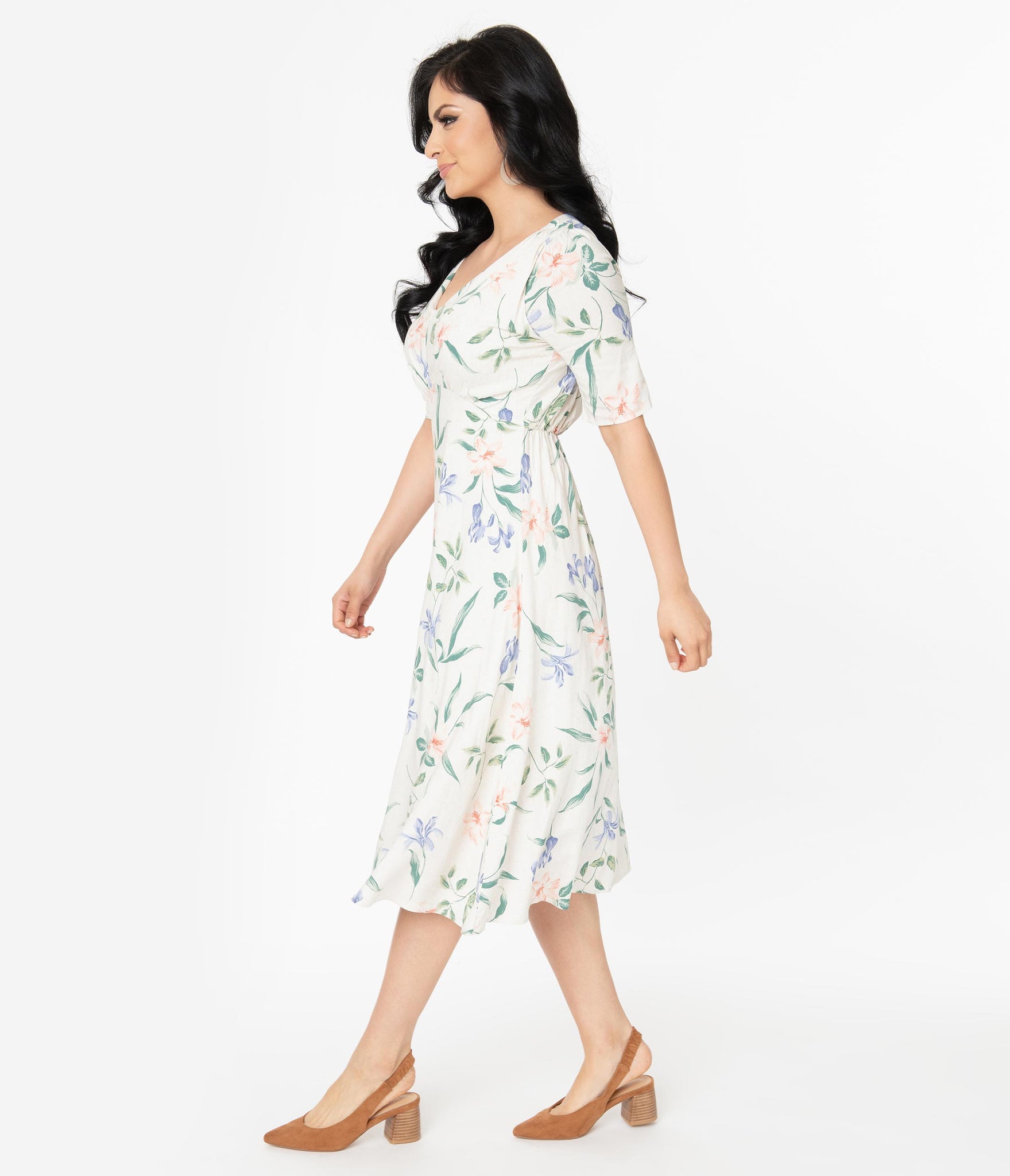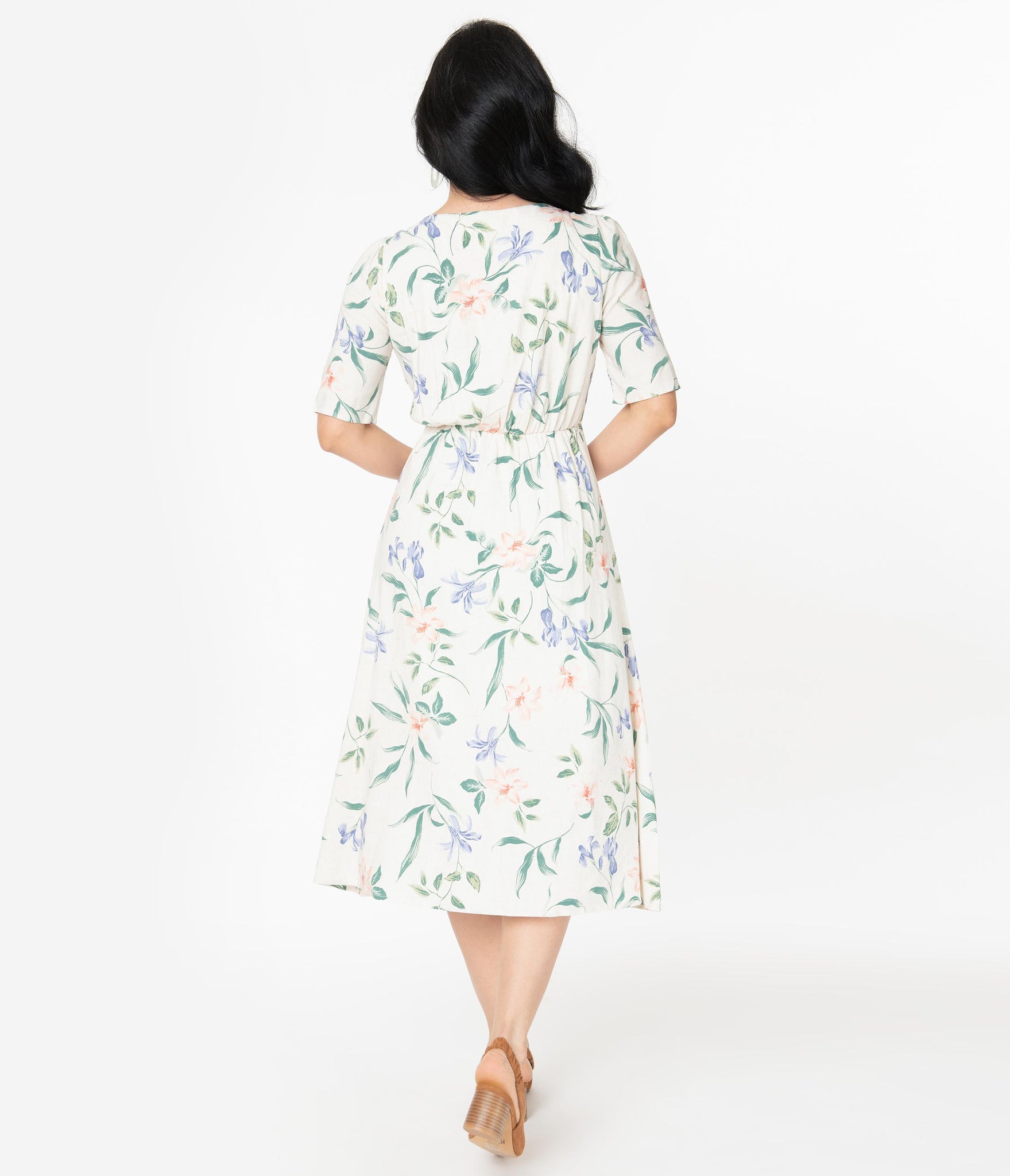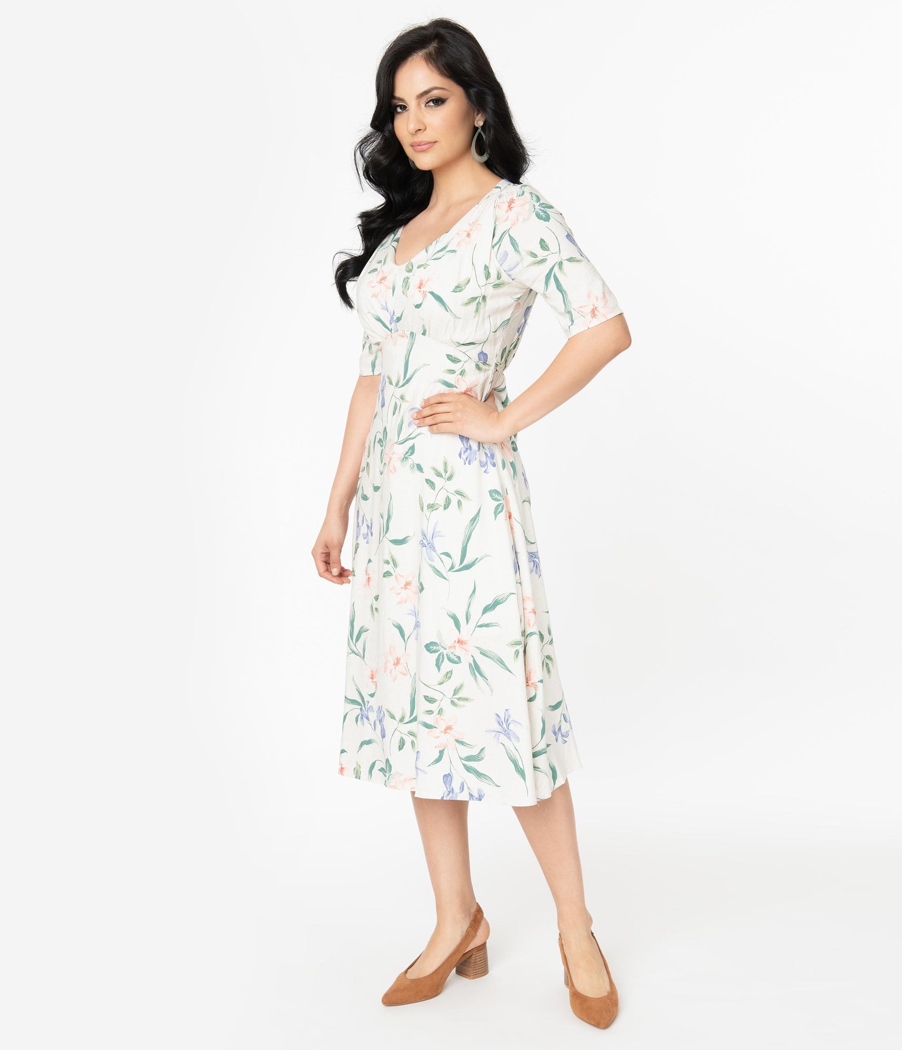 A retro dream, darling! This 1940s style linen dress is cast in a soft ivory color sprinkled with elegant purple, green, and pink florals. A cinched in waist and shirring at the shoulders adds to the delicate feminine shape. A longer style short sleeve adds something new to this classic style. This fully lined frock will make for the perfect piece to twirl around at any spring event.
