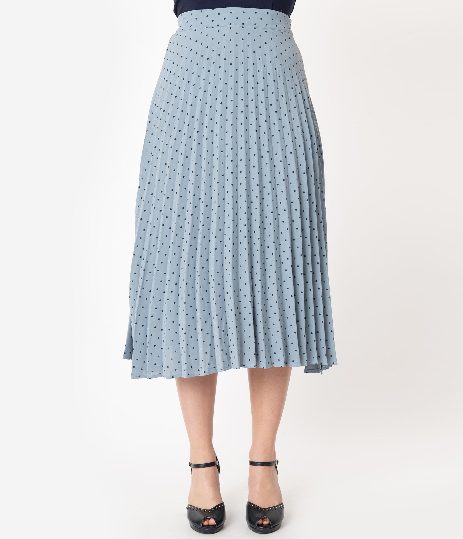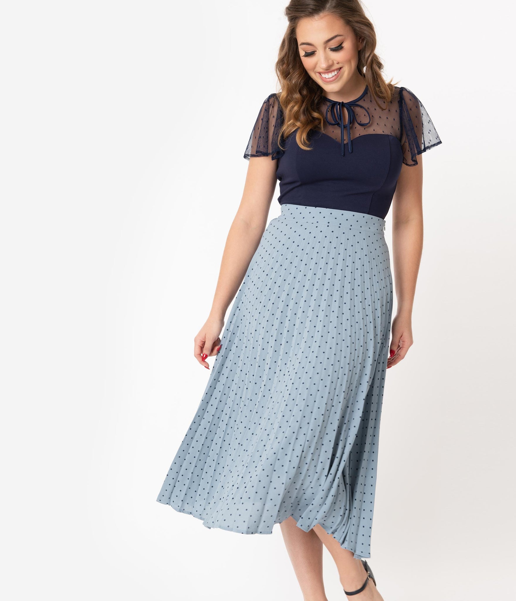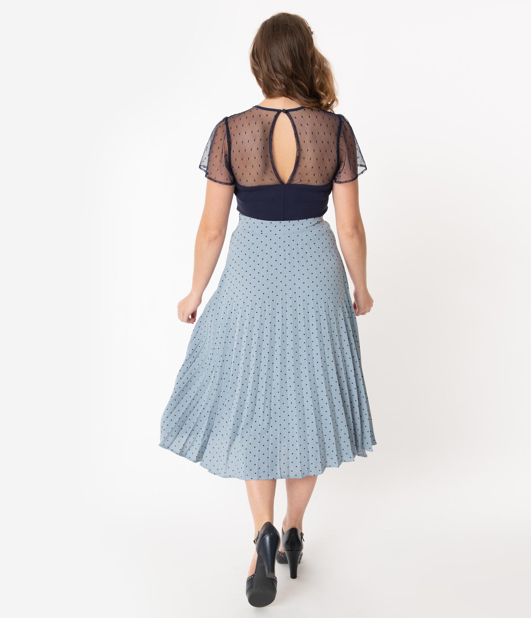 1940s Style Light Blue & Navy Polka Dot Pleated Skirt