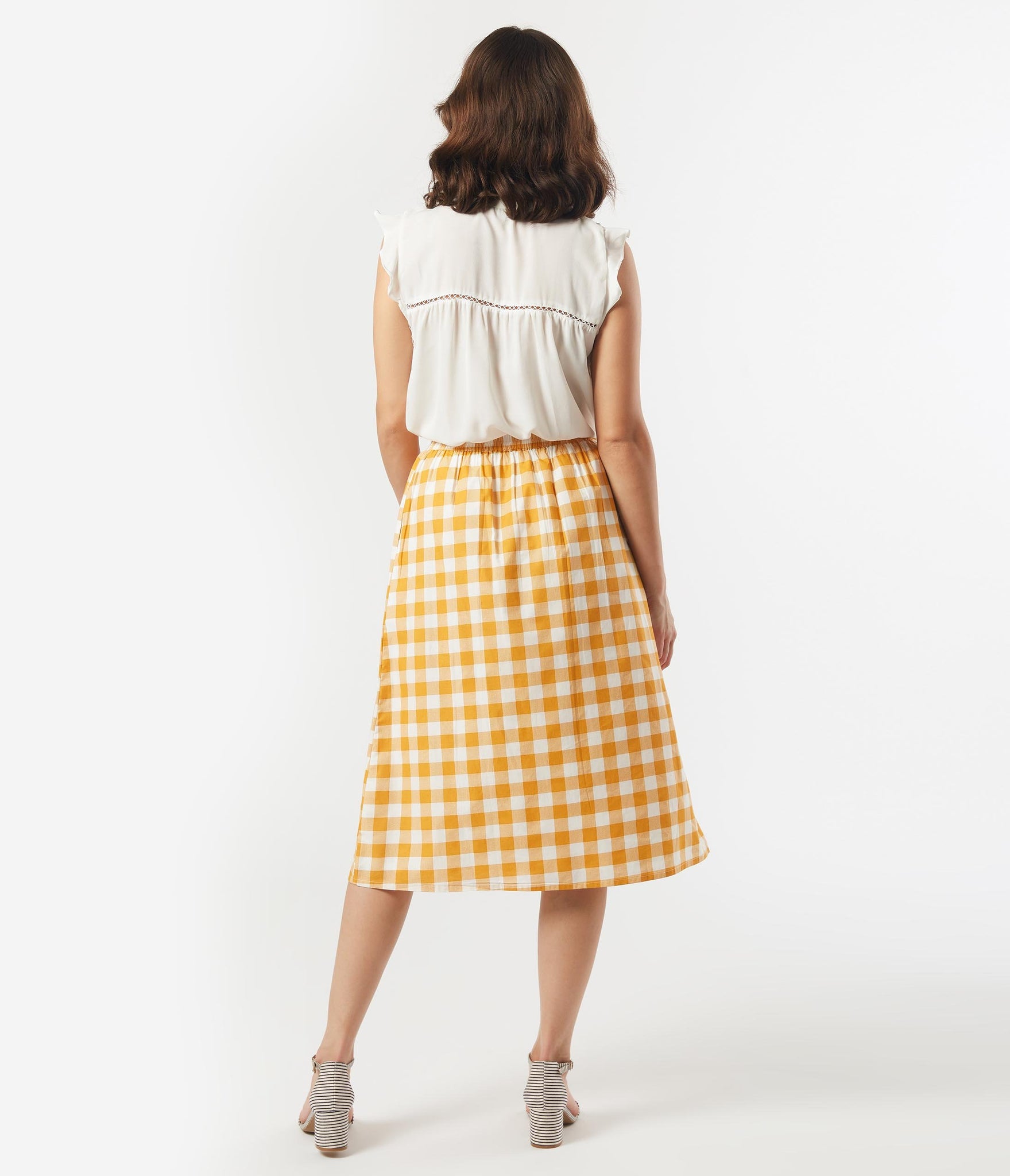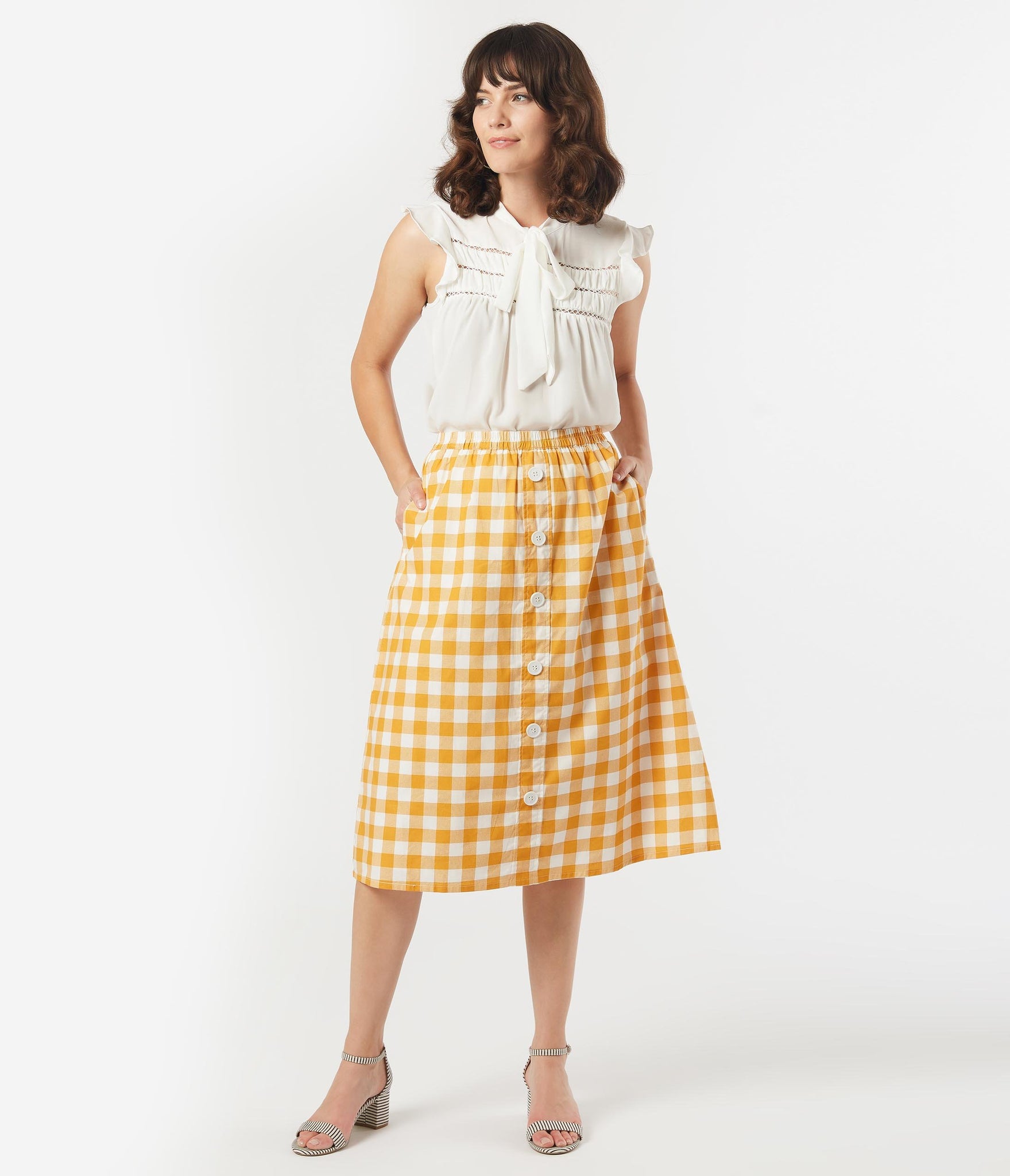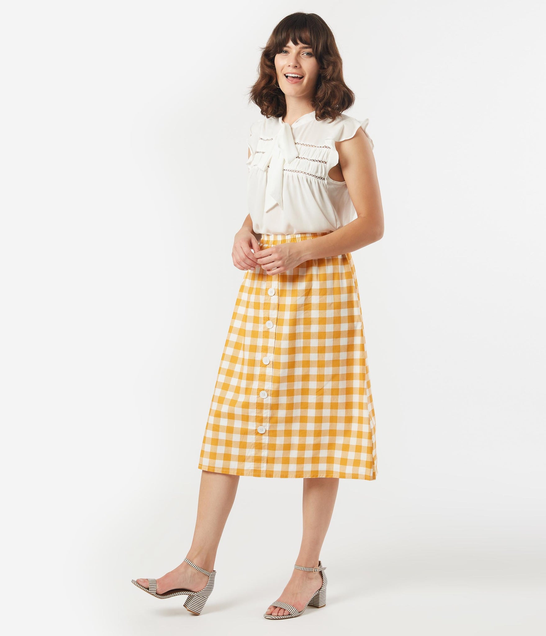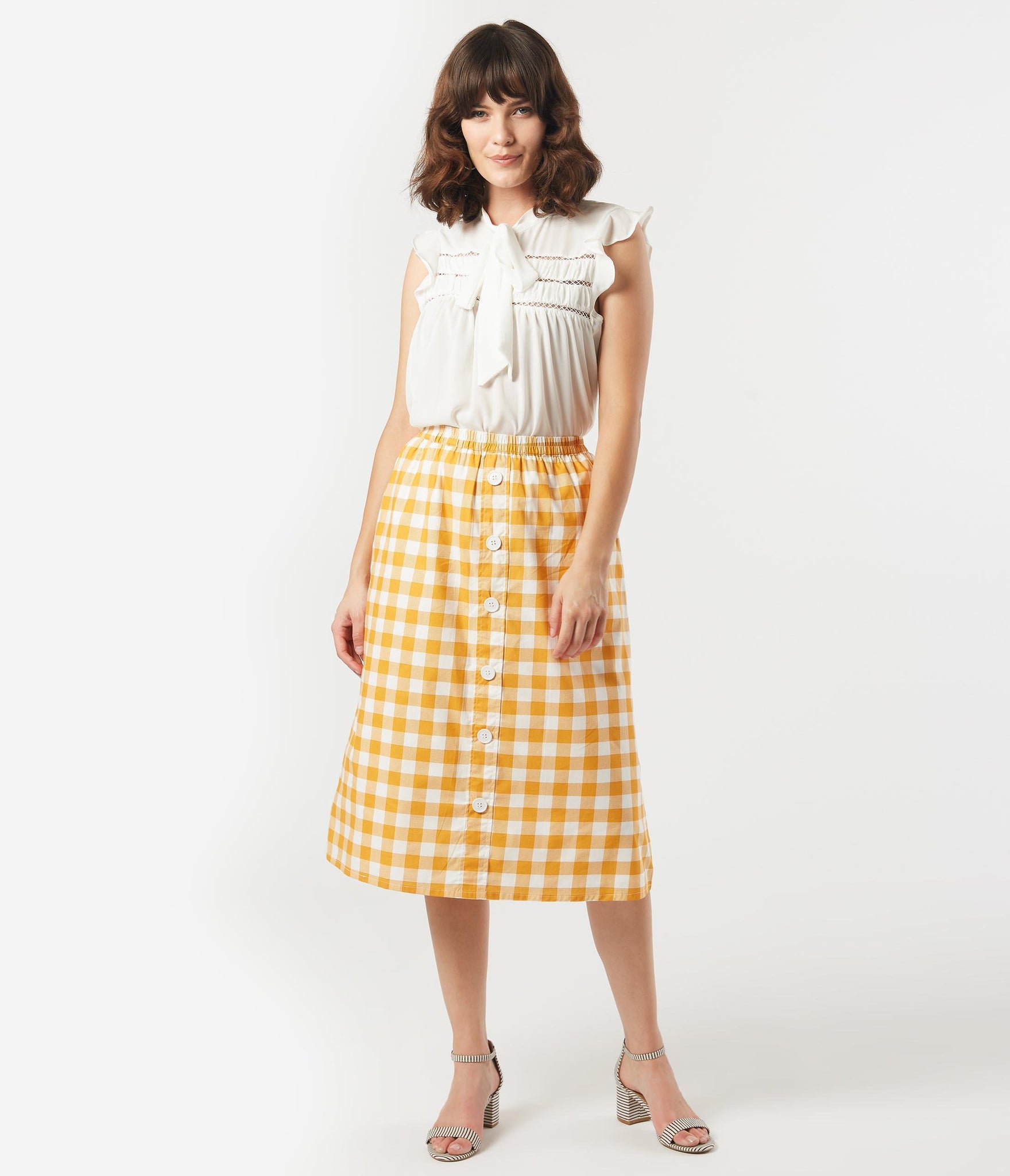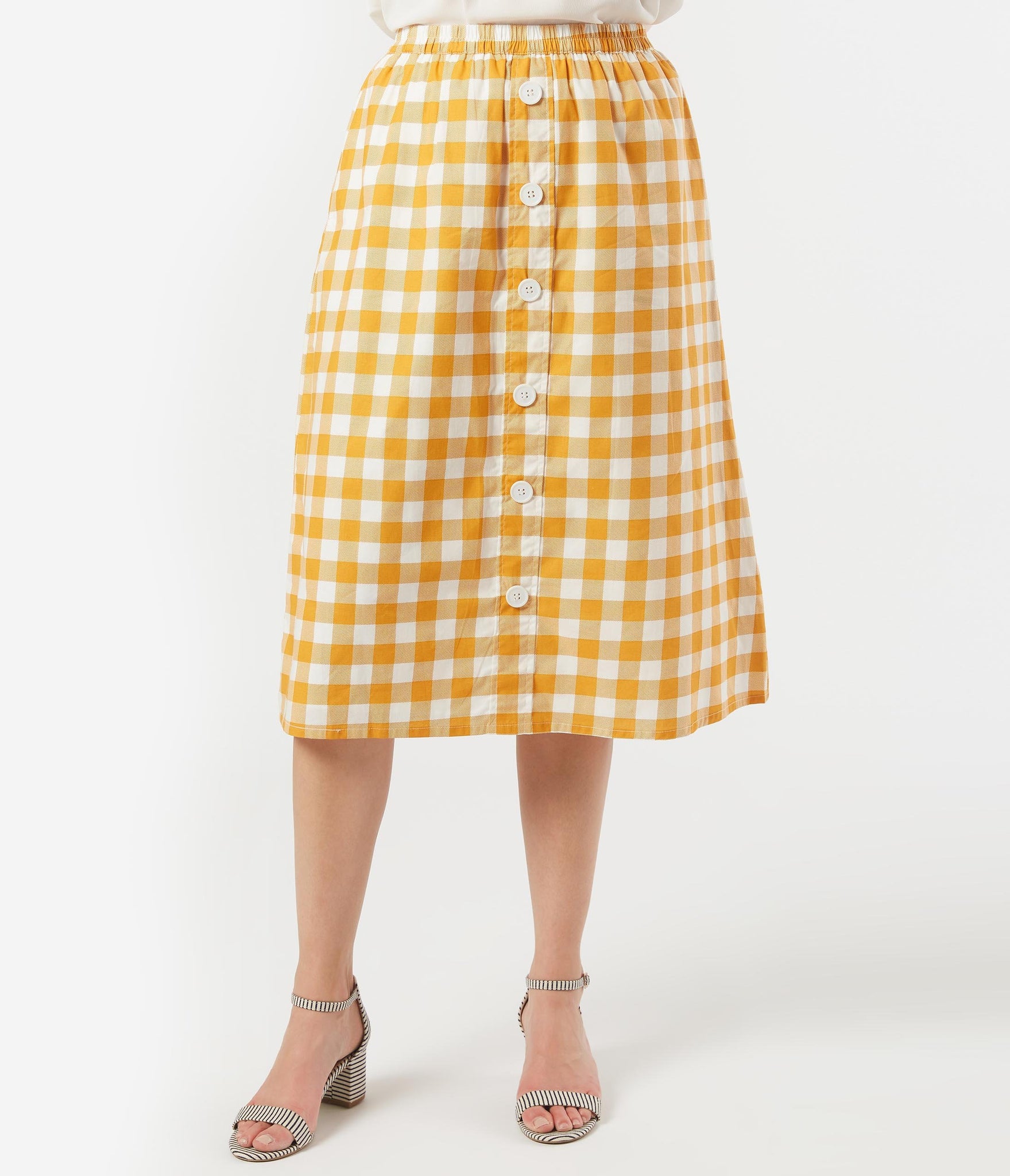 Planning a picnic, darling? Pair this charming skirt with your outdoor dining for a rockabilly scene! The elastic waist cinches to your form while the gorgeous mustard yellow and ivory white gingham lends eye-catching embellishment. Accented with darling faux buttons on the front and outfitted with side pockets!