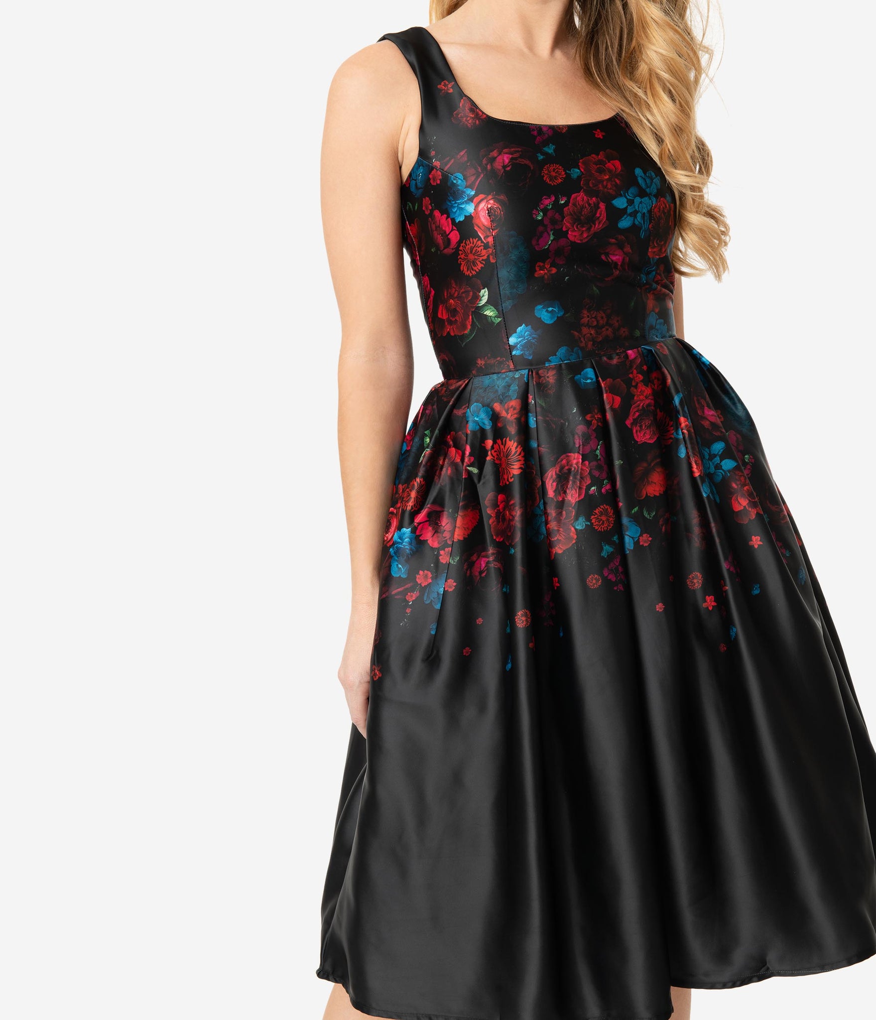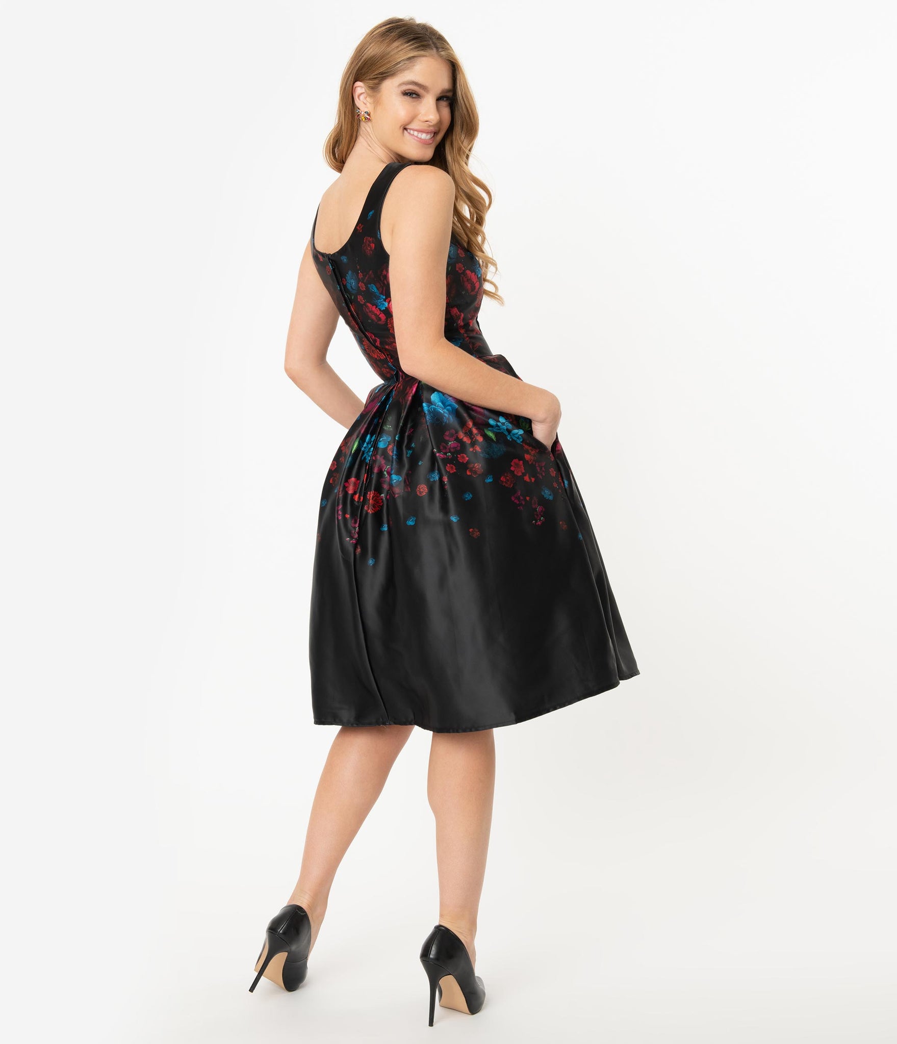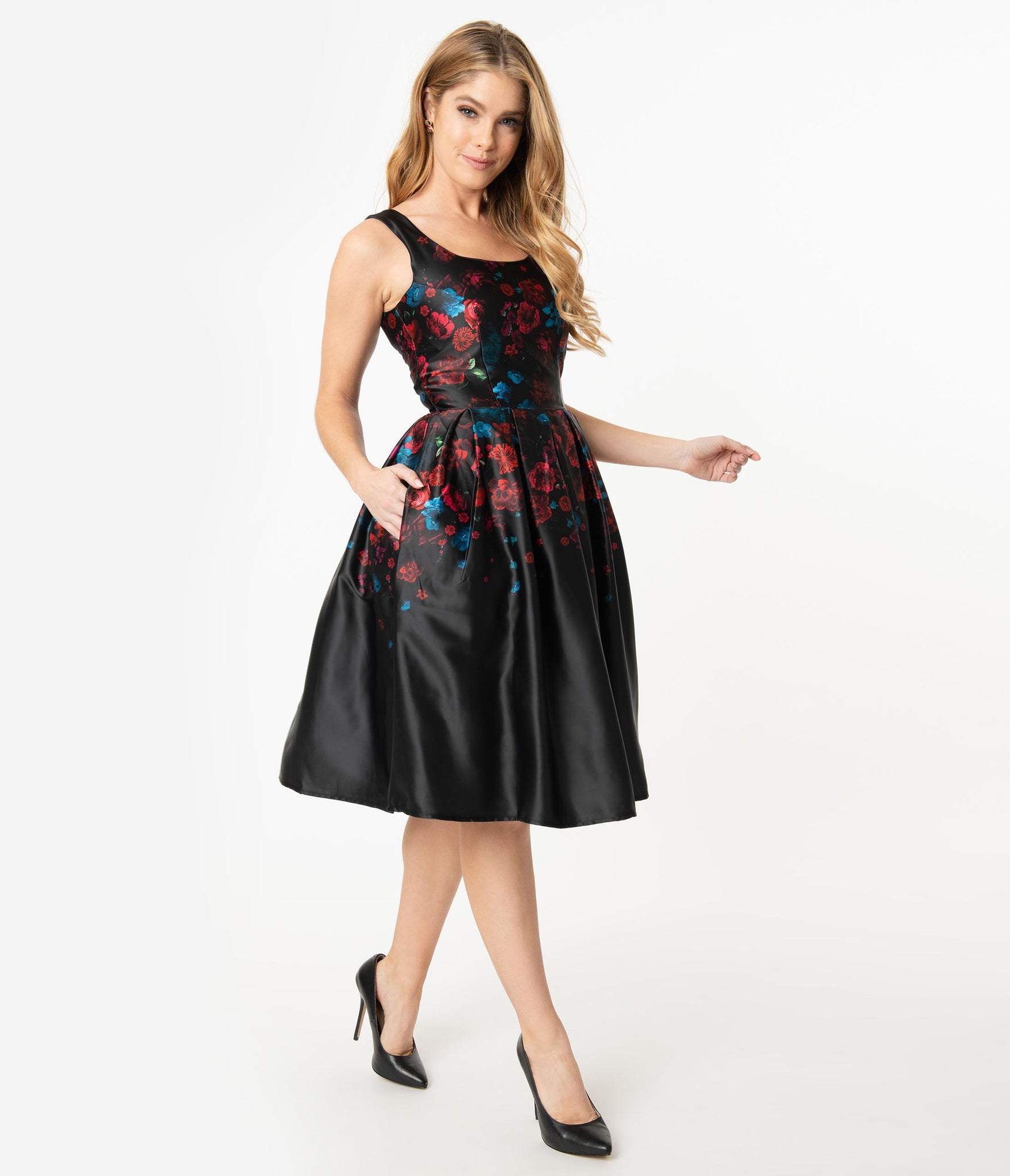 Get their hearts pumping, darling! This perfectly elegant black dress is a stunning pin-up 1950s inspired piece with a flurry of dark florals in red, blue, and purple, crafted in a marvelous satin-like blend. Featuring a darted bodice with a sleeveless silhouette framing the lovely scoop neckline, the seamed waist nips in your flawless hourglass as the swing skirt flares out in prim pleats. The side pockets and back zipper provide modern function to this mid-century frock, Amanda has become our go-to favorite!