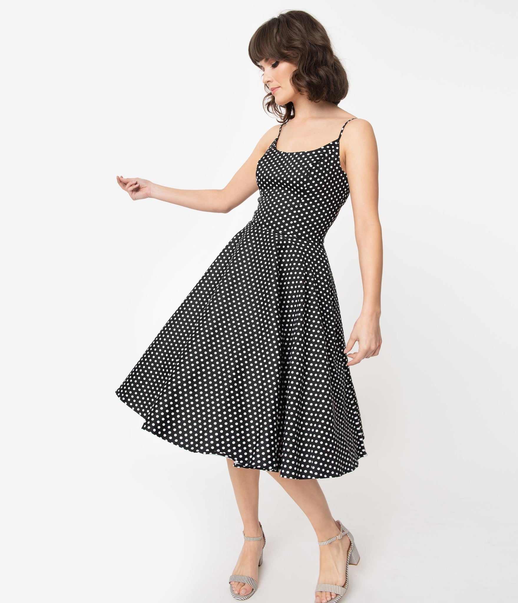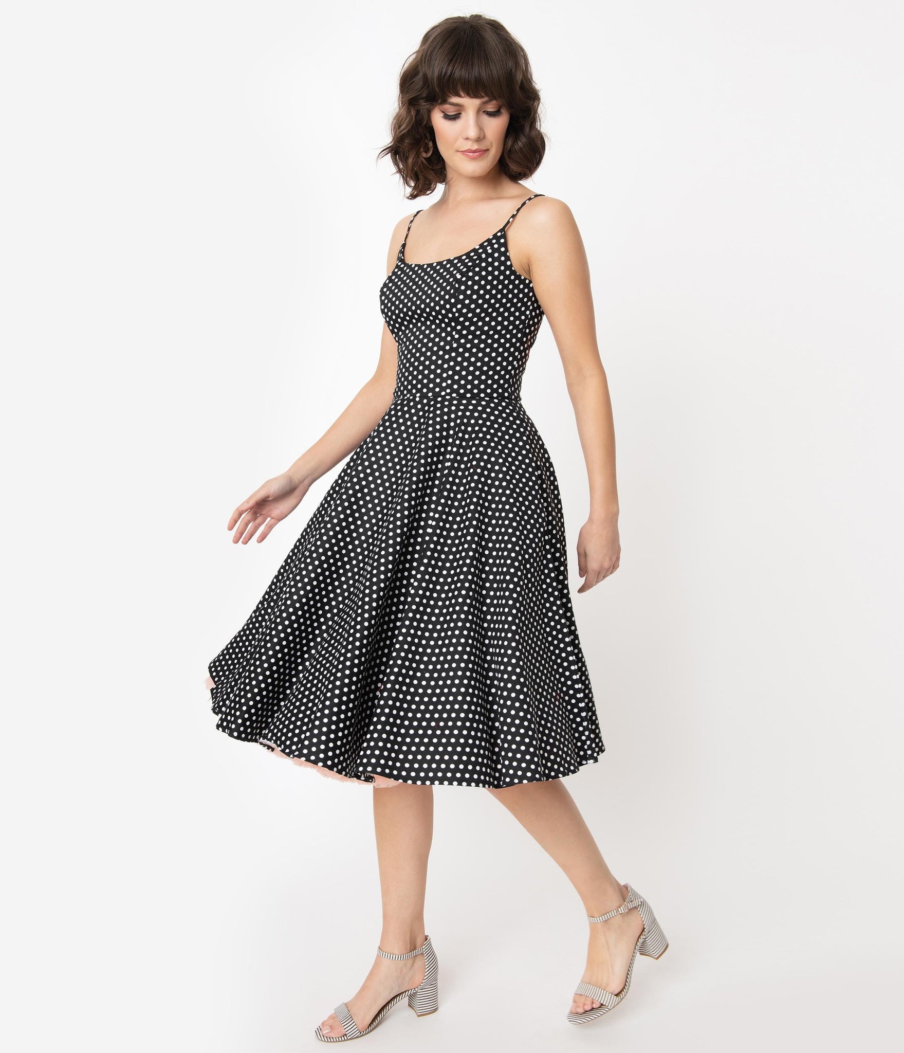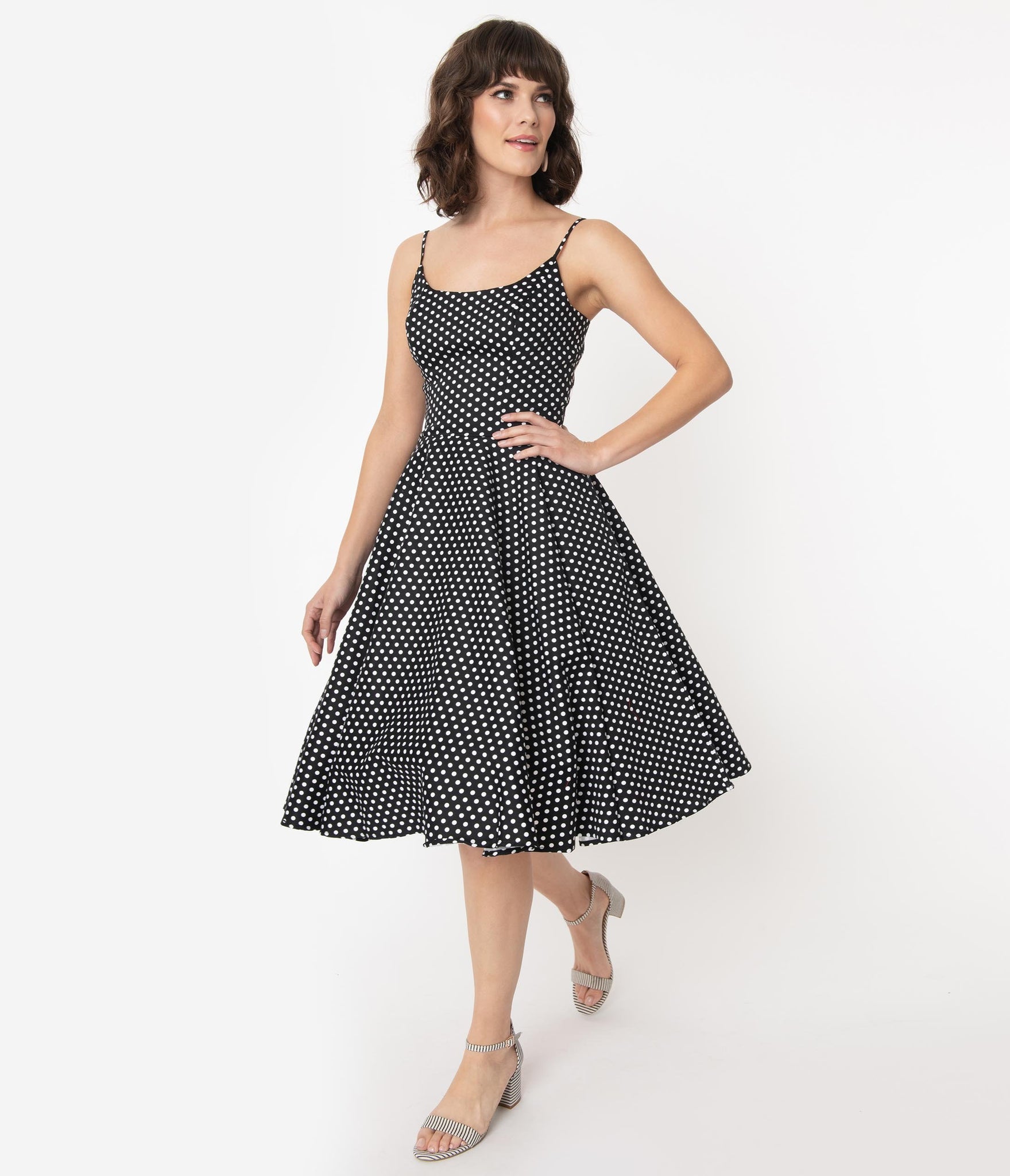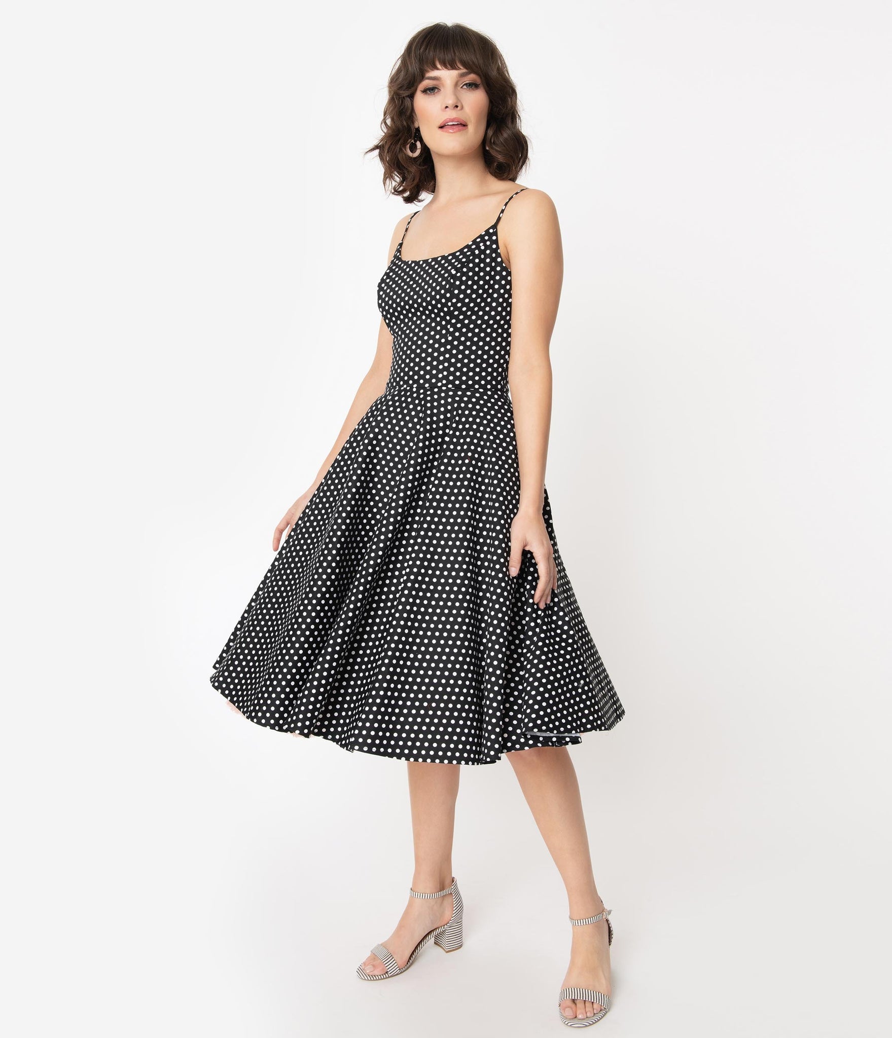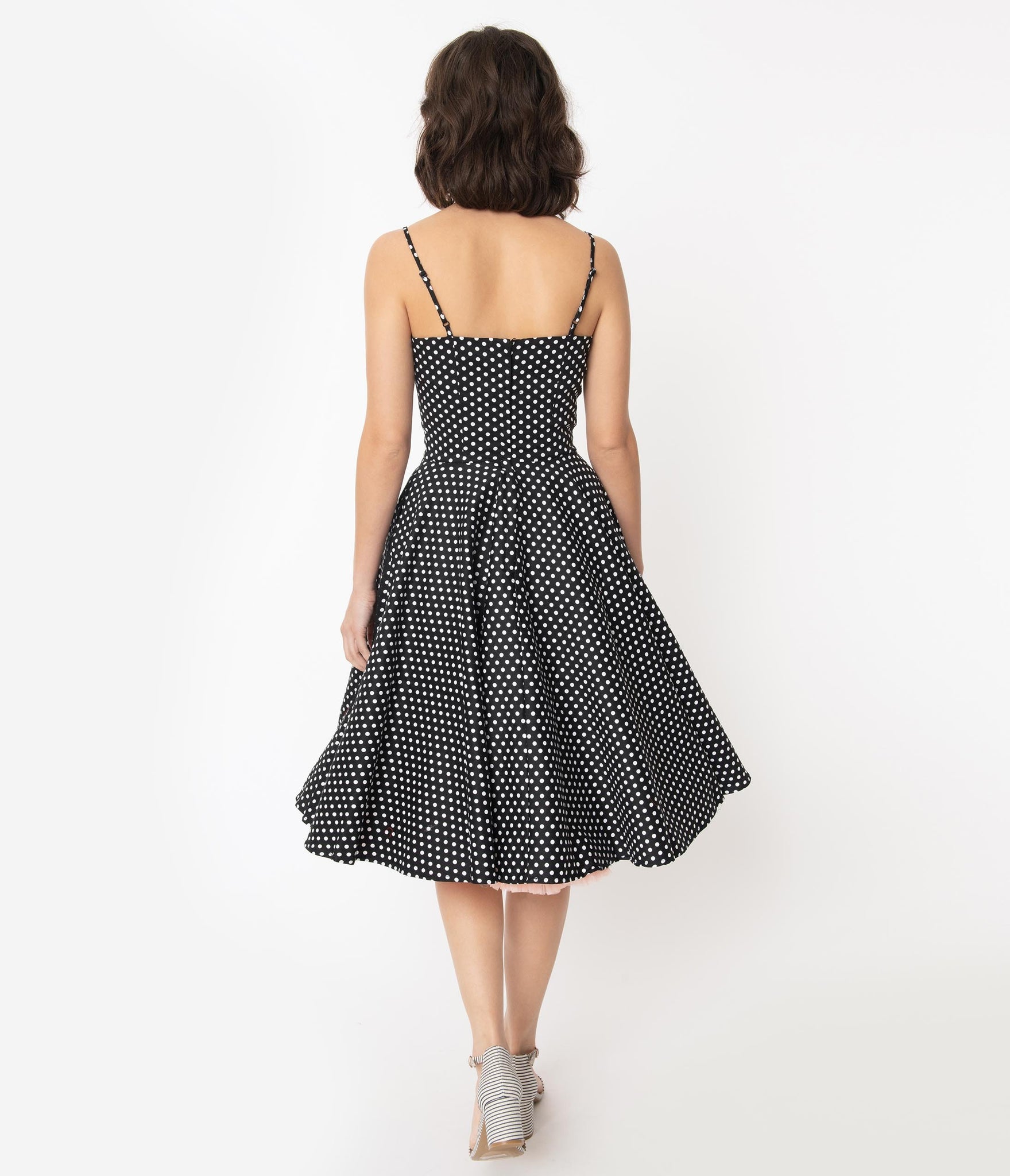 Bring them to their knees, dames! An adorably retro piece from Tatyana, the Peggy Dress is crafted in a sensational cotton blend, making it a standard frock in every vintage lover’s wardrobe. Cast in a bewitching black that dances with white polka dots, this darling 1950s silhouette boasts a princess seamed bodice, secured by adjustable spaghetti straps that provide a fabulous fit to your feminine form. The seamed waist centers and cinches your figure for flattering shape while the dramatic swing skirt cascades to the knees, complete with side pockets for fantastic function. Outfitted with a back zipper, it’s all about frolicking fun!