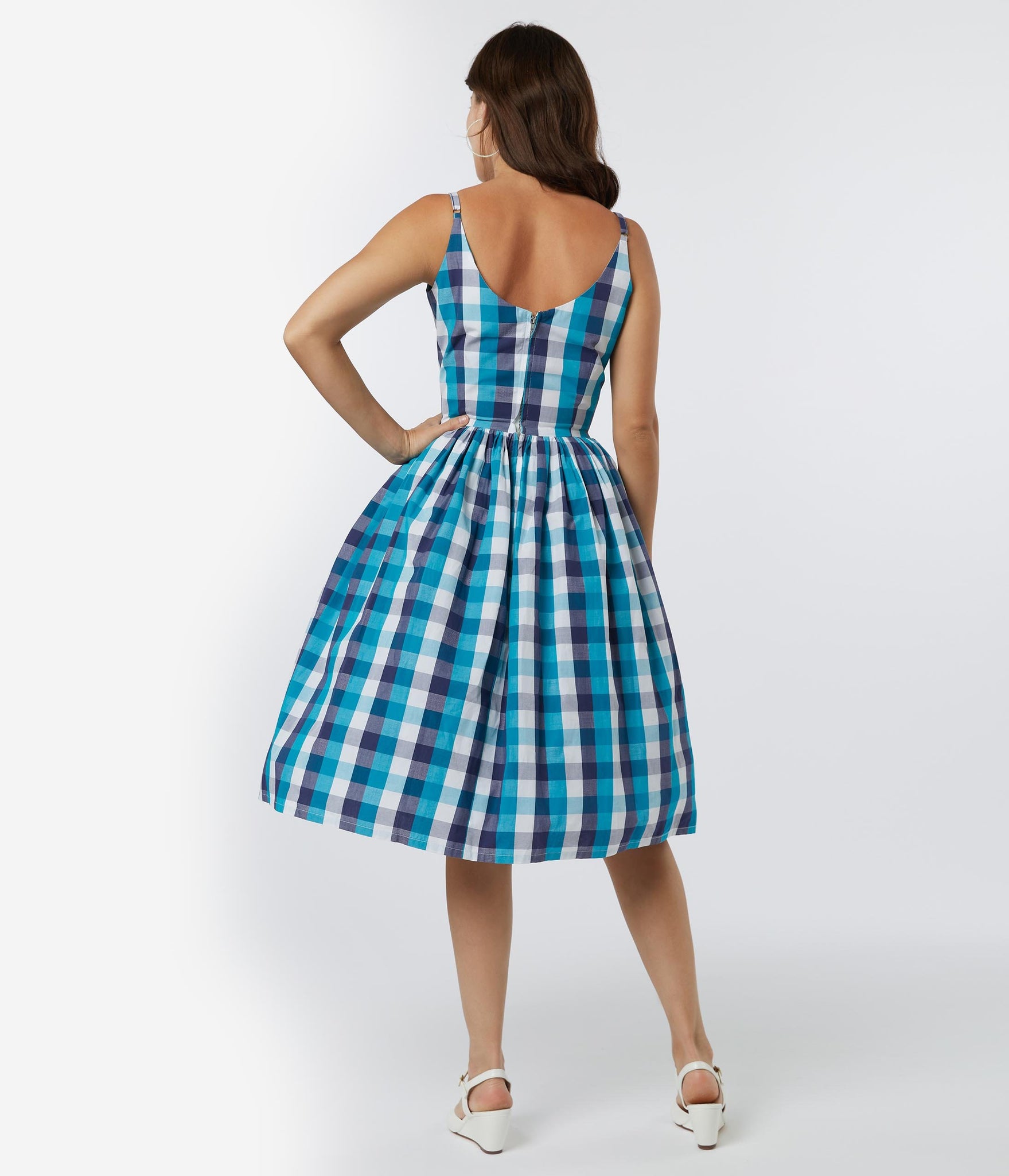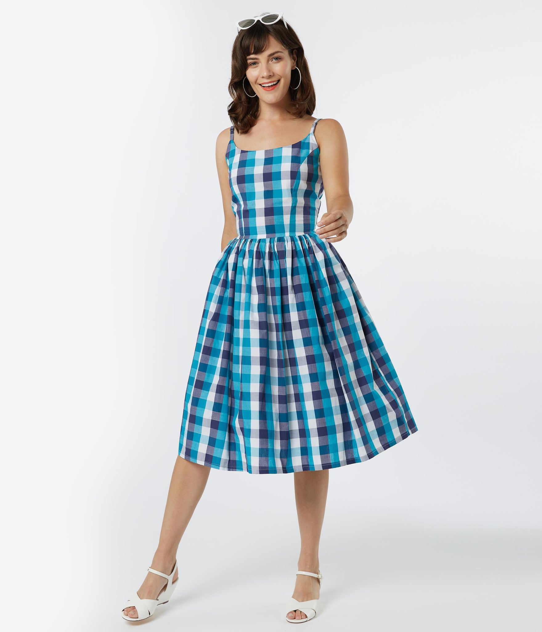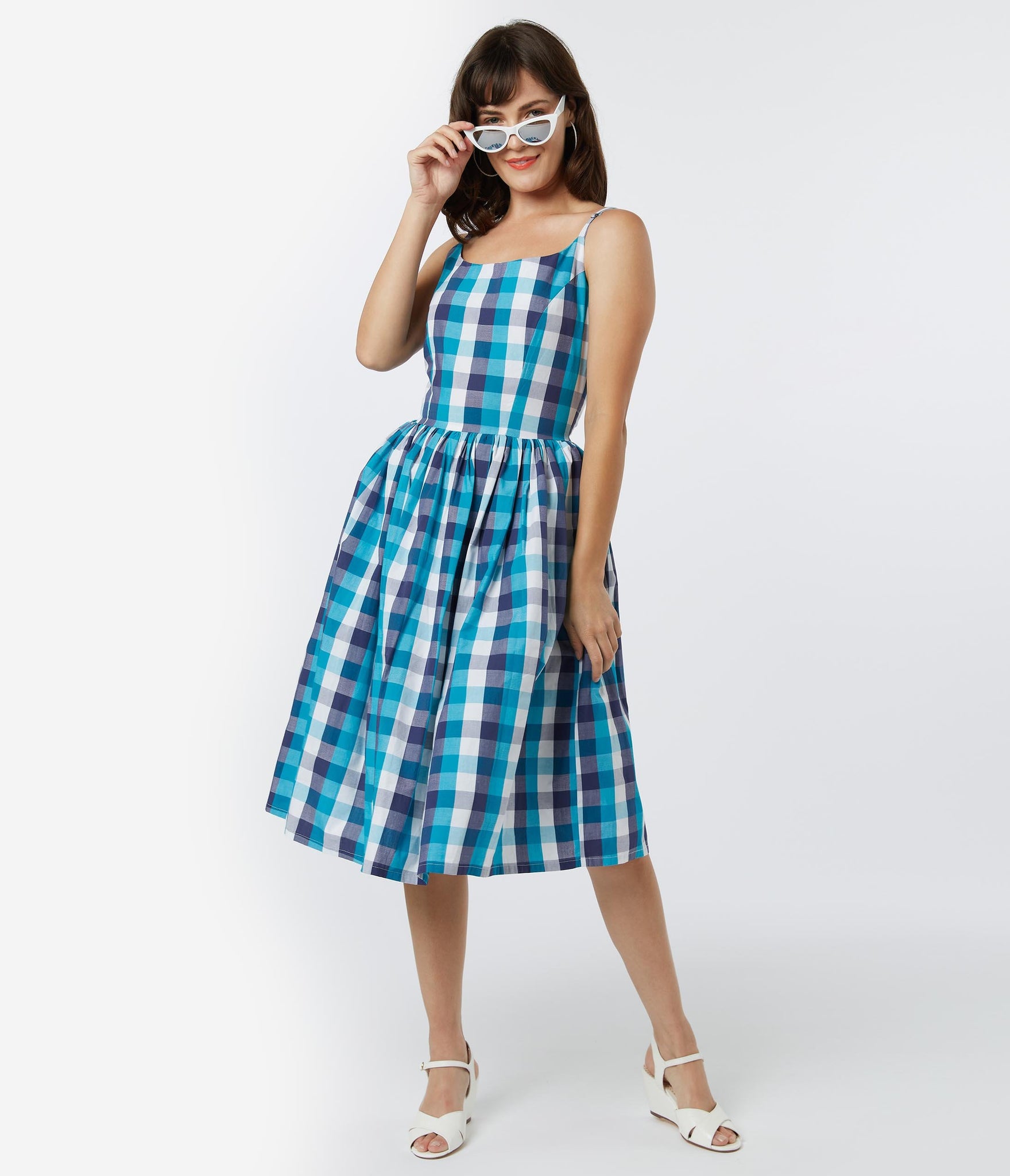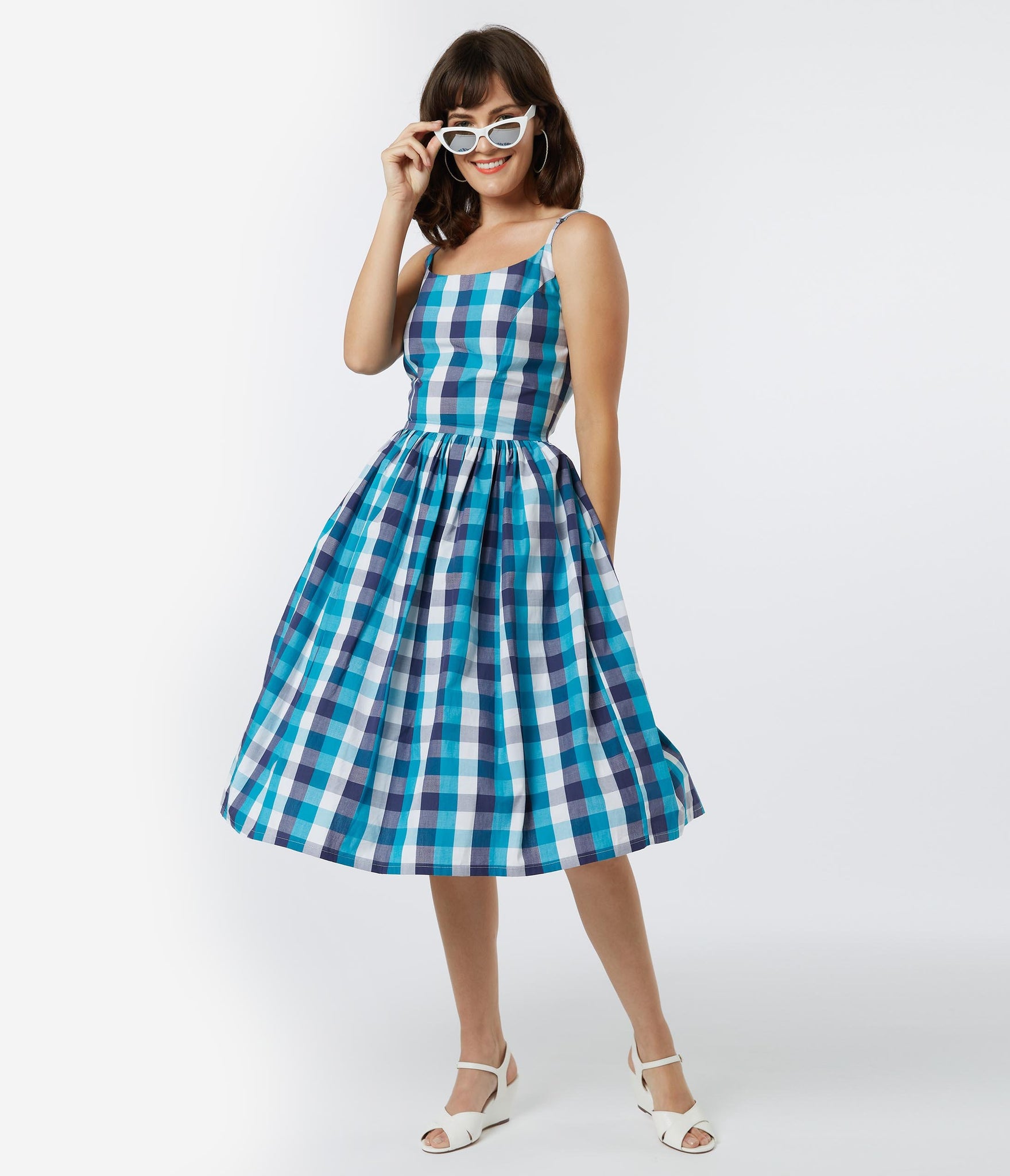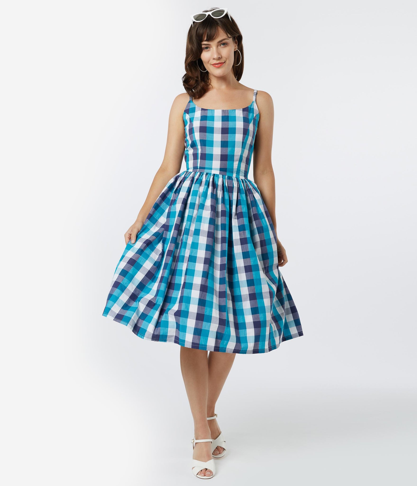Sweep them into your arms, doll! An adorably retro piece from Tatyana, the Sandra Dress is crafted in a sensational cotton blend that dazzles with a gorges blue plaid pattern throughout. A dream for every vintage lover’s wardrobe, this 1950s style silhouette features princess seaming and adjustable spaghetti straps for a flattering fit. The gathered swing skirt cascade from a seamed waist, outfitted with side pockets and nipped in with a back zipper. It’s a rockabilly dream come true!