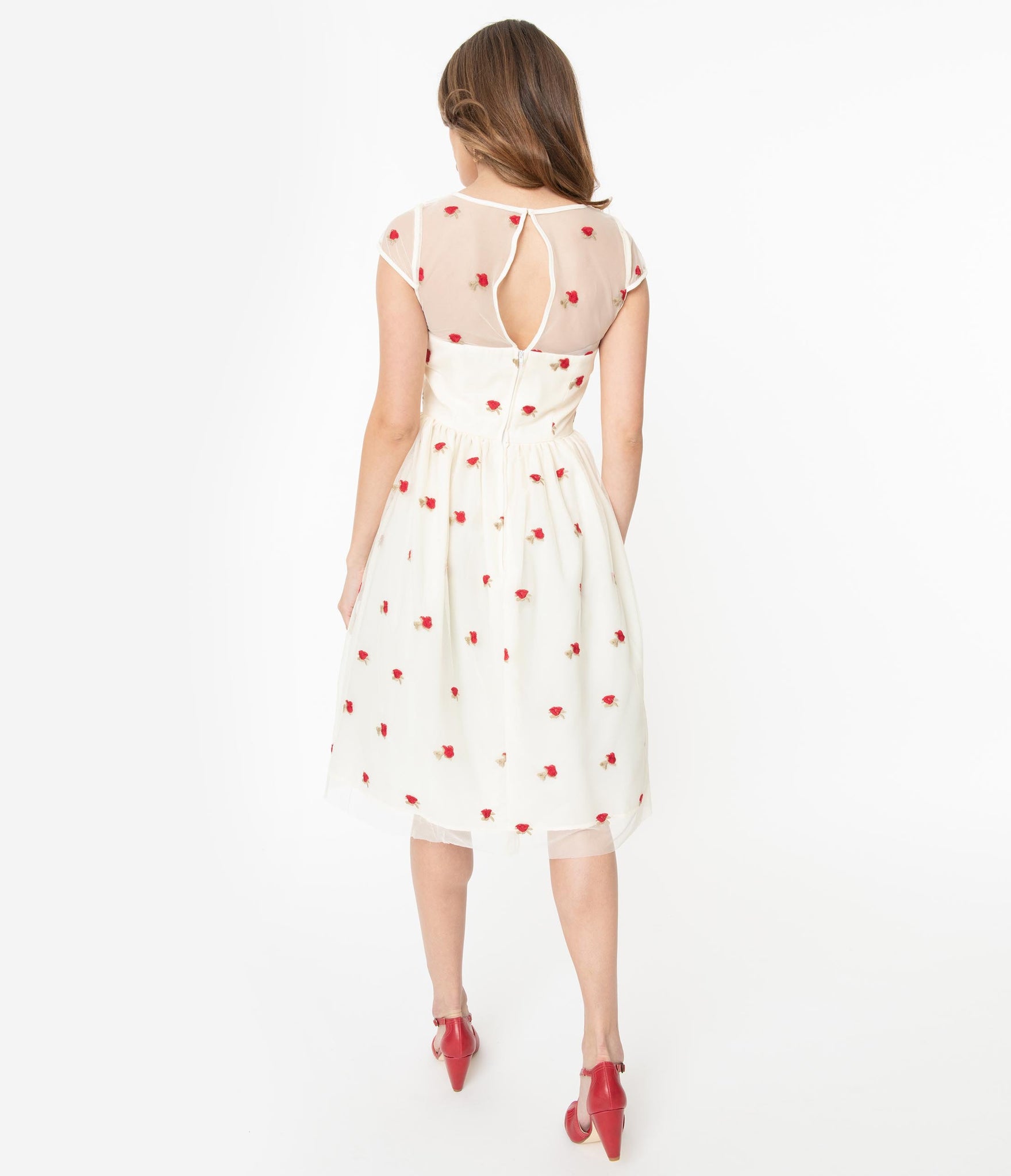 Alright spring, do you thing! This ethereal sight is a breathtaking piece in mid-century styling, crafted in a lightweight cream tulle that dances with red rose embroidered florals throughout. The sweetheart bodice features a charming illusion neckline that secures in the back with a hook eye keyhole while cap sleeves flatter your figure. The seamed waist is cinched with a back zipper while the gathered swing skirt cascades over a cream lining. Breath new life into your wardrobe!