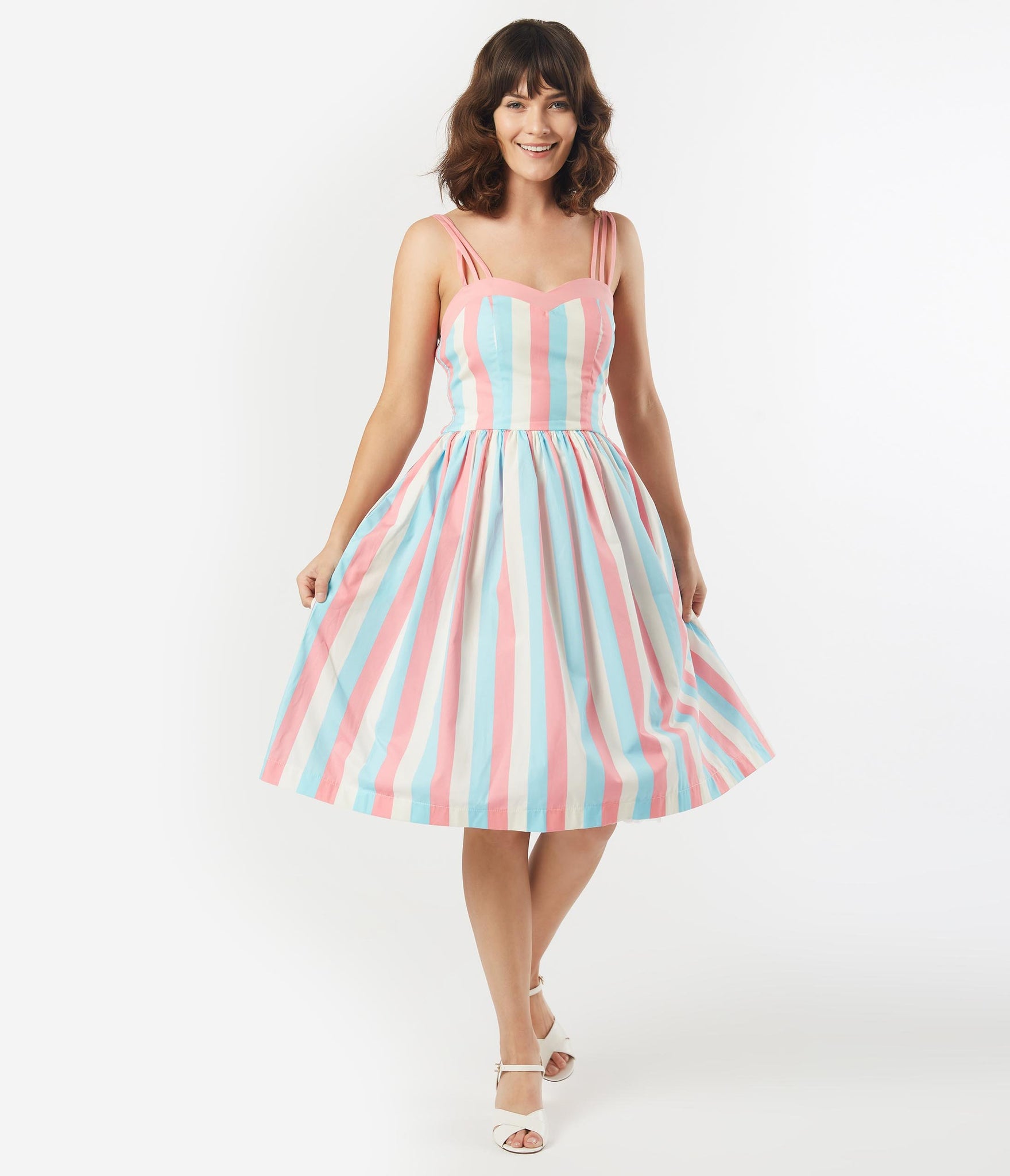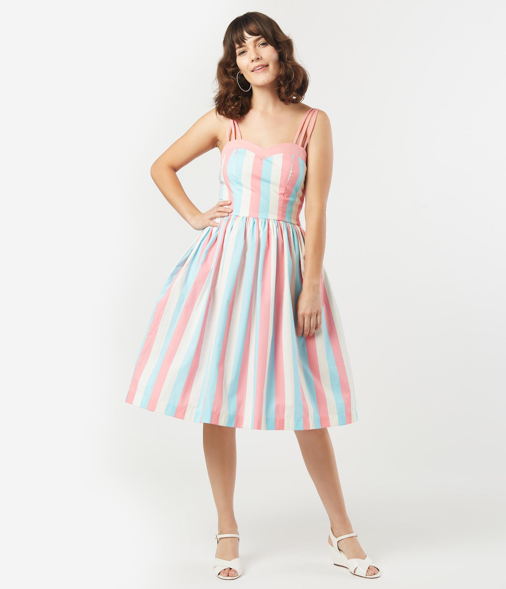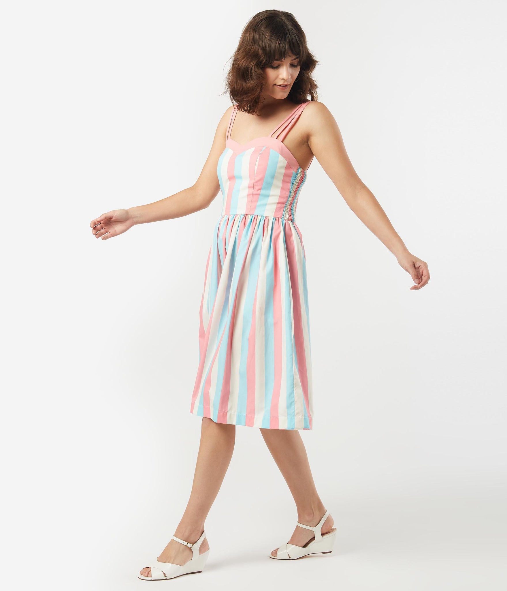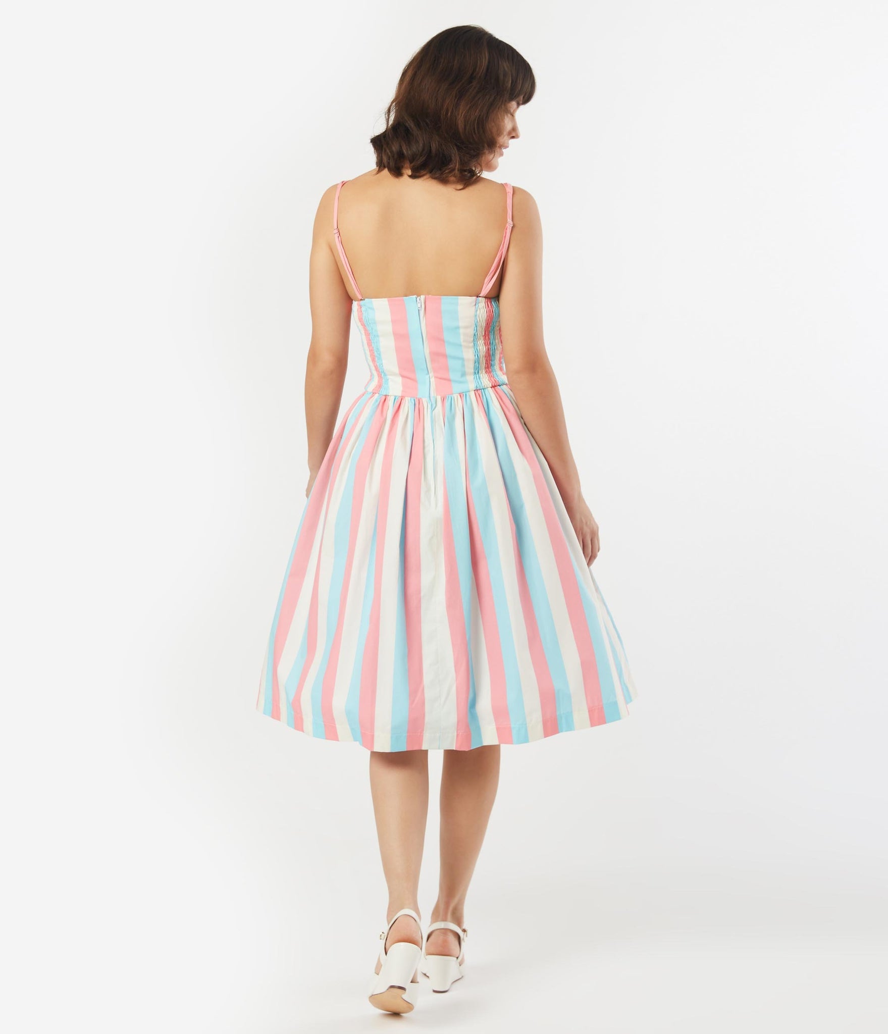 Retro stripes, darling! A sweet mid-century style frock, this adorable silhouette is crafted in lightweight cotton with a sensational pattern of pink, blue, and ivory stripes throughout. The princess seamed bodice is secured with adjustable spaghetti straps and crafted with smocked side panels for a flattering fit while the sweetheart neckline is highlighted in pink. The seamed waist tops a sweeping swing skirt, outfitted with side pockets for modern fun as the back zipper cinches in your figure!