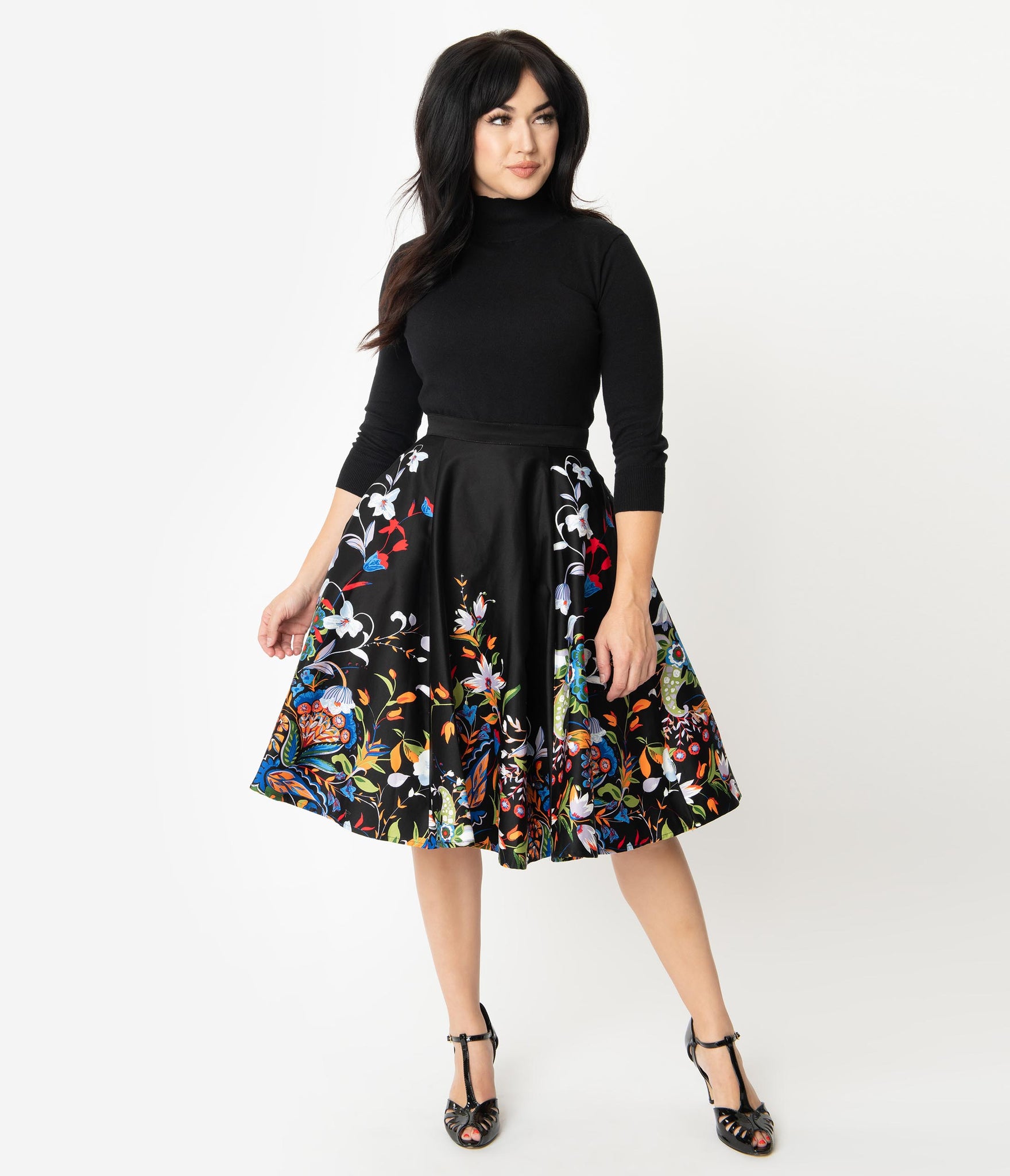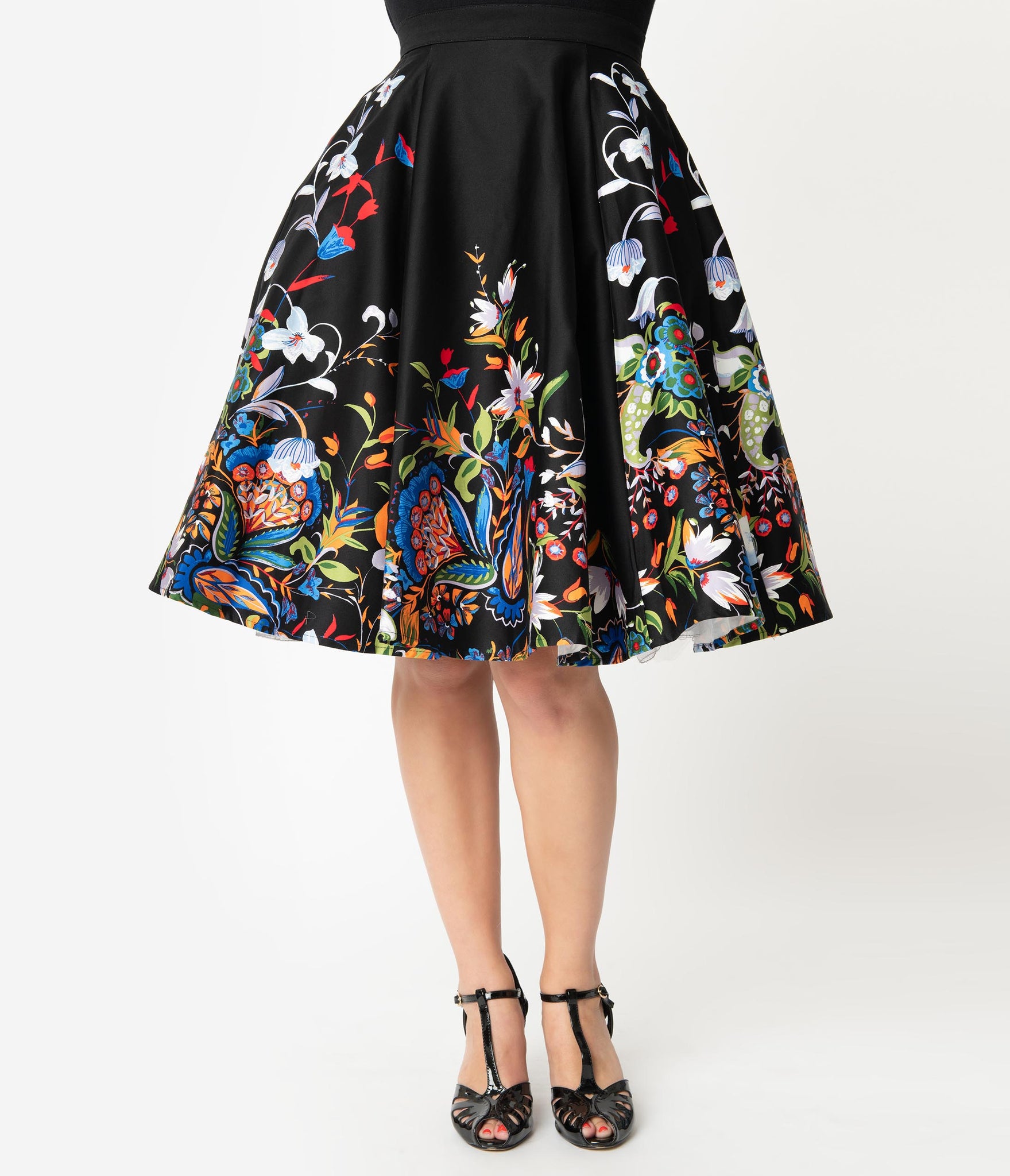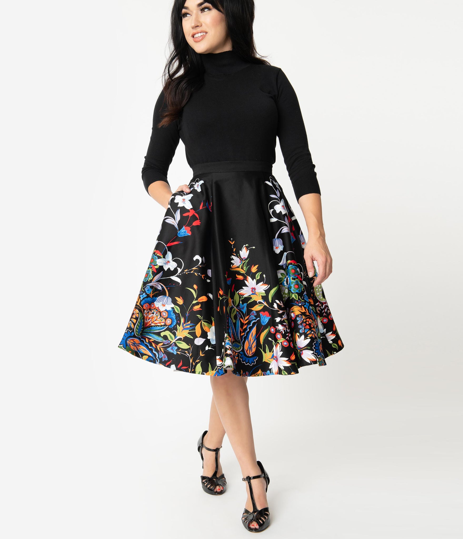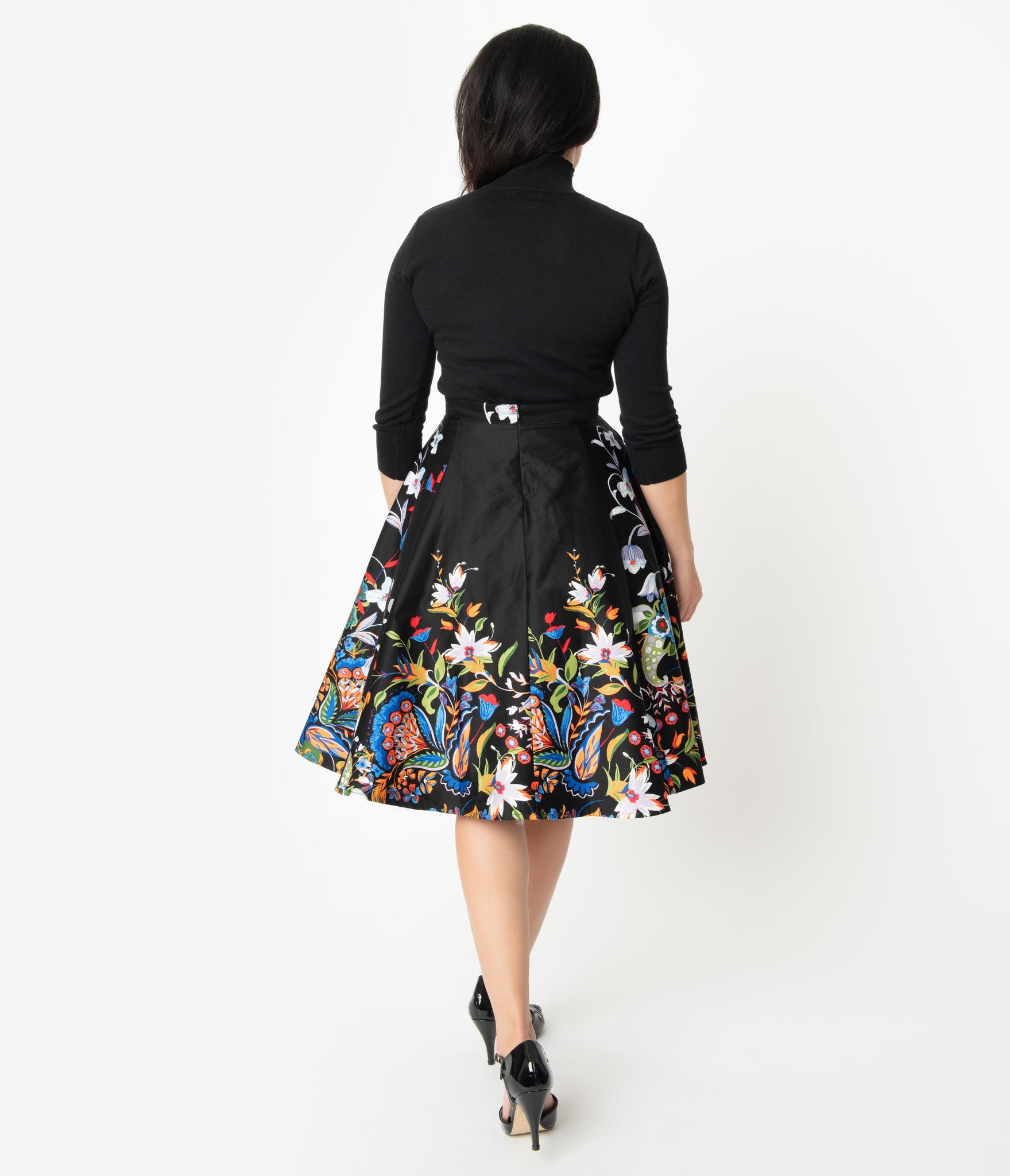 A tribute to femininity, darling! An enchanting separate that shows off your love for florals, this fabulous mid-century skirt is crafted in a gorgeous black cotton stretch and boasts a stunning print of multicolor florals browning along the border. The banded waistline is outfitted with a back zipper to cinch in your figure while hidden side pockets keep your essentials nearby. It’s mid-century perfection!