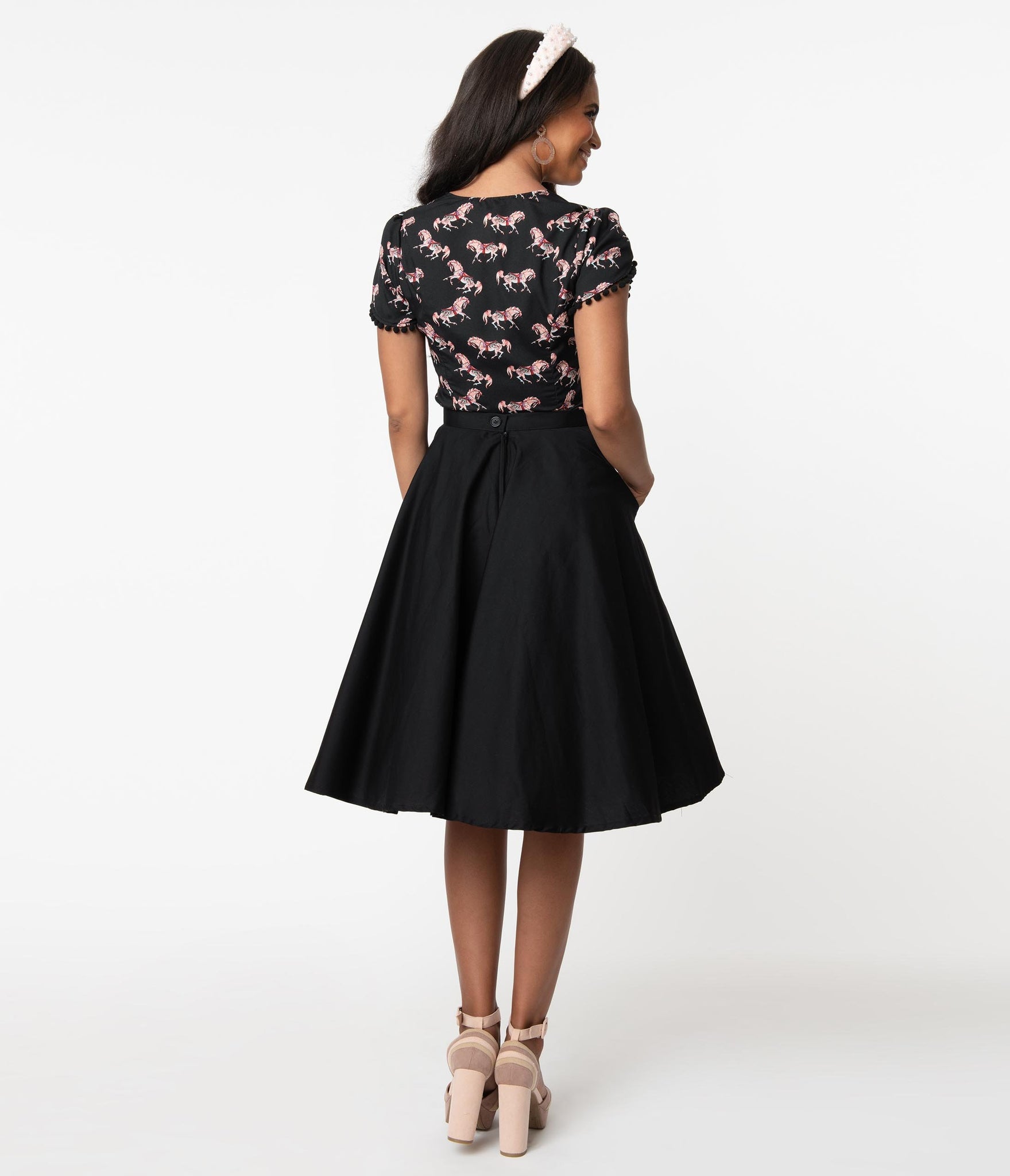A classic separate for a stylish dame! This fabulous swing skirt is designed to cinch at the waist and dance around the hips in an elegant black color. Crafted in a lightweight and sturdy woven fabric, this knee length piece can be worn with a crinoline for a little extra flare. Featuring two side pockets and a back zipper below a button closure, this skirt is an excellent addition to your 1950s style!