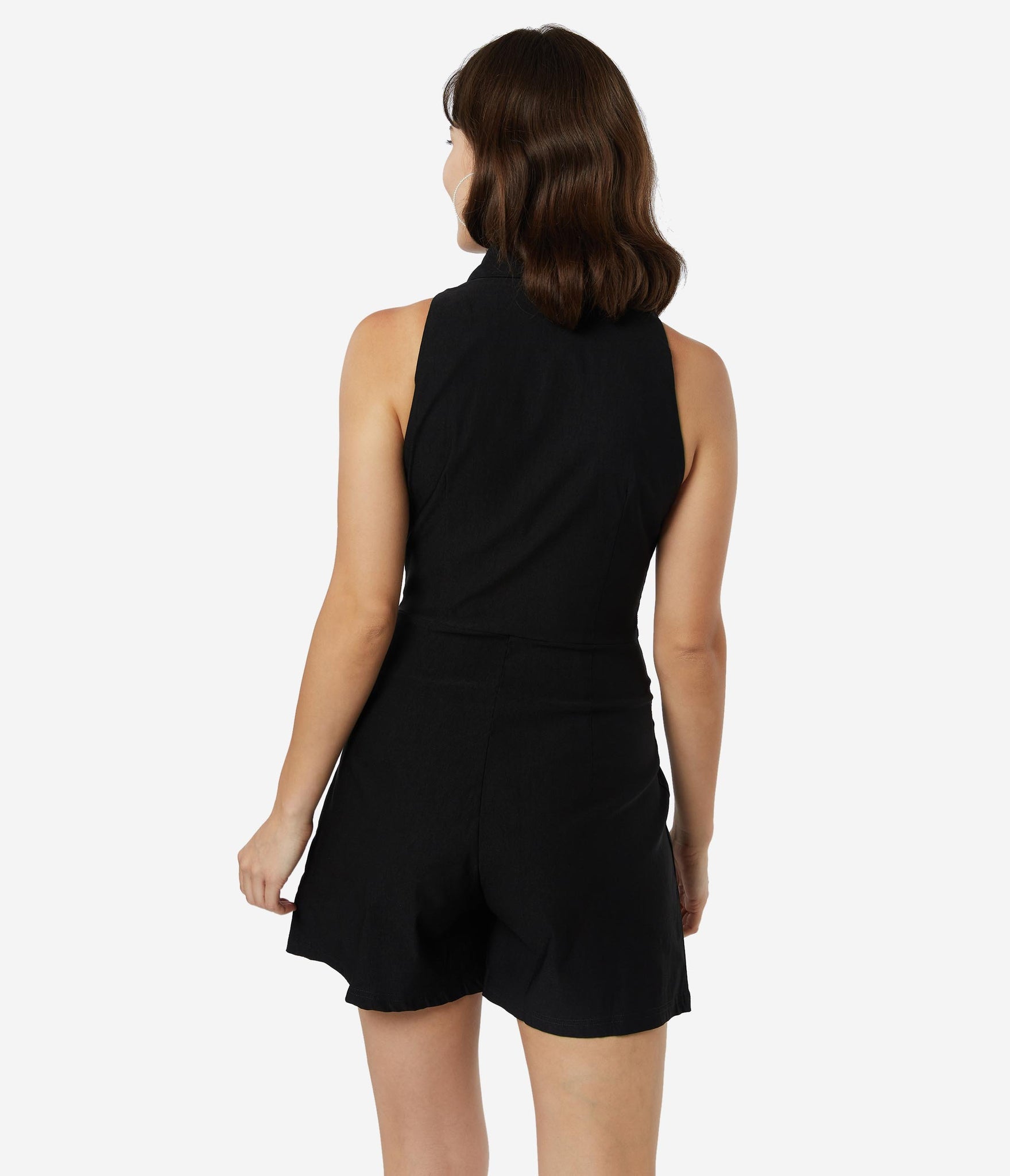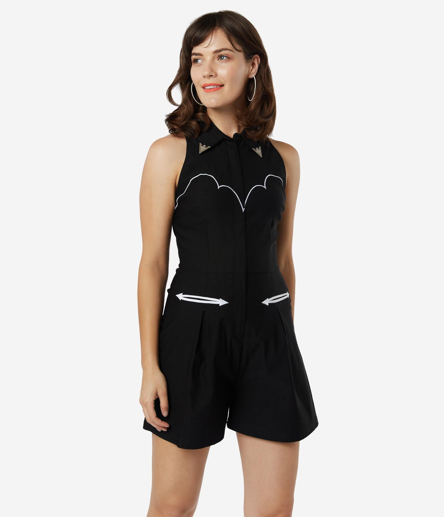 Howdy, dames! This western cutie features marvelous mid-century styling such as white contrast trim and a sweet pointed collar, accented with silver toned detailing. Crafted in a fabulous black stretch bengaline, the front zipper is framed by a sultry sleeveless silhouette while the subtle flared shorts keeps you comfortable throughout the day. Complete with front pockets for modern function!
