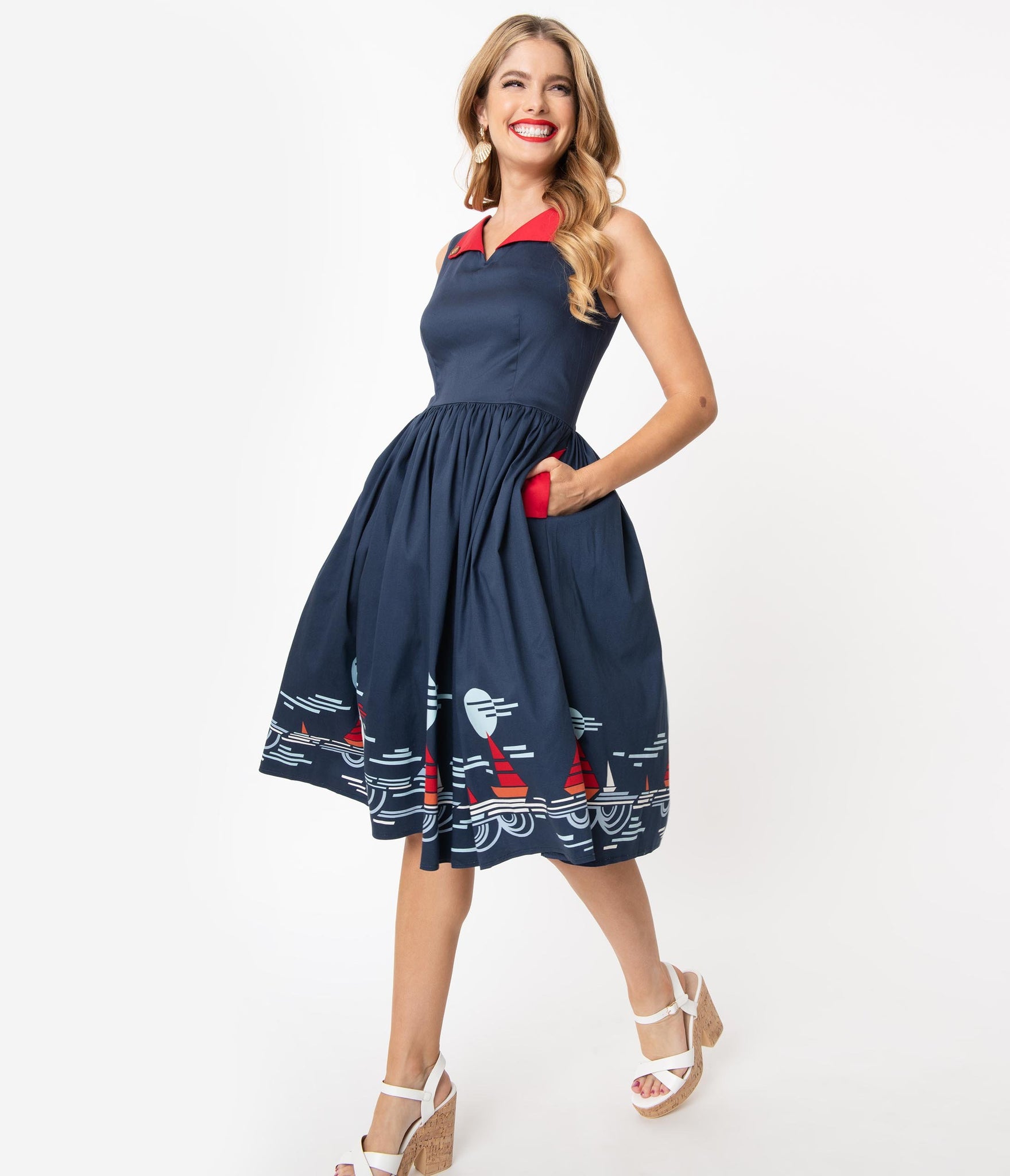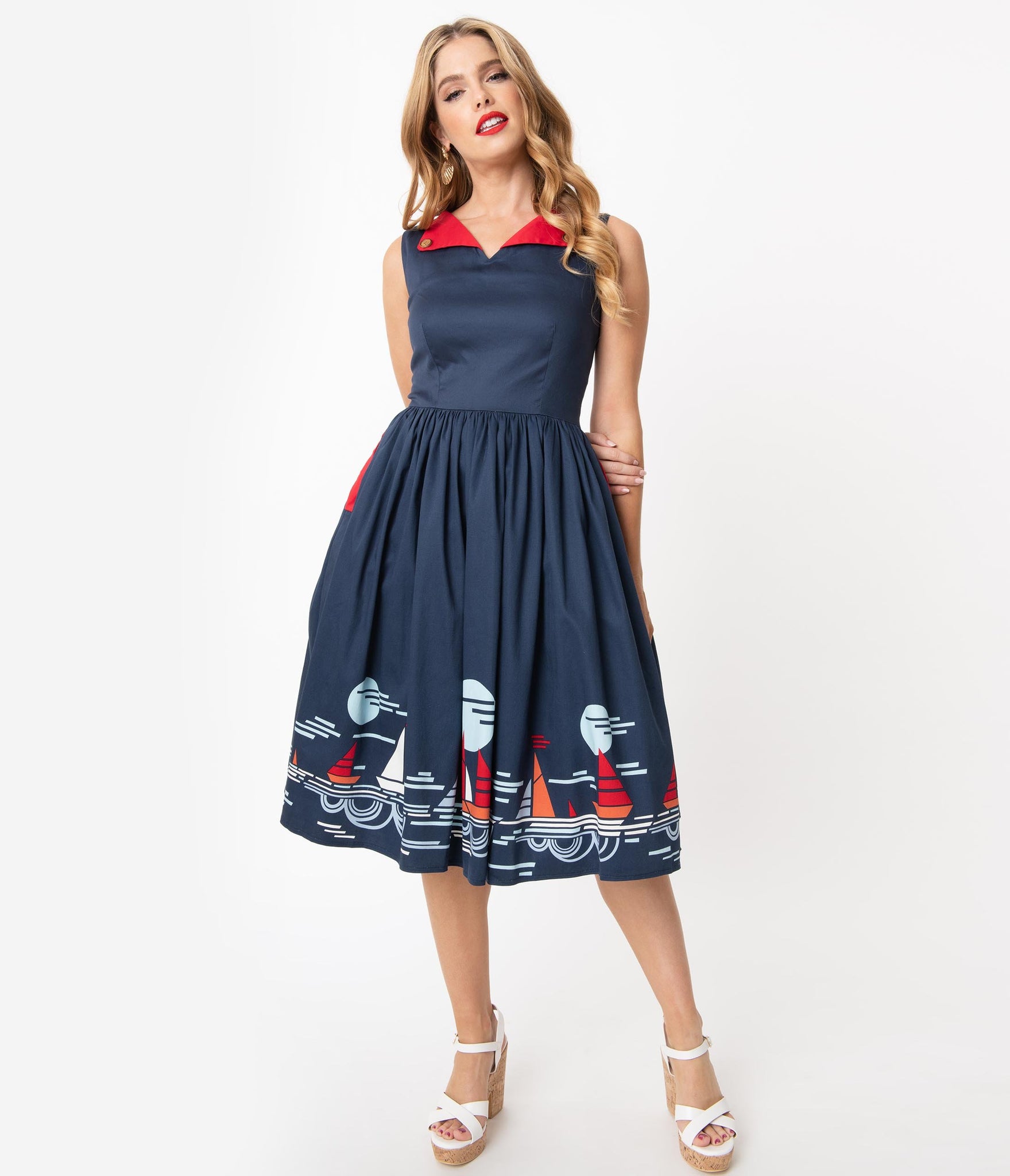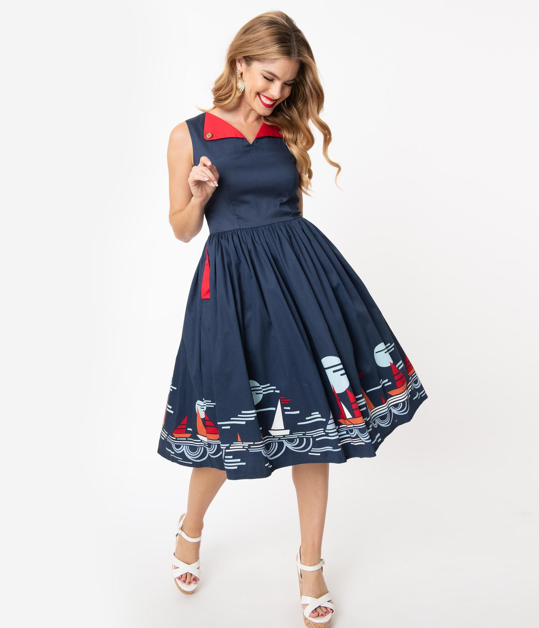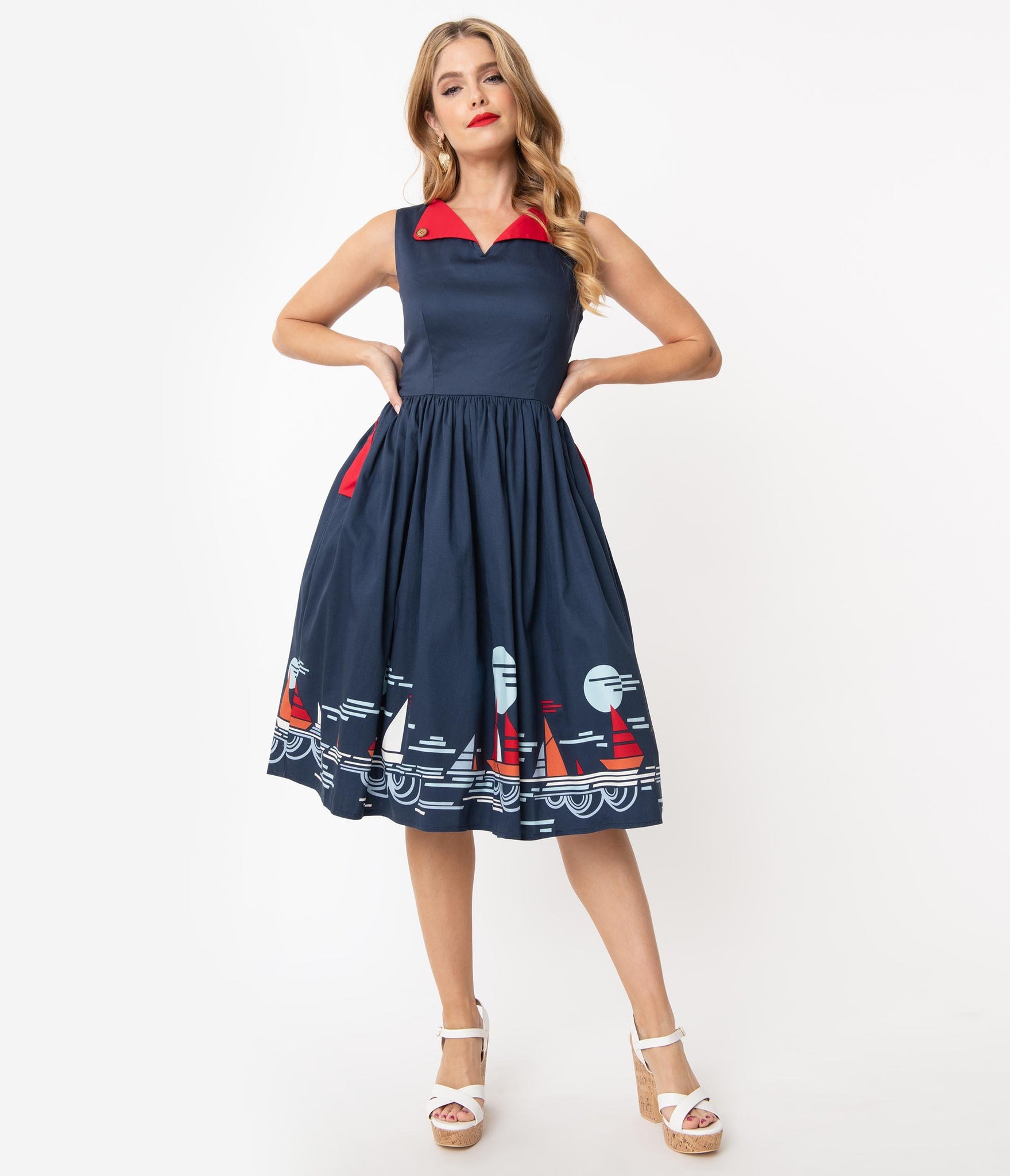 It’s smooth sailing from here, dolls! A marvelous vintage silhouette full of nautical love, this adorable cotton frock is cast in a gorgeous navy blue and features retro accents and a charming sailing scene along the border. The darted bodice features a modest V-neckline with a red lapel with faux buttons, while the sleeveless style is ready for warm breezes. The seamed waist in cinched in with a back zipper while the gathered swing skirt cascades to your knees, outfitted with side pockets for modern function! Happiness is wind in your sails!