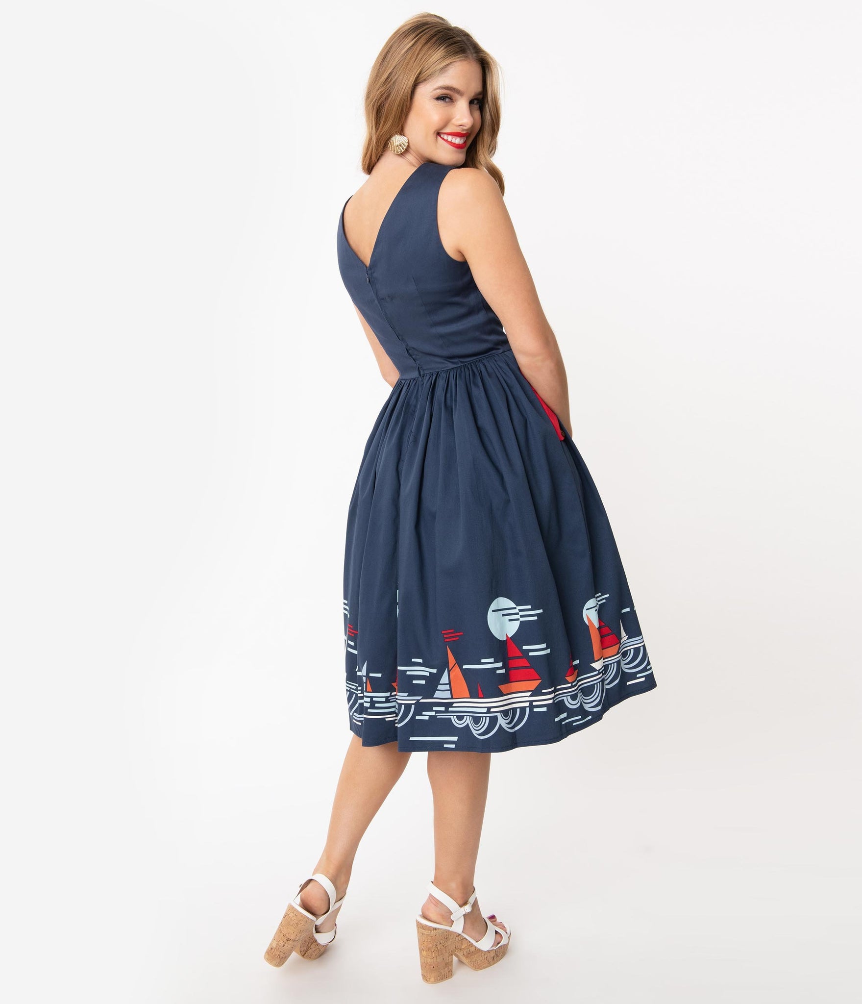 1950s Style Navy Summer Sailing Scene Swing Dress