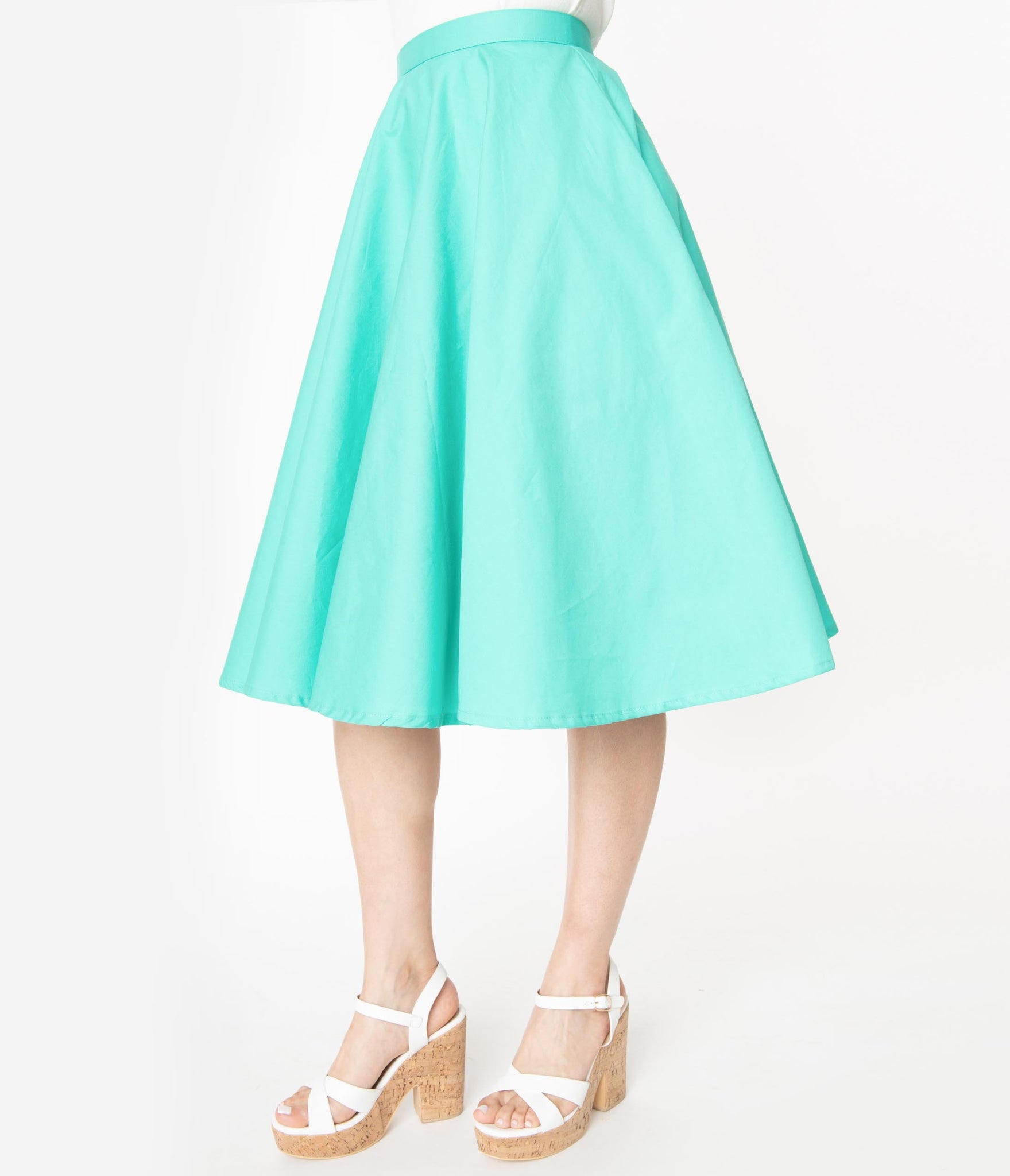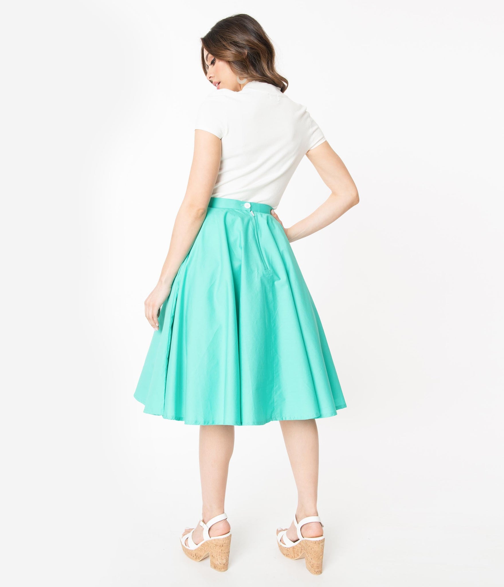 A jaw-dropper for a stylish dame! This crisp swing skirt is designed to cinch at the waist and dance around the hips in a fabulous solid mint green. Crafted in a lightweight and sturdy cotton, this knee length piece can be worn with a crinoline for a little extra flare. Featuring two side pockets and a back zipper below a button closure, this skirt is an excellent addition to your 1950s style!