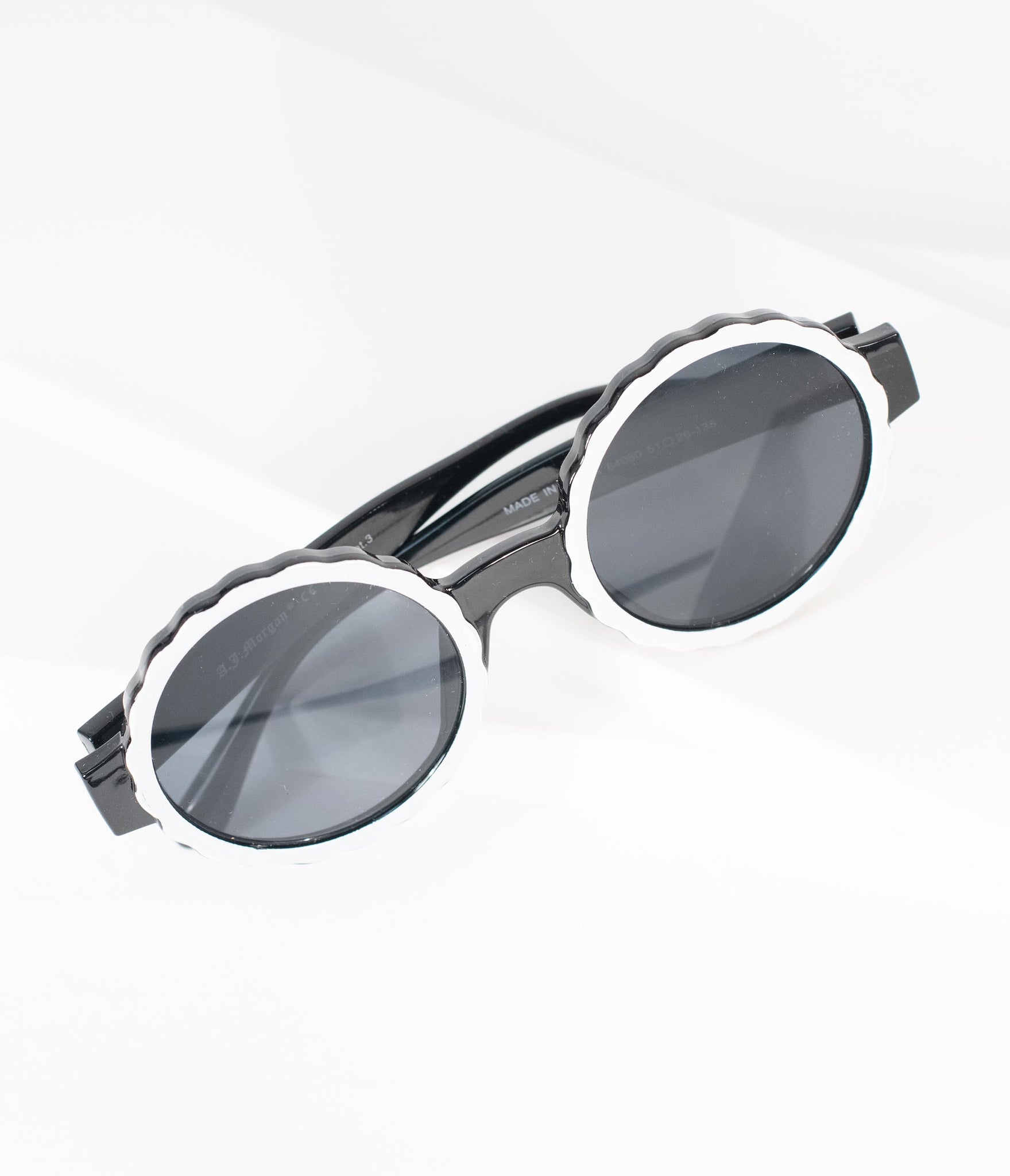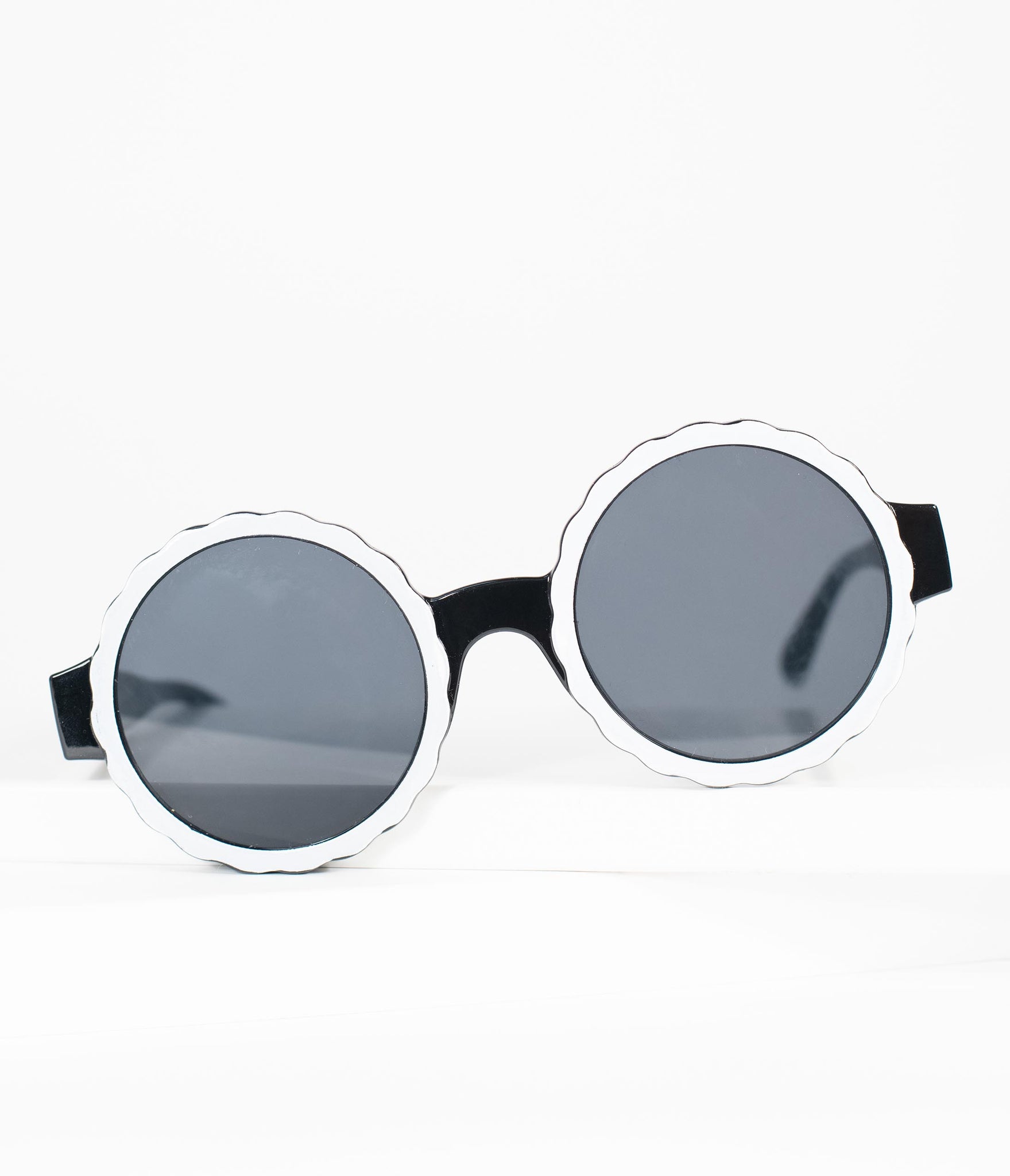 Eggs-quisite, darlings! A chic rounded pair of retro sunglasses, this bold accessory features white scalloped edges along the round tinted lens. Featuring molded nose pads and tapered arms for a snug fit!