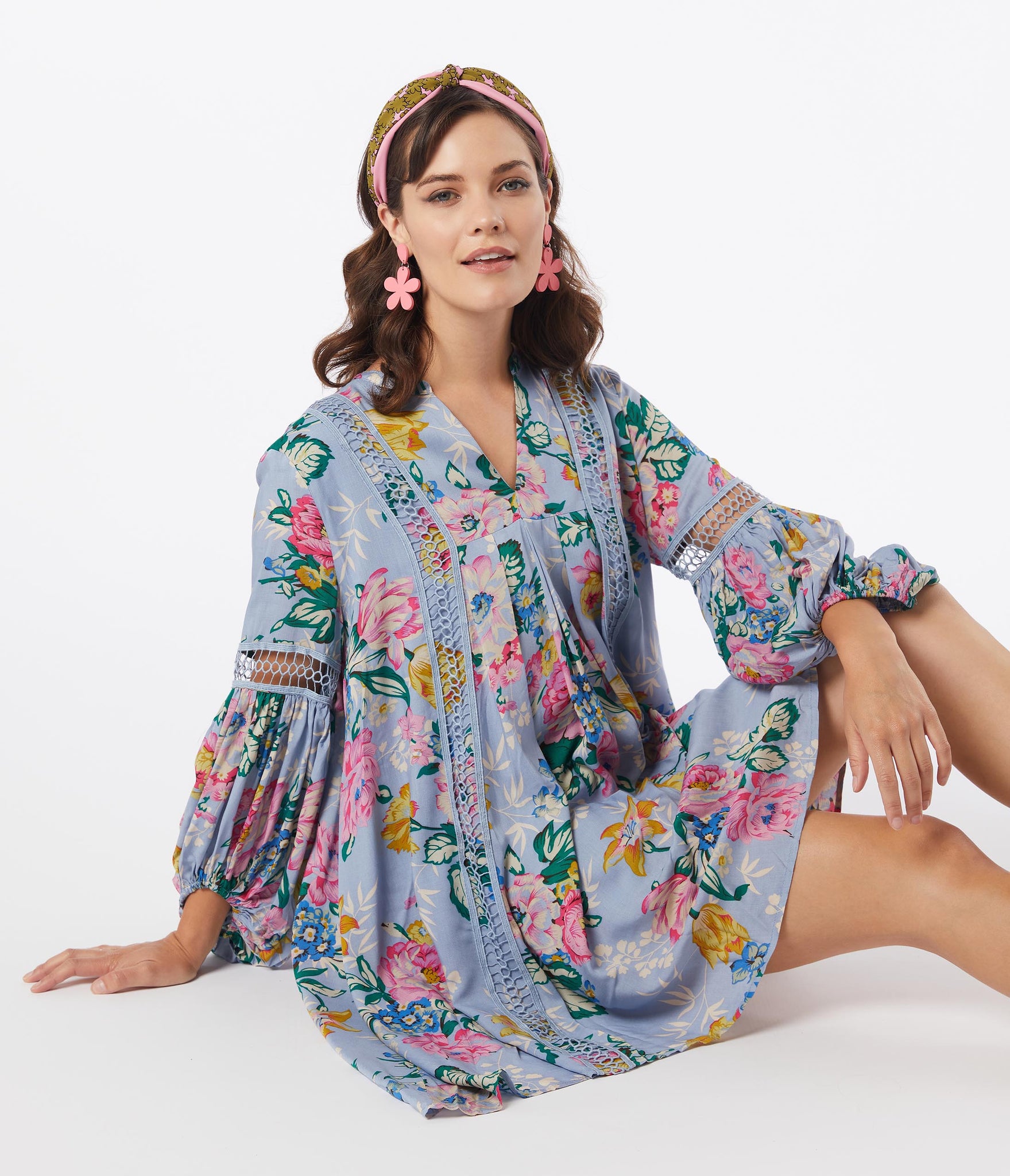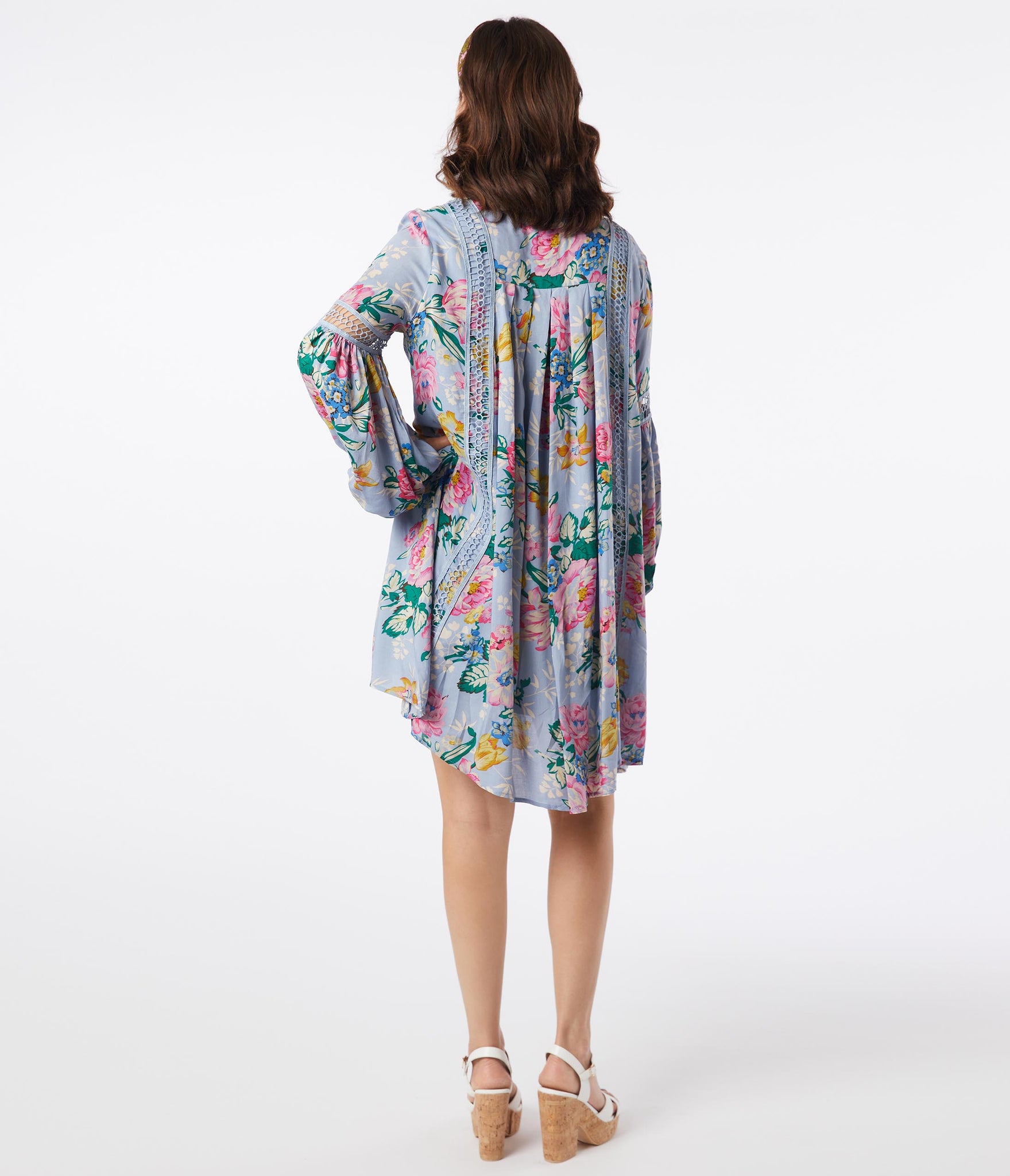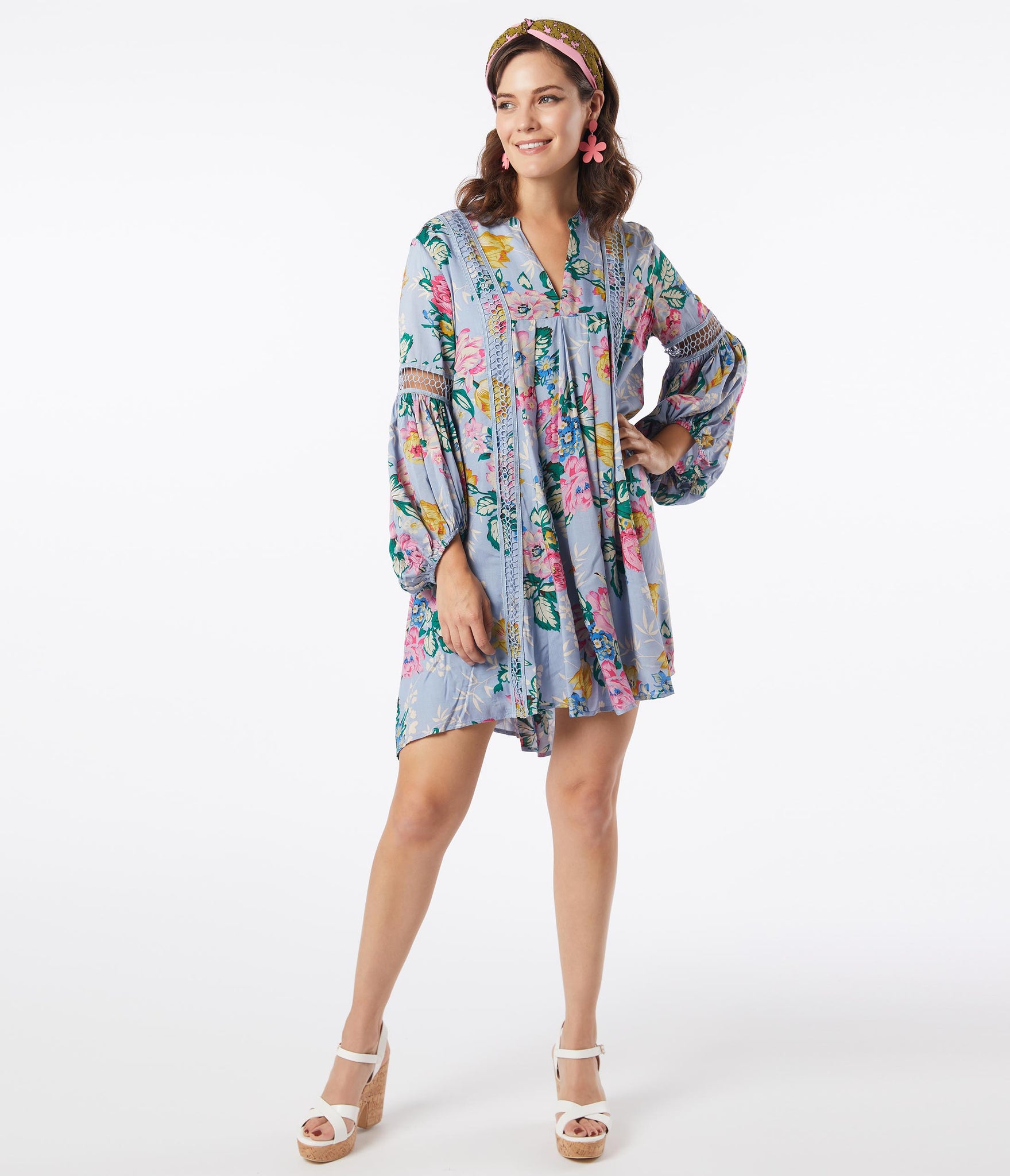 Boho and carefree, dears! This sultry trapeze dress is crafted in a lightweight woven fabric that dances with multicolor florals throughout the light lilac purple backdrop. The relaxed silhouette sways around your from with the modest V-neckline is framed by billowing long sleeves that drop into an elastic cuff. Beautiful crochet accents and the shortened hemline provide eye-catching detail!