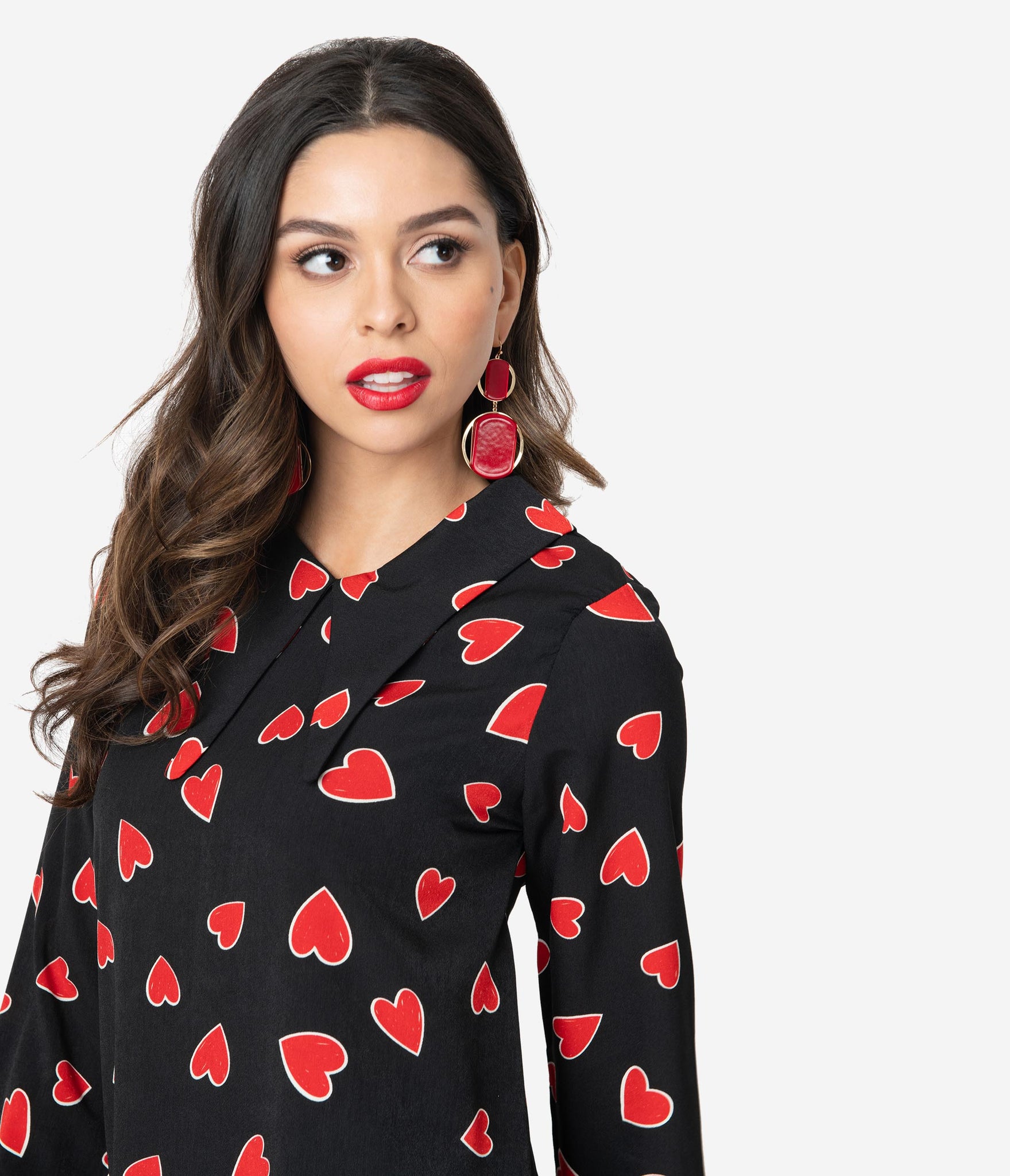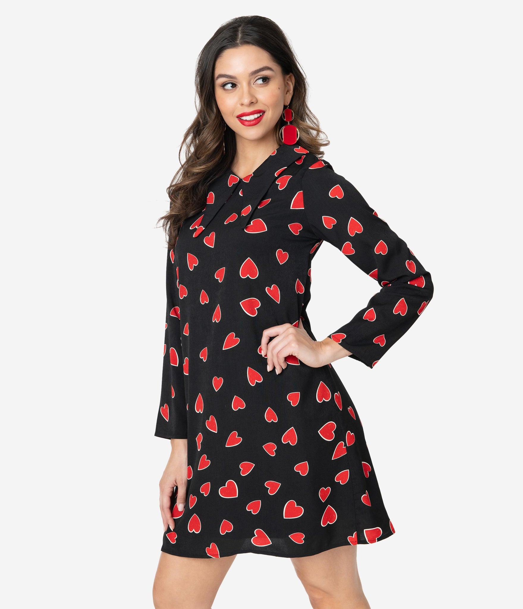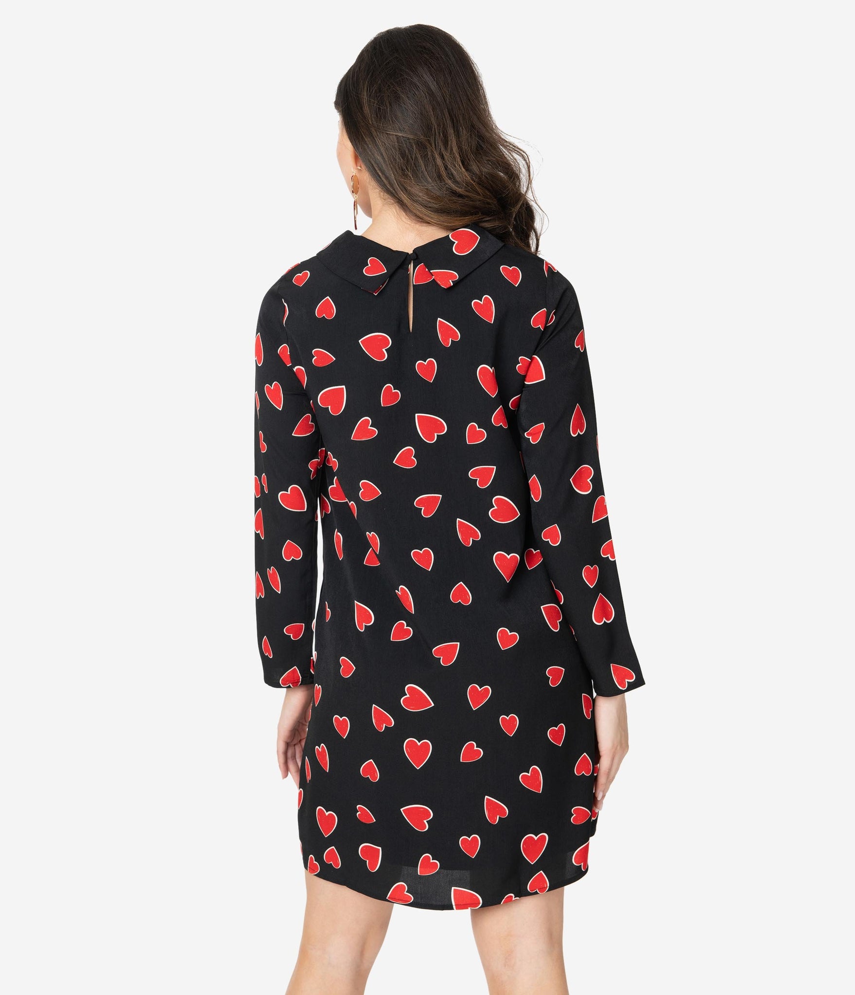 Eat your heart out, babe! This 1960s style black shift dress features a charming winged collar and red heart pattern. This fully lined crepe dress also features a button closure at the back of the neck for extra structure. This dress won't leave you with a broken heart.
