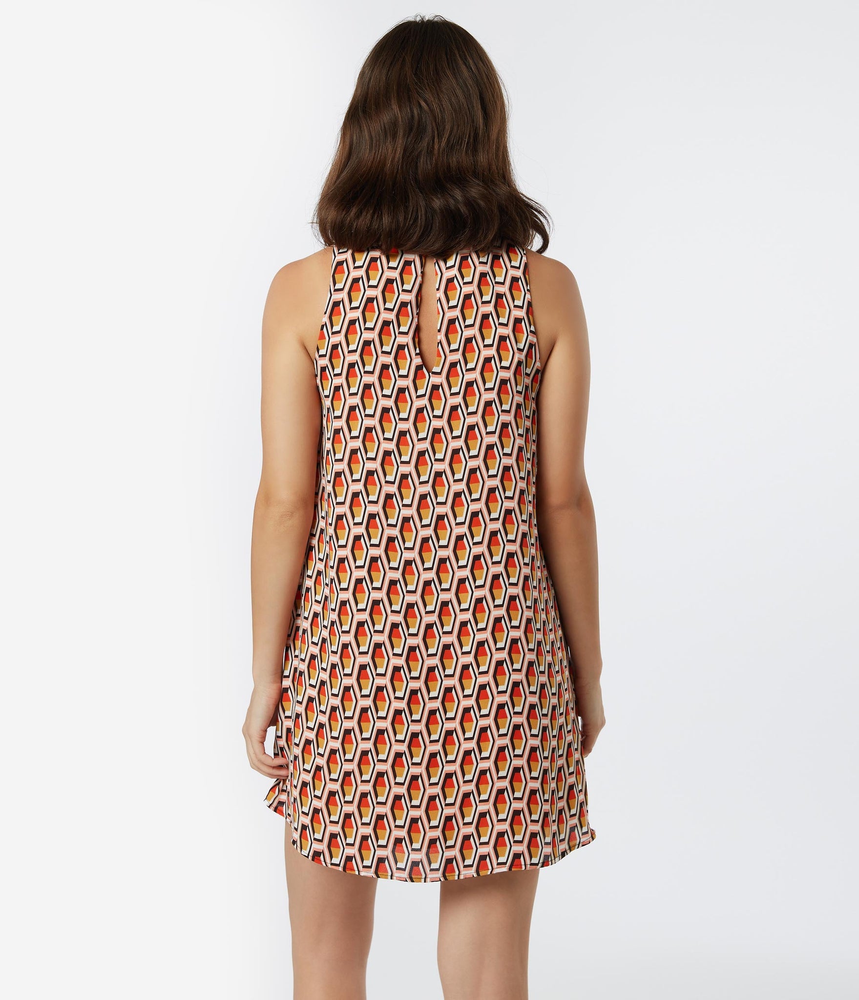Cruising for some good vibes, gals! This light and breezy dress exudes groovy 1960s attitude with a dazzling honeycomb print throughout the shift silhouette. The modest neckline is secured in the back with a button keyhole while the sleeveless designs hows off your shoulders. Outfitted with side pockets, power to the people!