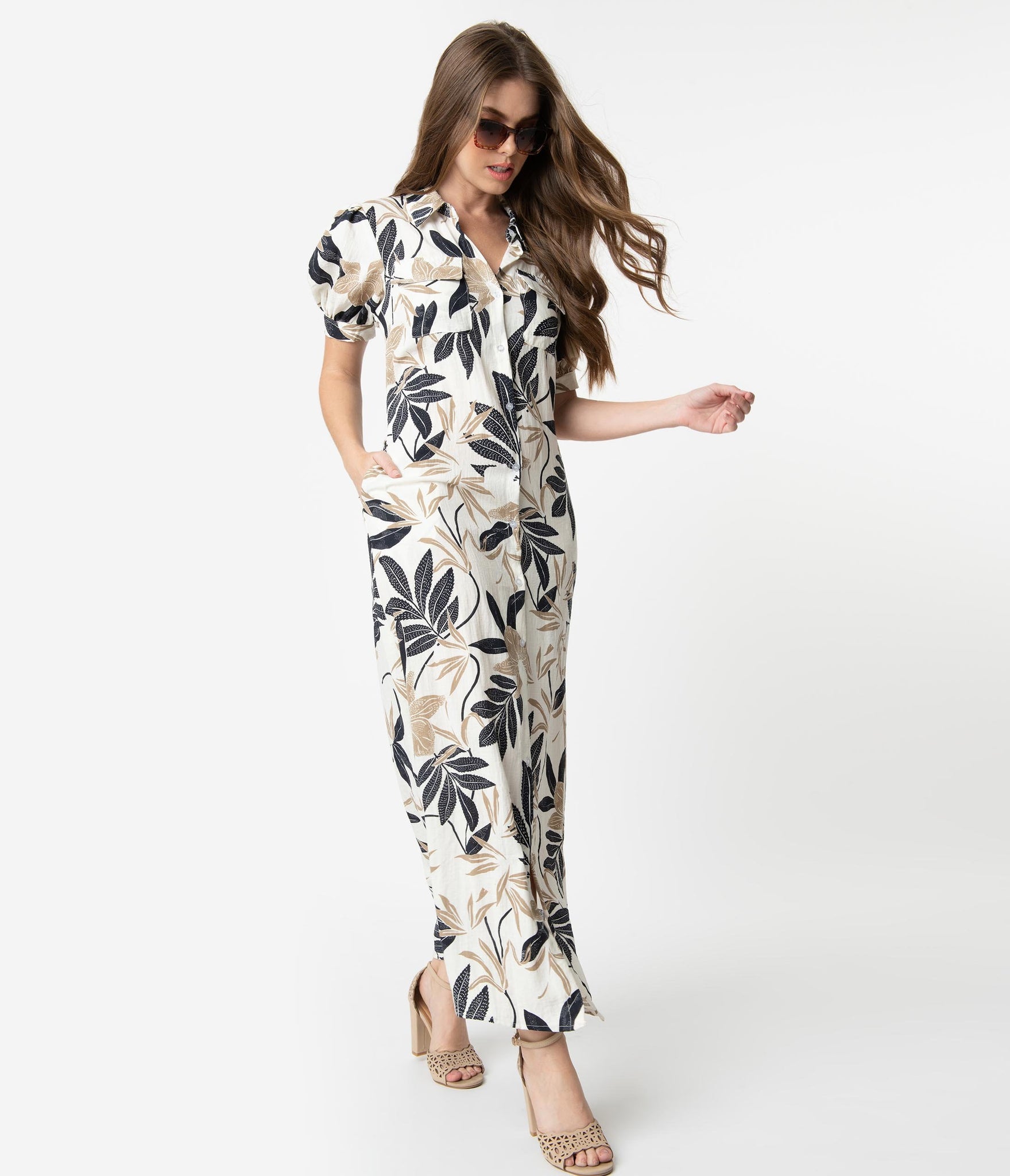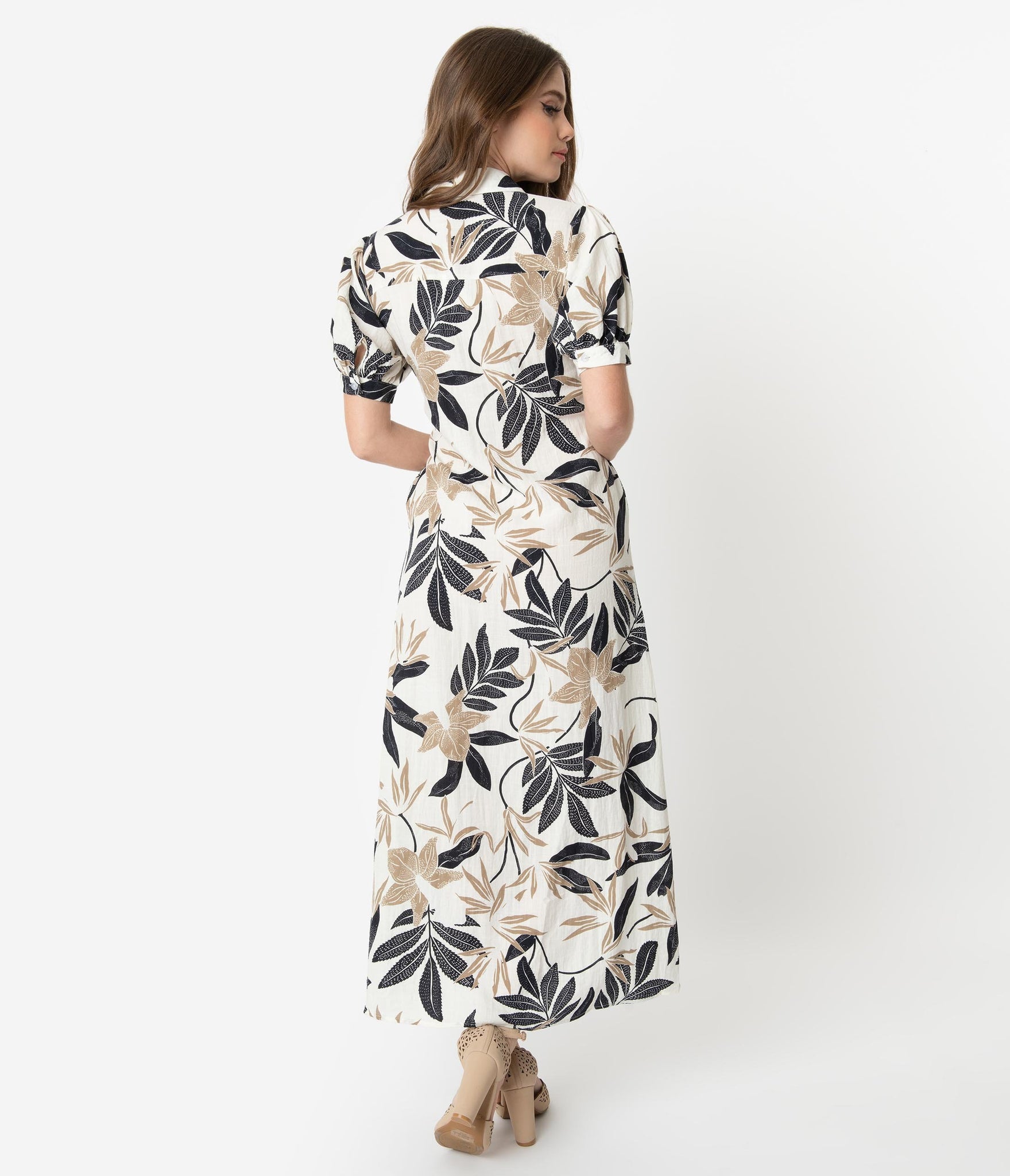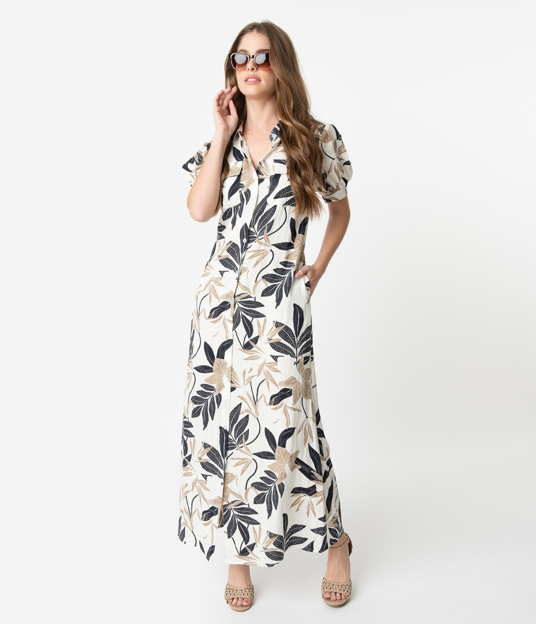 We’re all aflutter, darling! Soft and radiantly reminiscent of the 1960s, this gorgeous cotton maxi dress is ready for a cruise around the world with a tan and black floral print cascading through the ivory background. The button up front and dual bodice pockets lend vintage vibes as the collared neck is framed by gathered short sleeves, nipped in with a button cuff. The sweeping maxi skirt drops to your ankles while functional side pockets provide easy assistance as you make you move. Complete with a back yoke, throw on and go stun!