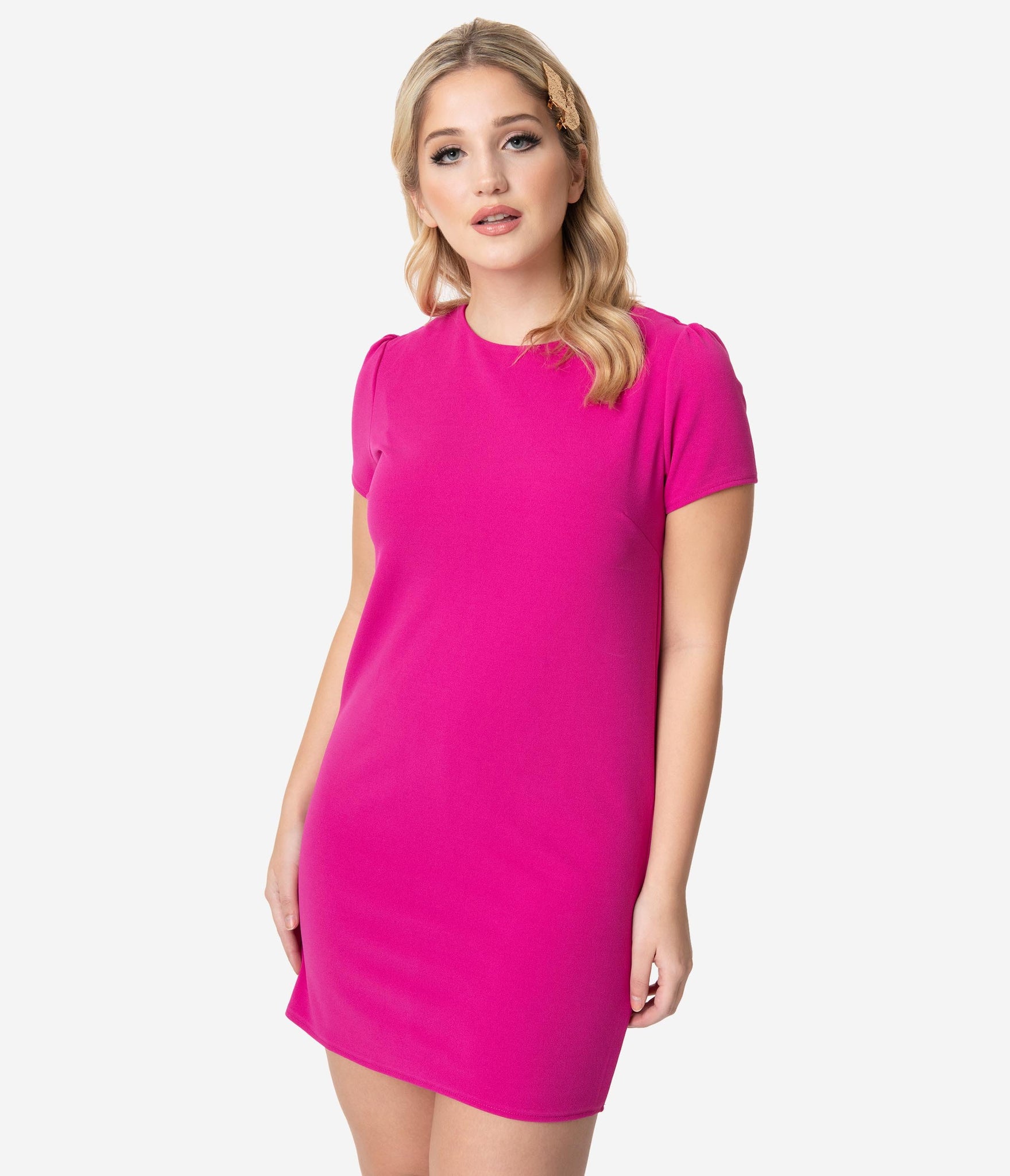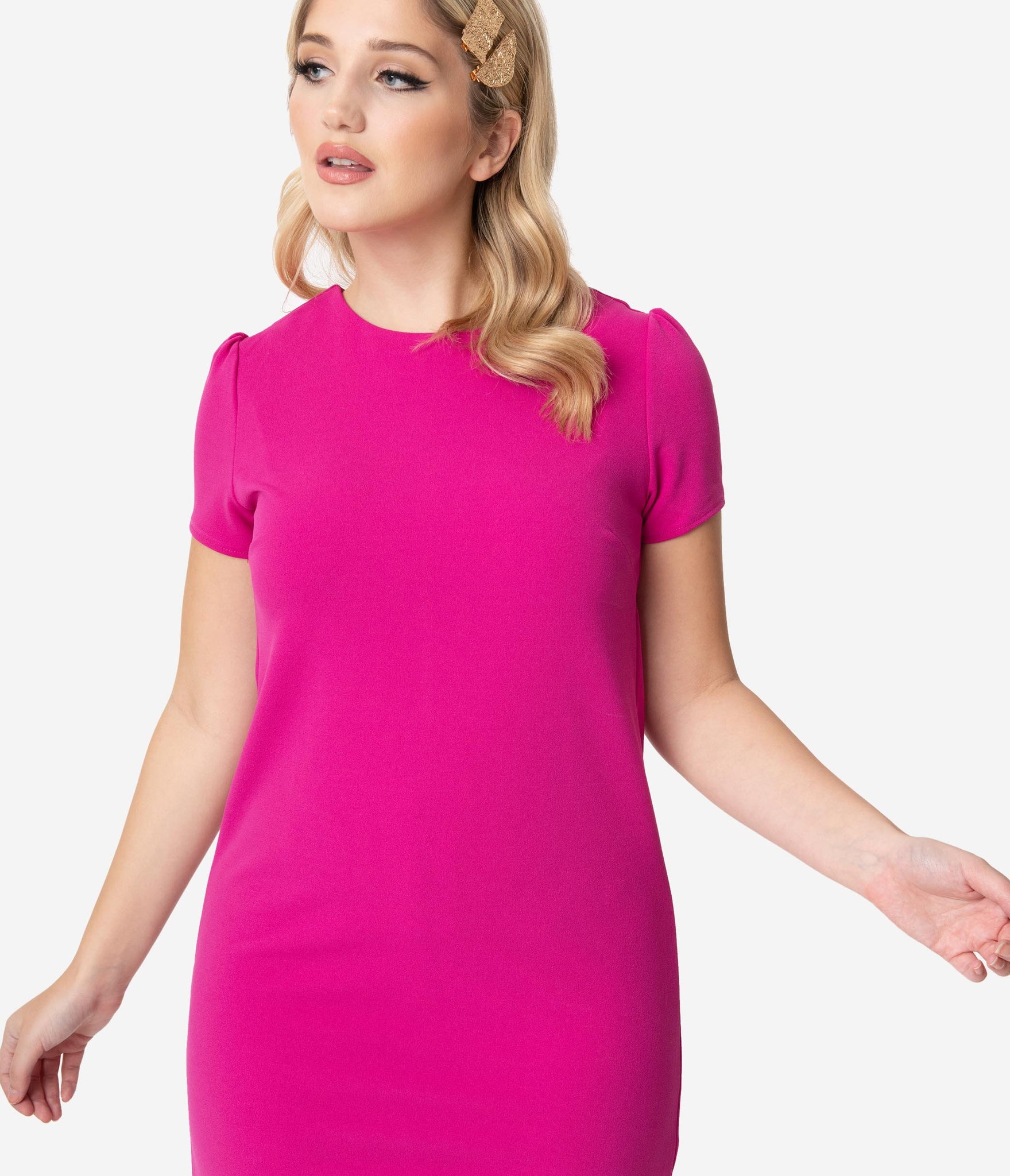 Eye-catching fun, dears! A cute and sultry shift dress, this adorable retro wonder is crafted in a groovy magenta pink crepe with a dash of stretch for comfortable frolics. The darted bodice is centered by a modest neckline, secured in the back with a button keyhole, while the sweet short sleeves boasts a subtle puff for feminine flair. The straight silhouette drops to a high hemline to show off your sexy gams!