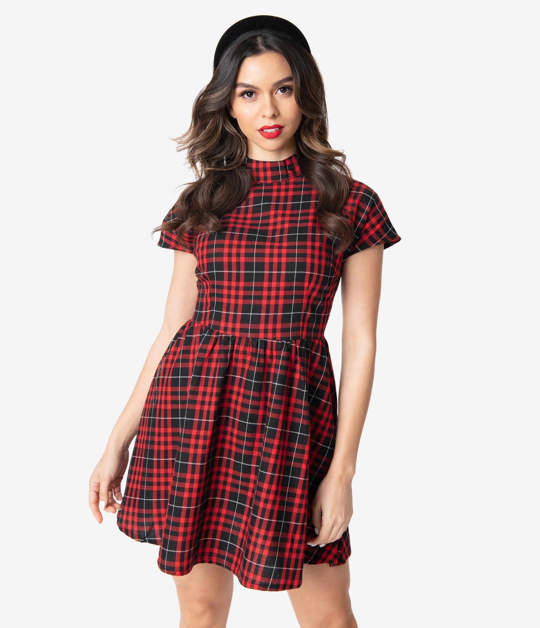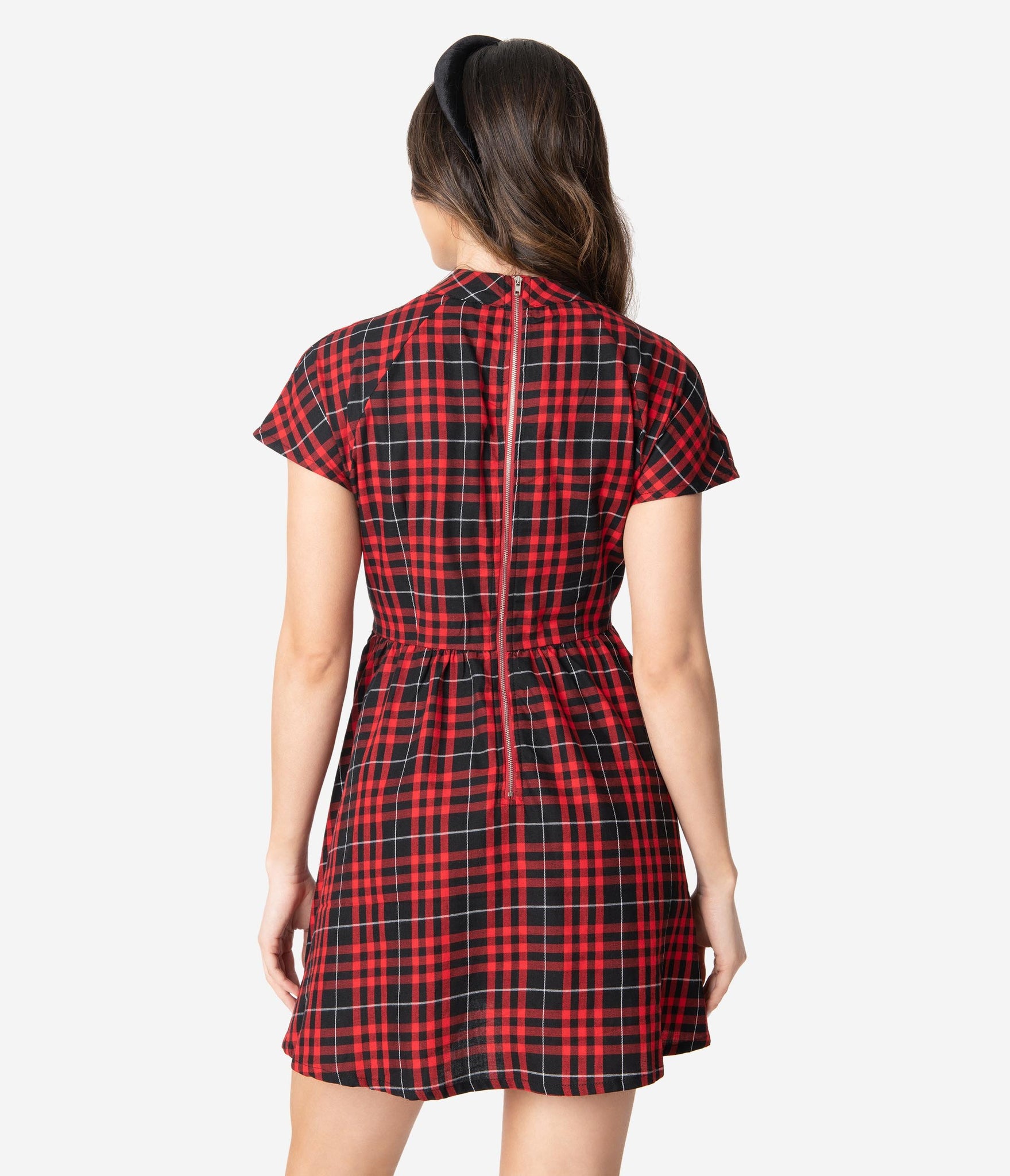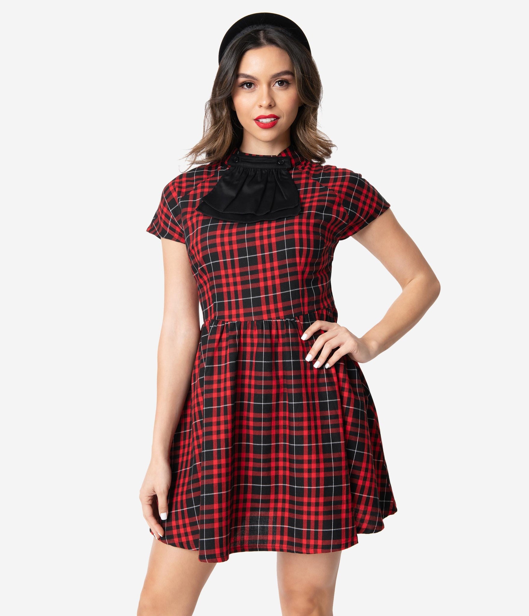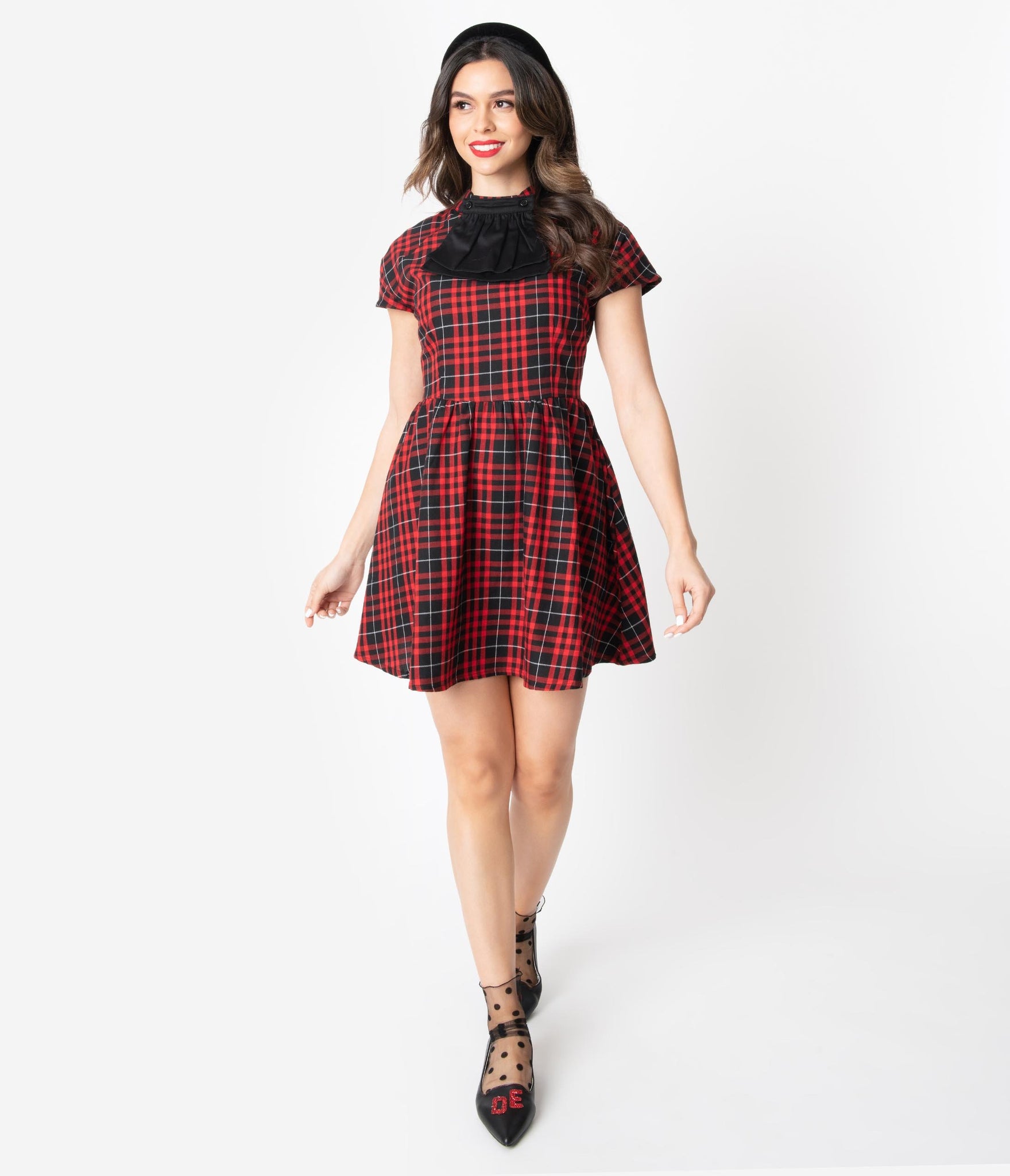 Fab in plaid, dears! This adorable fit and flare is crafted in marvelous cotton and features a gorgeous red and black plaid pattern throughout. The high collar features a removable black ruffled jabot, framed by raglan cap sleeves. The darted bodice lends a flattering fit while the cute skater skirt is topped by subtle gathers along the seamed waist. Outfitted with a back zipper, time flies when it’s the holidays!