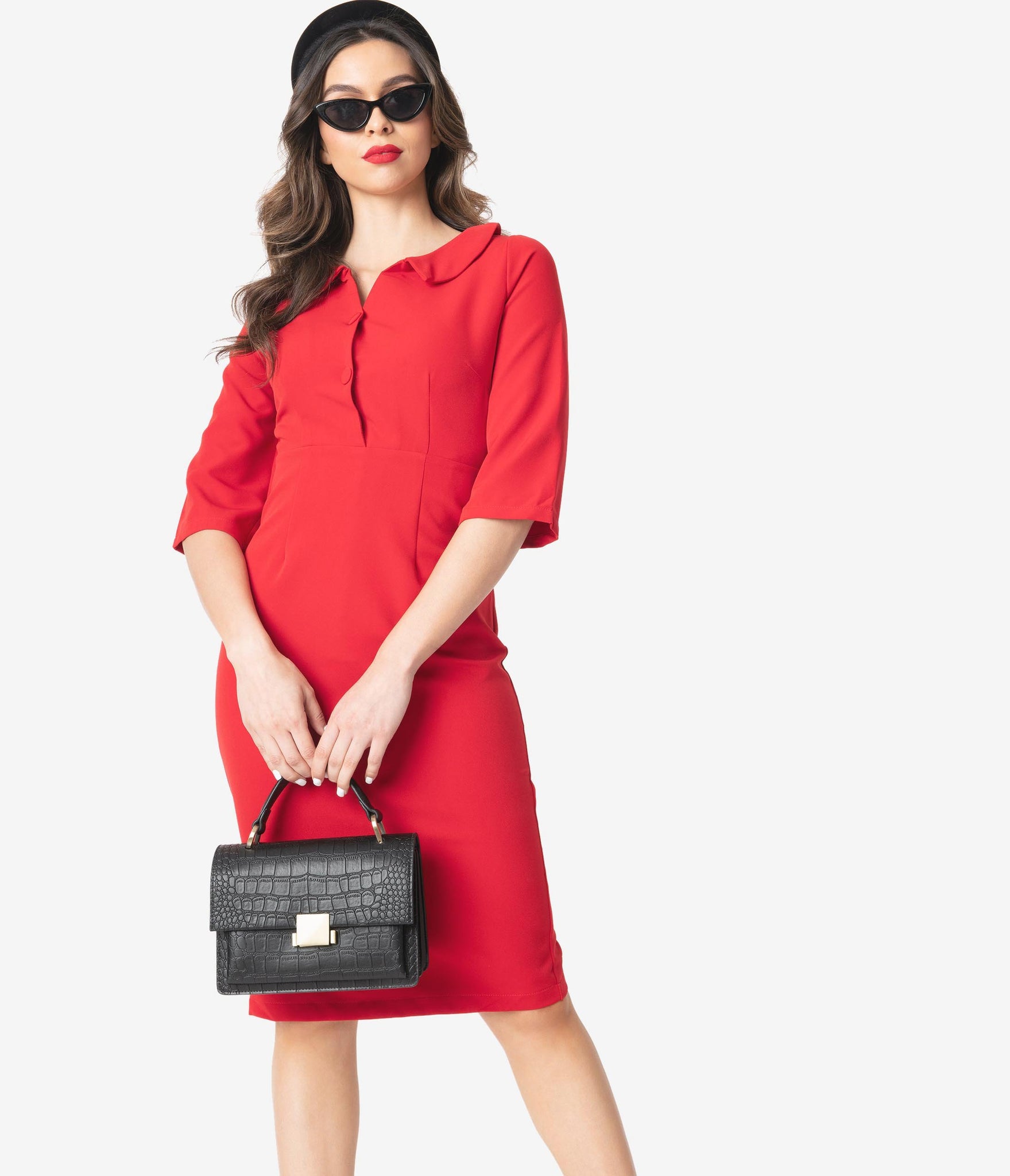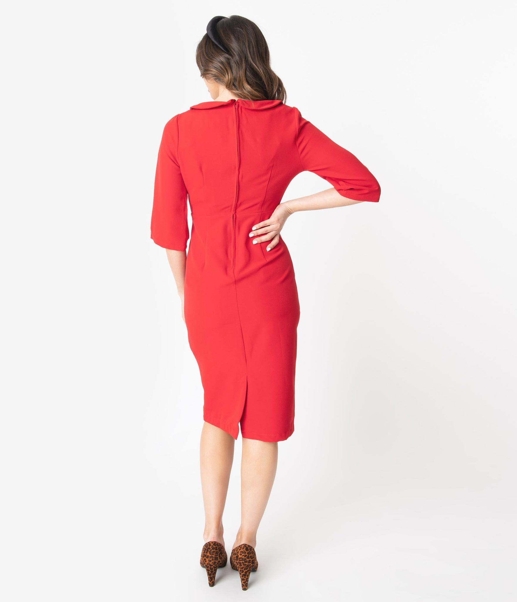 We’re on red alert, gals! An alluring silhouette in a gorgeous 1960s design, this stunning red frock is crafted in a sturdy woven blend that hugs your curves. The button up, darted bodice is toped by a retro collar and framed by elegant half sleeves while the high seamed waist tops an eye-catching pencil skirt. Outfitted with a back zipper to cinch in your figure and a sweet kick vent, it’s your first and only warning!