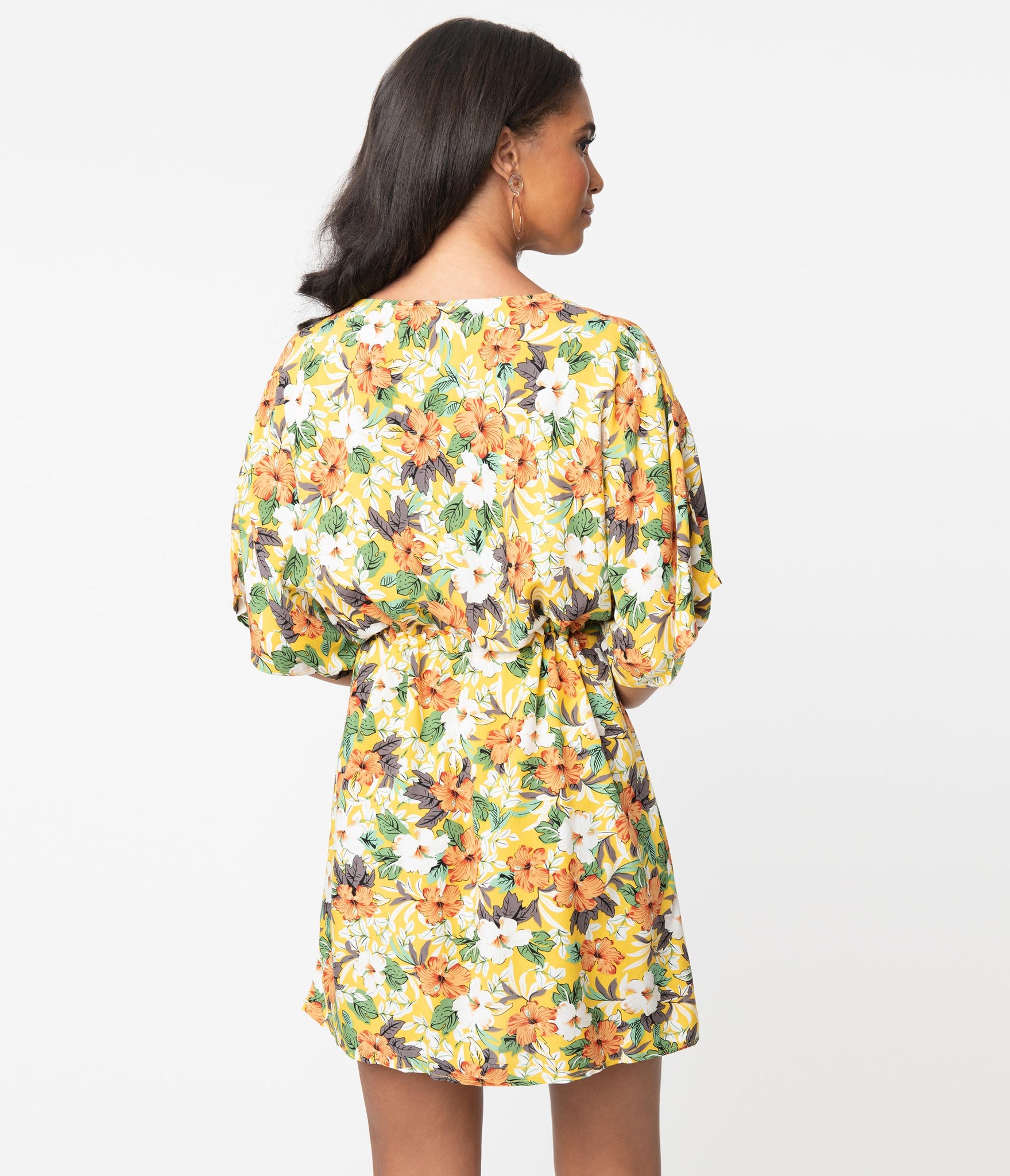 Sultry and sweet! This jaw-dropping fit and flare dress is crafted in a fabulously soft woven blend that dances with a gorgeous multicolor tropical floral print over a yellow backdrop. The sweet V-neckline is centered by a button up bodice while the breezy dolman sleeves keep you comfortable with summer breezes. The banded waist is cinched with a pull tie cord while the flirtatious flare features faux buttons on the front for a dash of retro appeal!