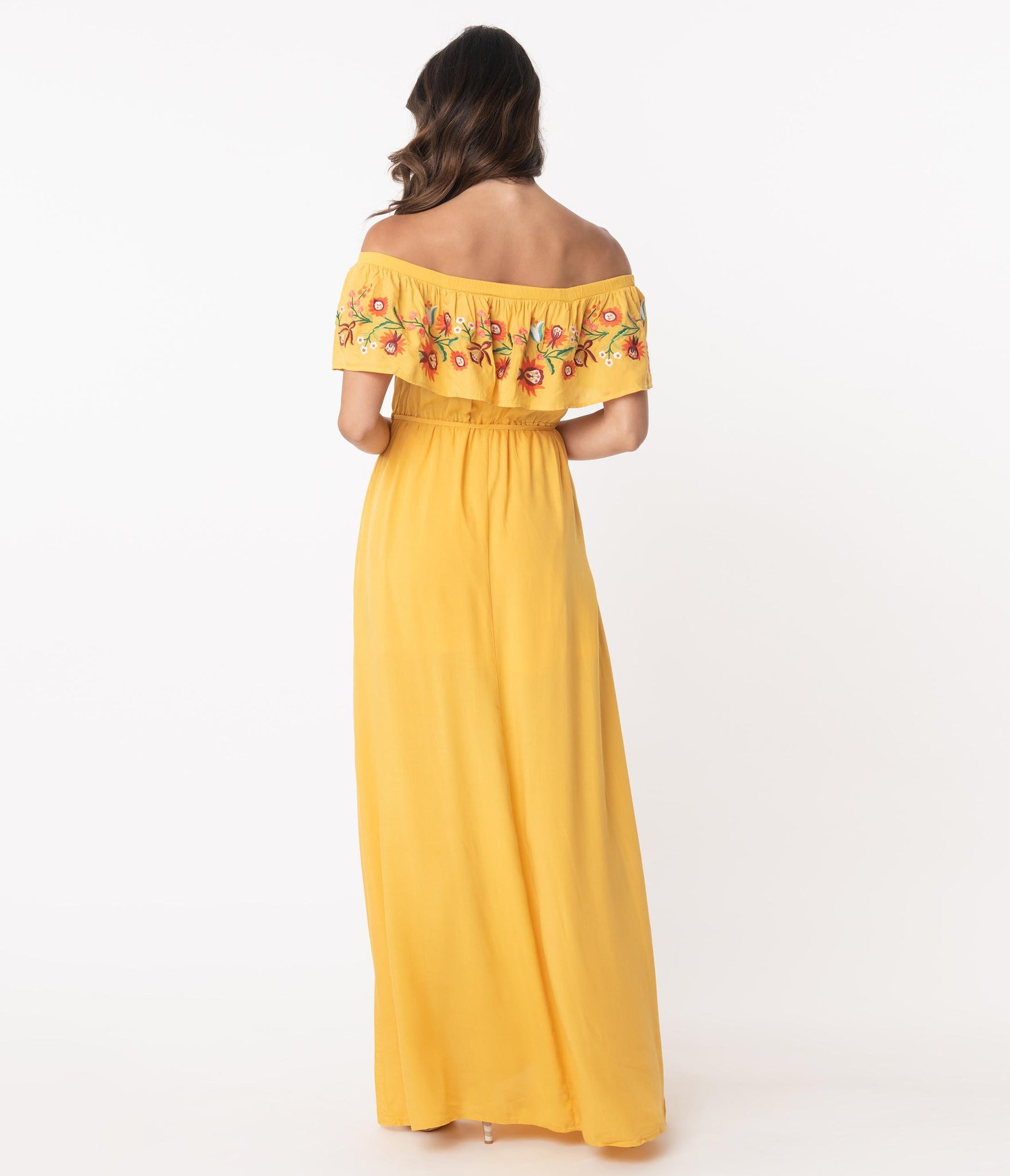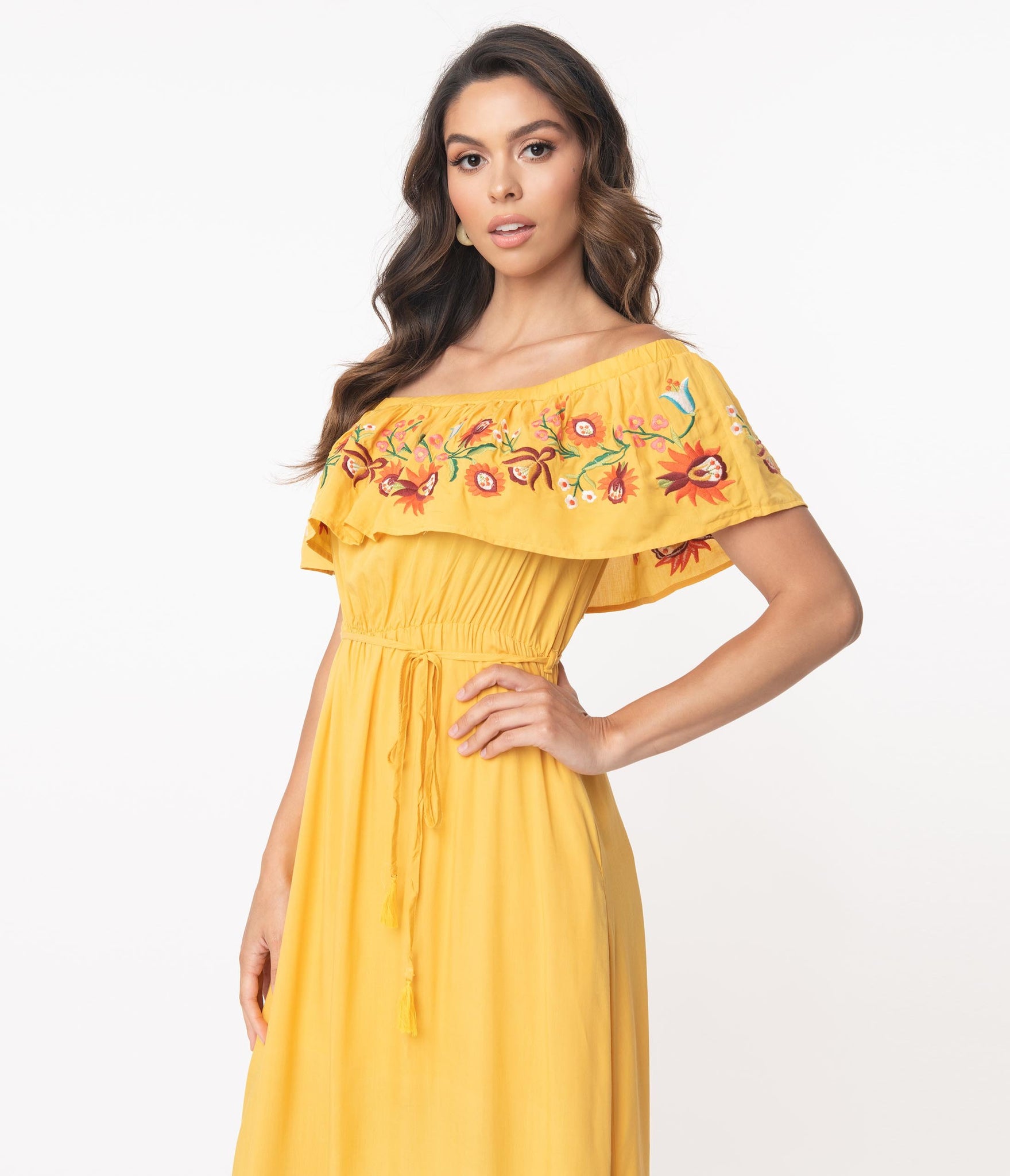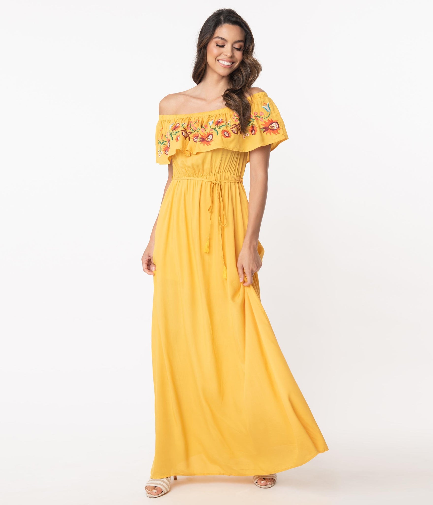 A beloved silhouette, darling! This sweet maxi dress is crafted in a soft woven fabric that flows around your form in beautiful retro styling. Boasting a stunning honey yellow, the sultry off shoulder neckline features a charming ruffle drop that dances with embroidered florals over your bust while the elastic waist can be cinched with a matching corded tie. The sweeping skirt is outfitted with side pockets and cascades to the floor for romantic swooning!