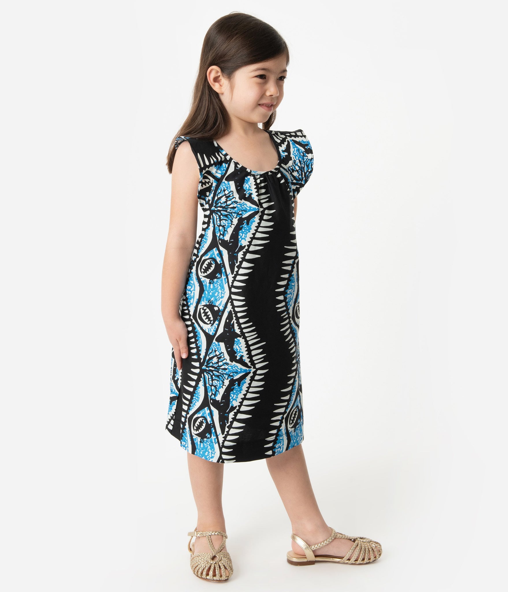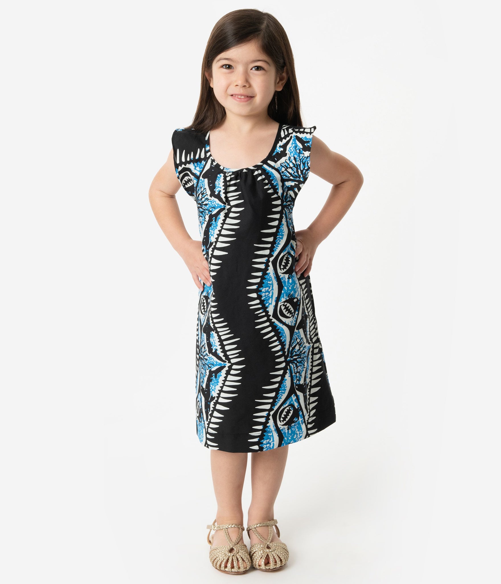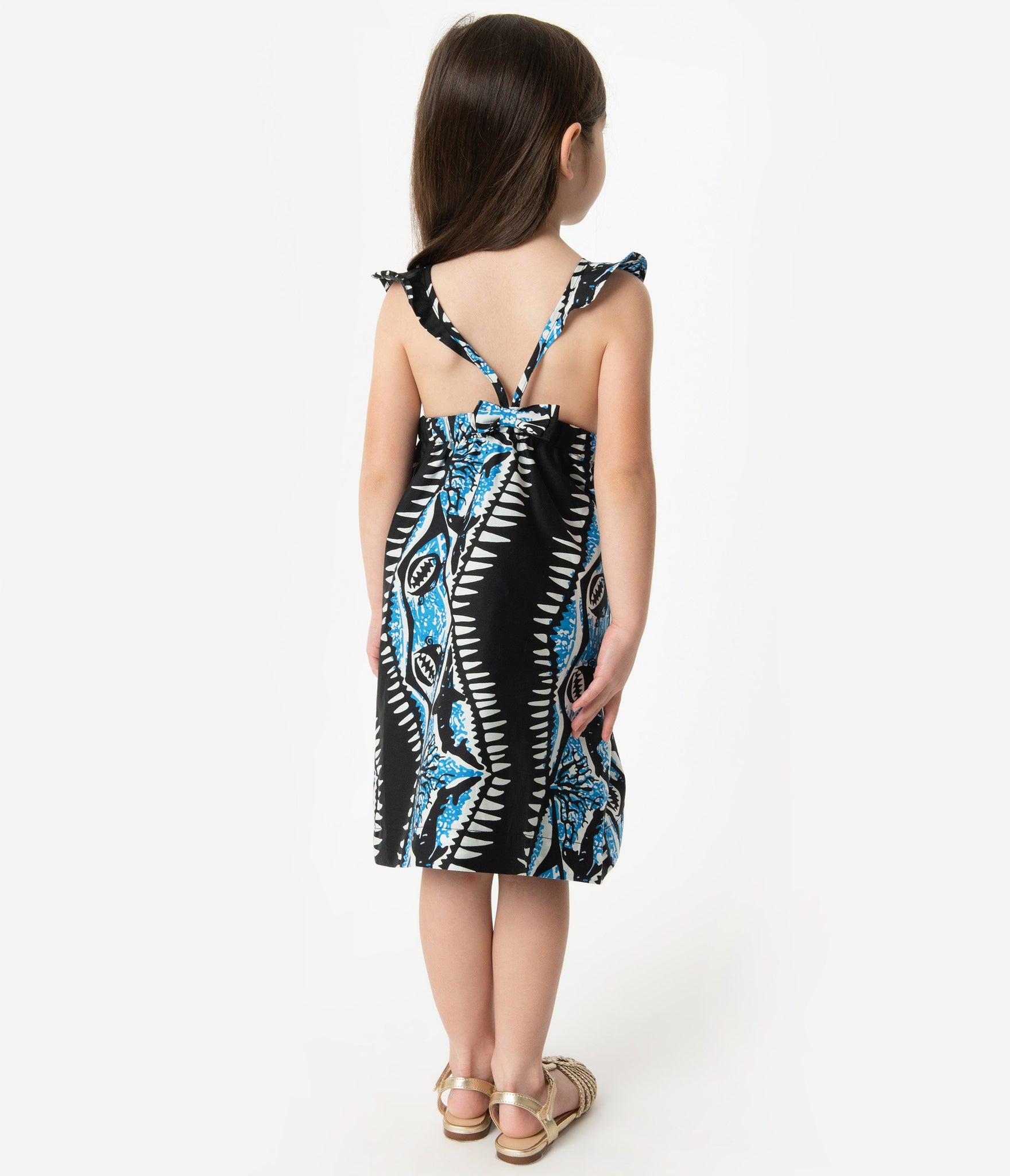 Lavish her in flowers! The latest bloom from Alfred Shaheen for Unique Vintage, this adorable cotton girls dress is cast in an officially licensed original Alfred Shaheen print called Shark. A terrifying print in striking black, blue, and white patterns flow throughout this cherished frock, complete with a ruffled sleeveless design with a high halter-like neck and an elastic back band for a perfect fit. The fabulous A-line shape completes this delightful dress.