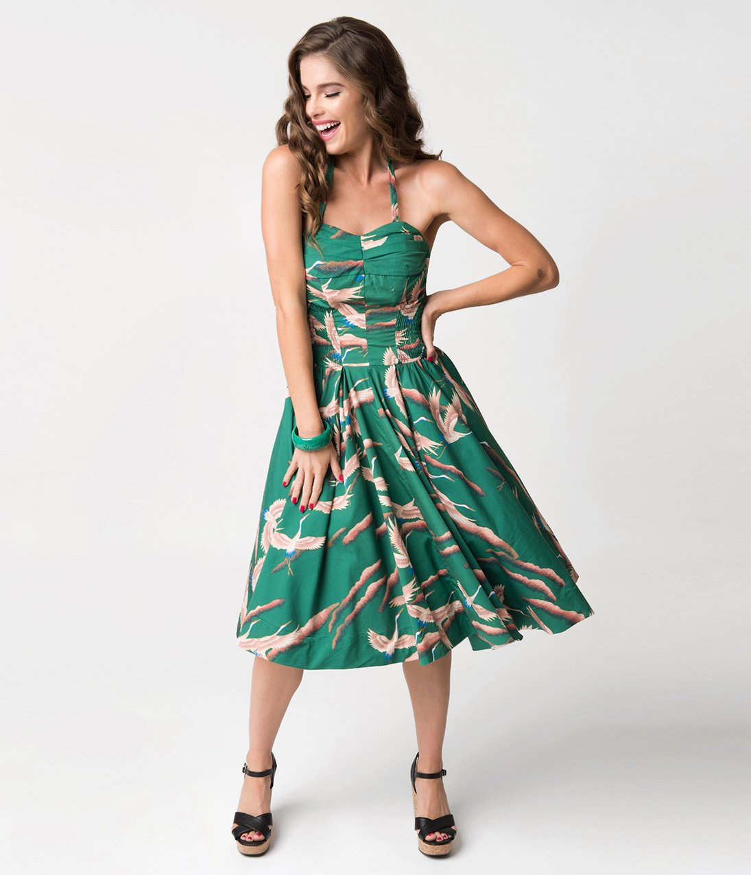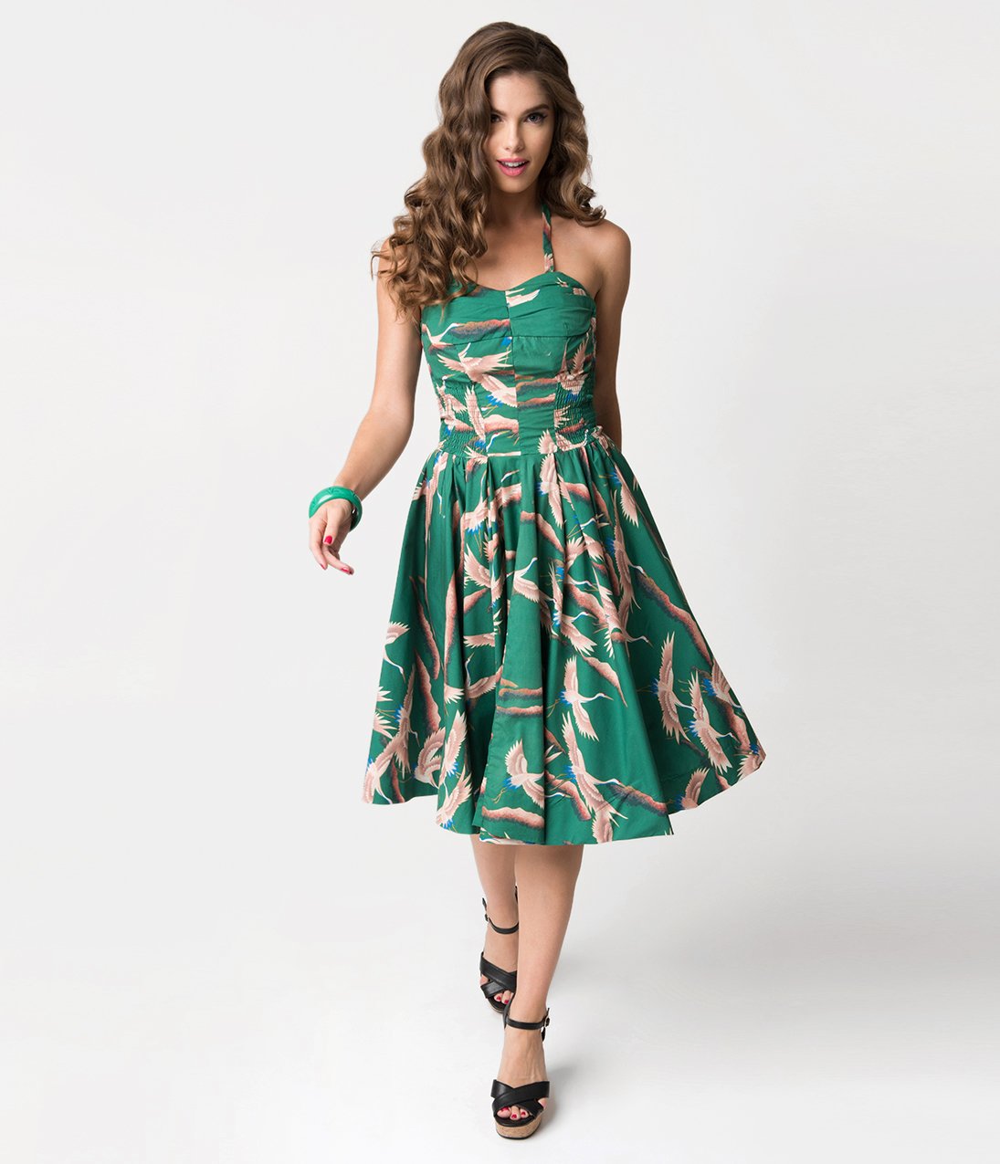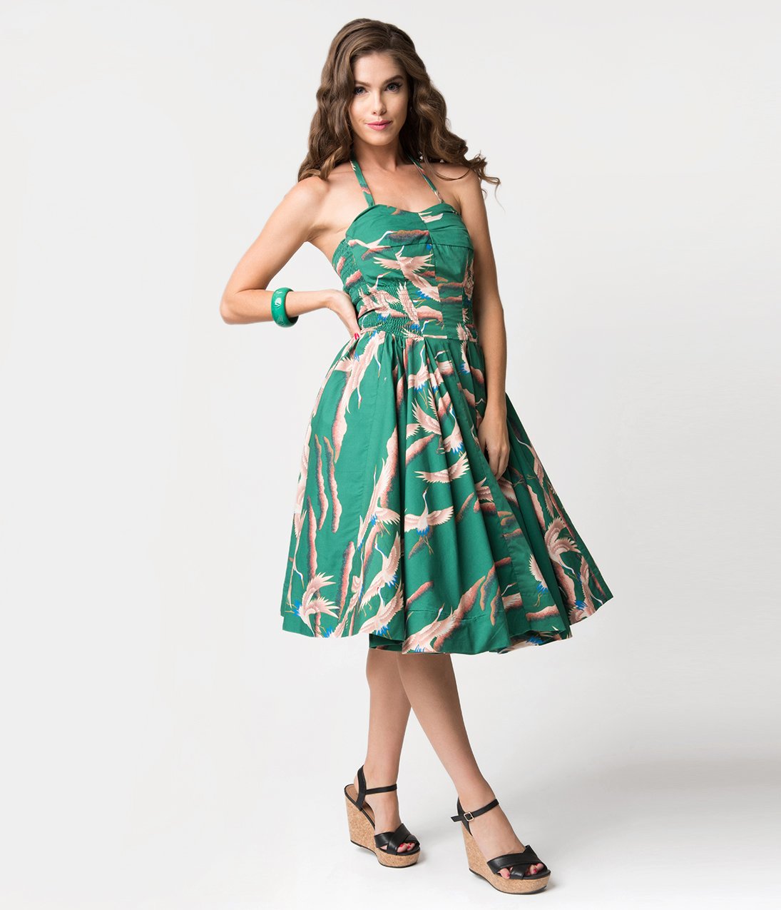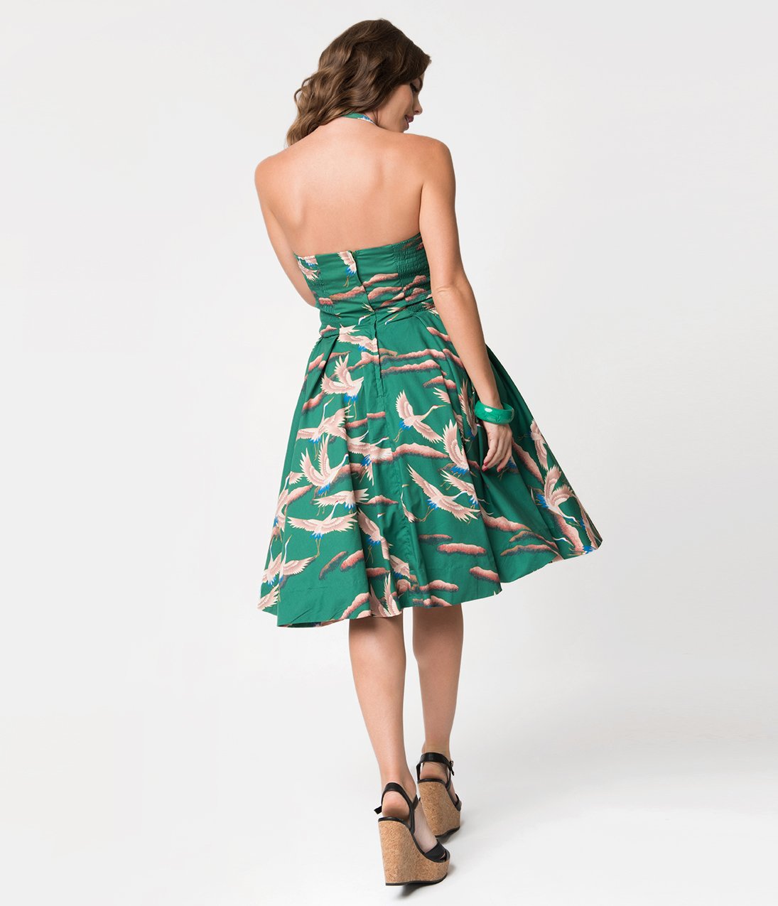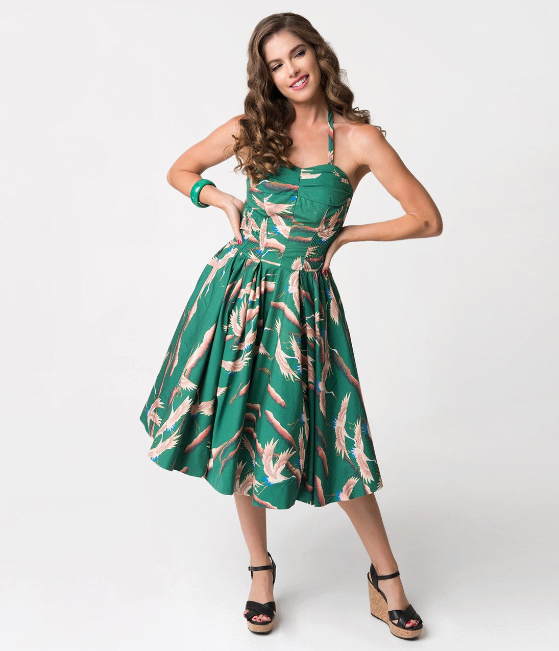 Make feathers fly, dolls! An elegant swing dress from Alfred Shaheen for Unique Vintage, this midcentury Hawaiian style vision features Cranes, a fabulous officially licensed Alfred Shaheen reproduction of a brilliant homage to the noble crane with pink feathered creatures flying between pink clouds and a lovely green backdrop. The subtle sweetheart bust is embellished with fantastic pleating and is subtly boned for added support while the smocked sides allow for a perfect fit. An adorable halter strap can be easily adjusted or removed with darling buttons on the bodice. Seamed at the waist, the gathered swing skirt boasts an array of box and knife pleating for added flare as it cascades to a straight hem at the knees. Set the standard for genius styling, darling!