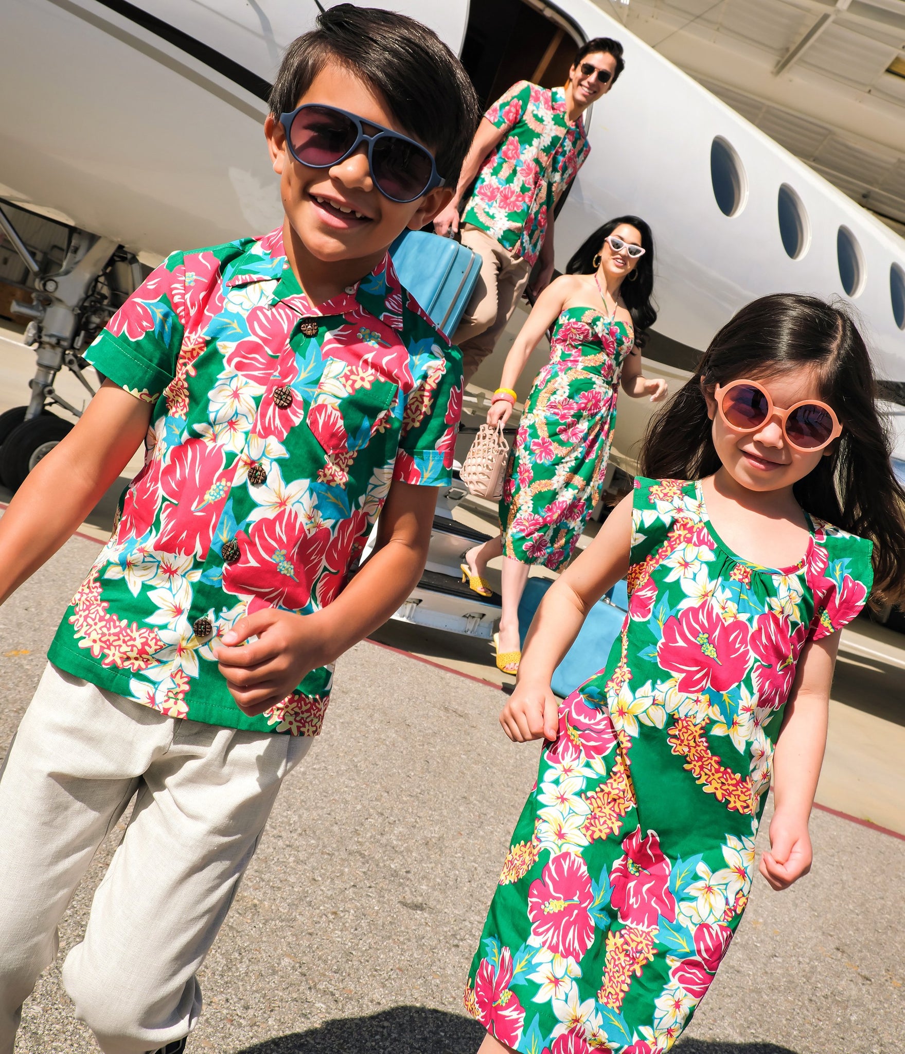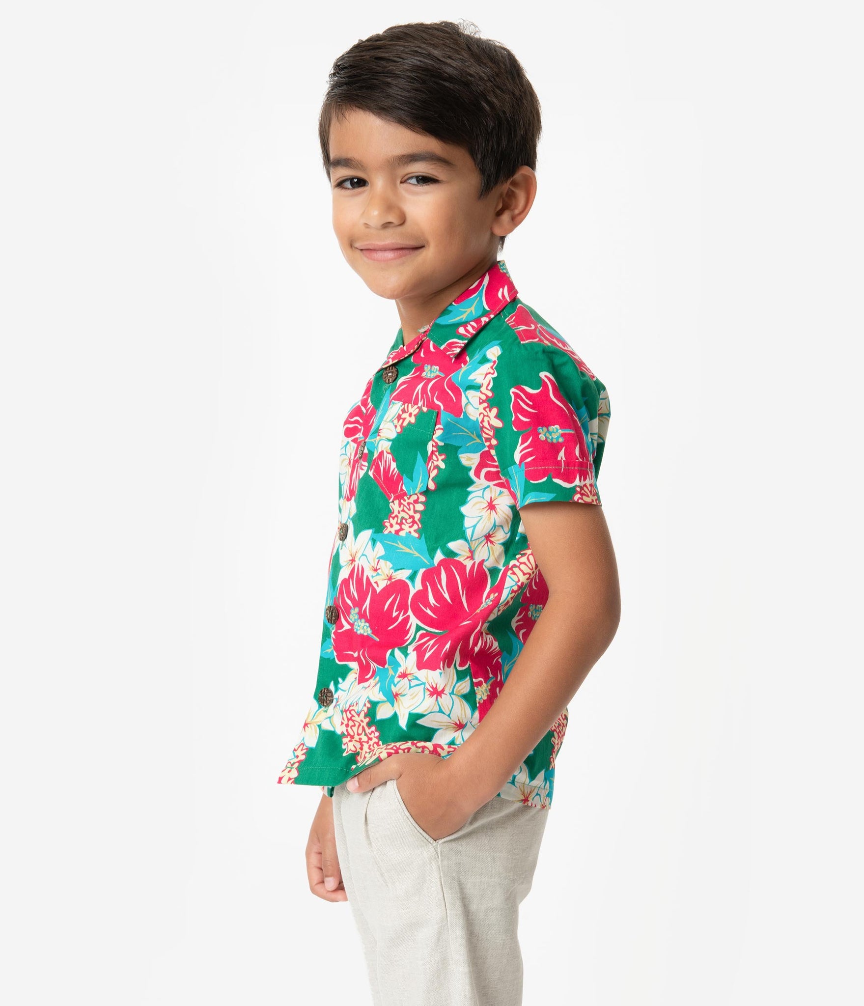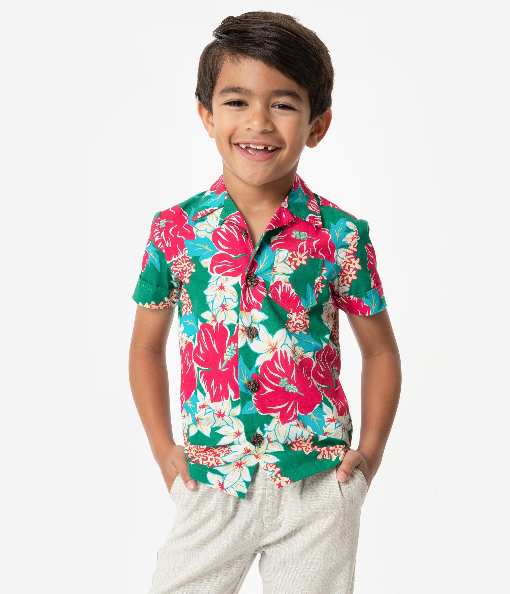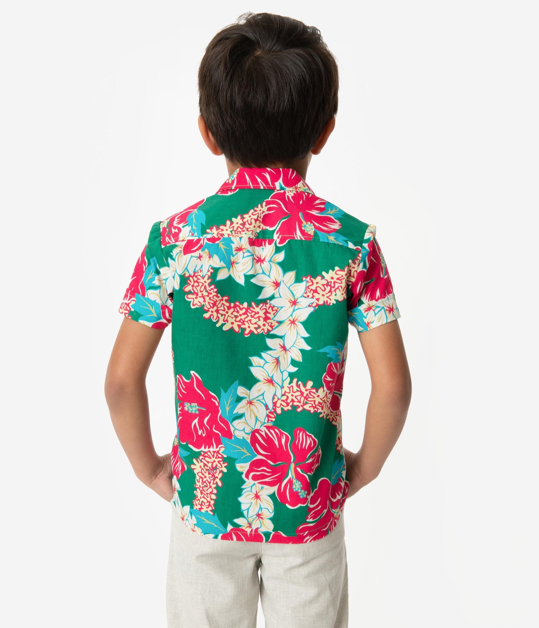 For the little pineapple of your eye! A gorgeous piece from Alfred Shaheen for Unique Vintage, this retro boys Hawaiian shirt boasts an officially licensed recreation of a classic Alfred Shaheen print titled Mala Pua Hibiscus Lei. A beautiful and colorful array of pink, blue, white, and ivory florals float by on a lovely green backdrop. This sweet frock has a wooden style button up front, a classic collar, back yoke, and a functional front pocket. Complete with short sleeves, it’s vintage styling and world-wide travel in one lovable frock!