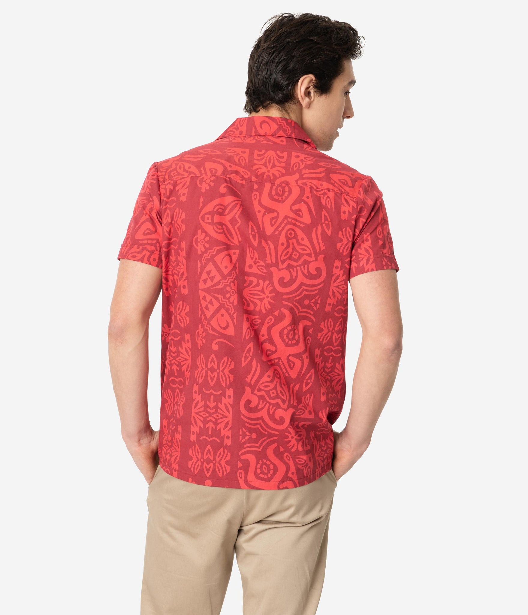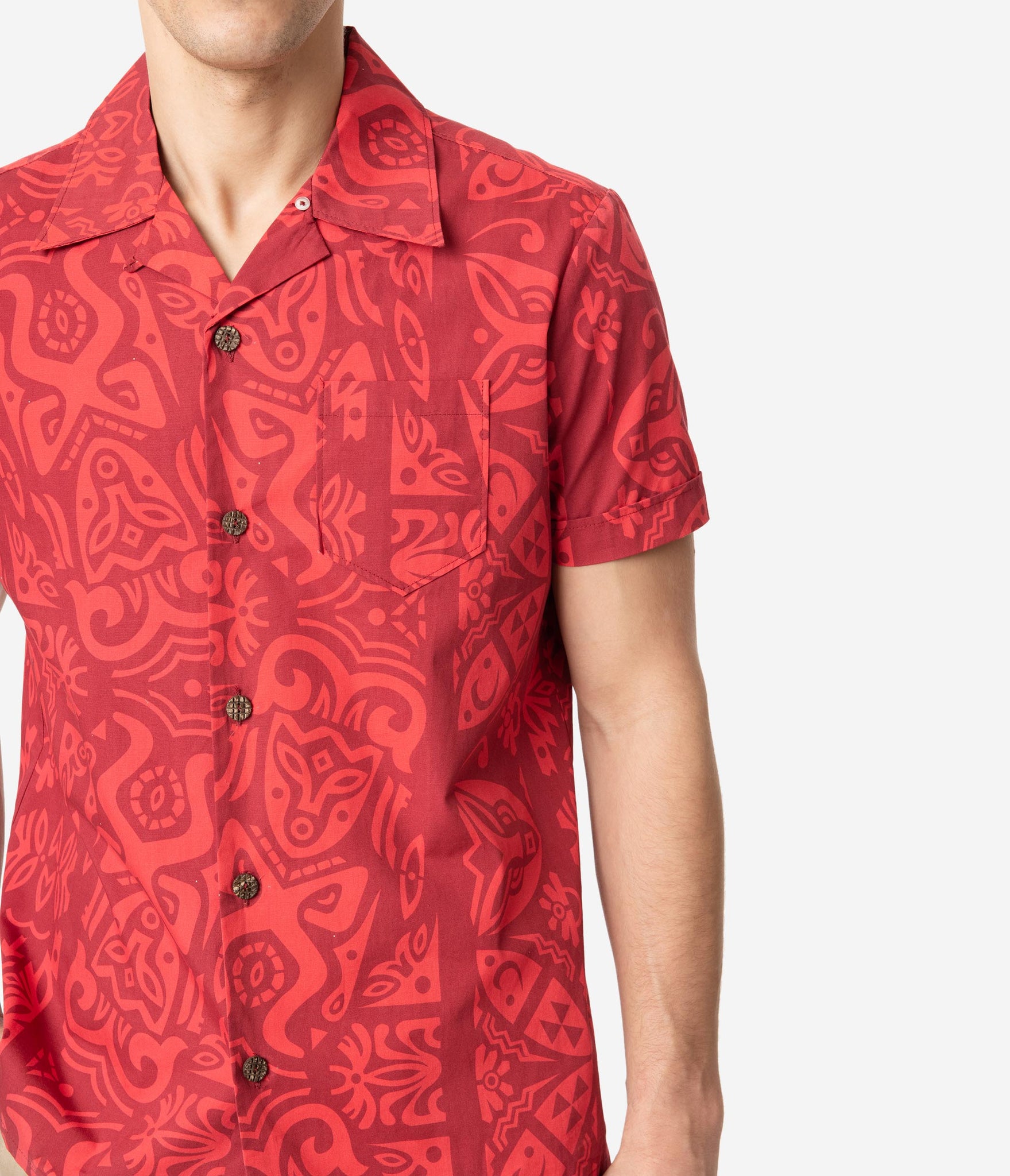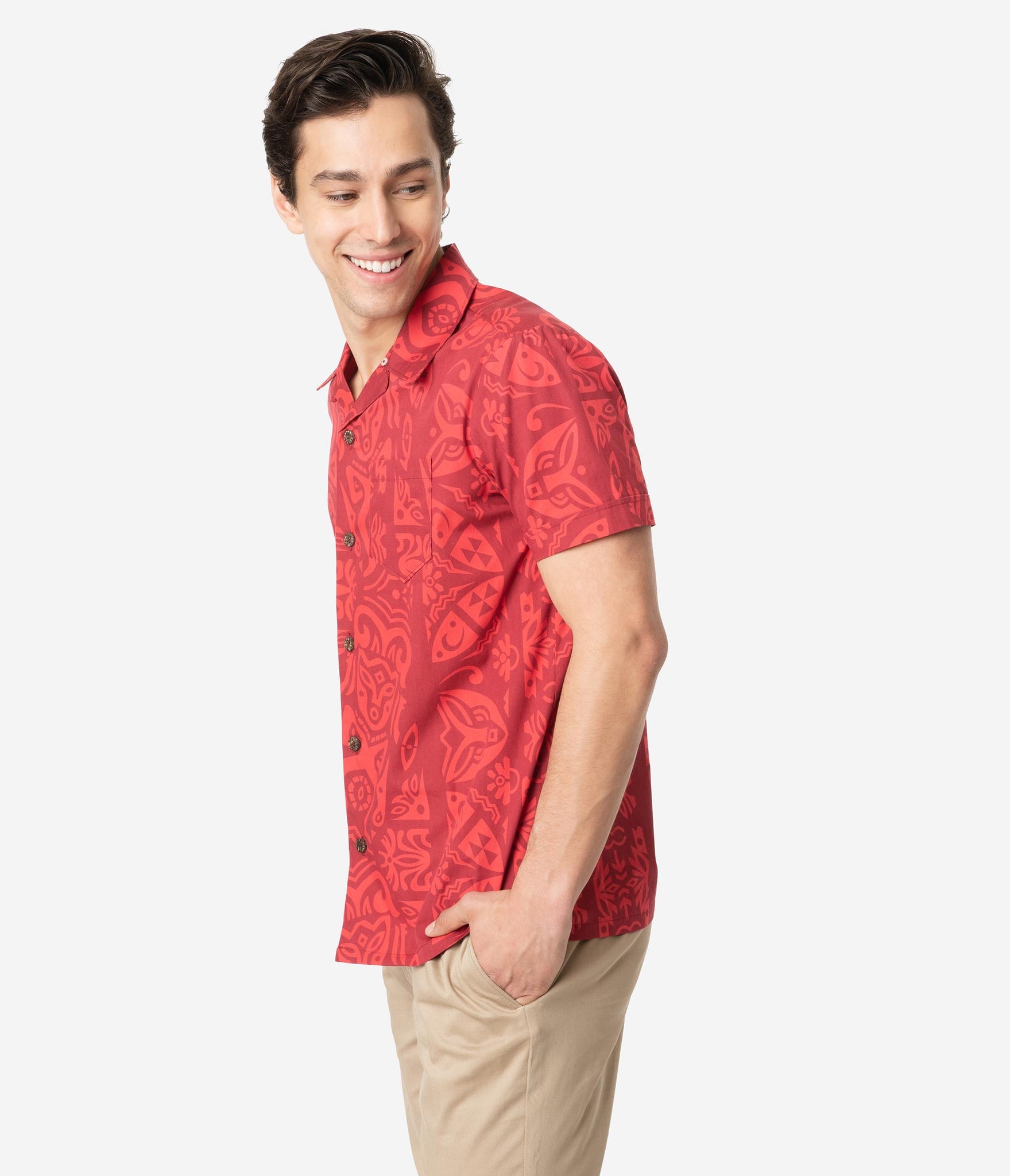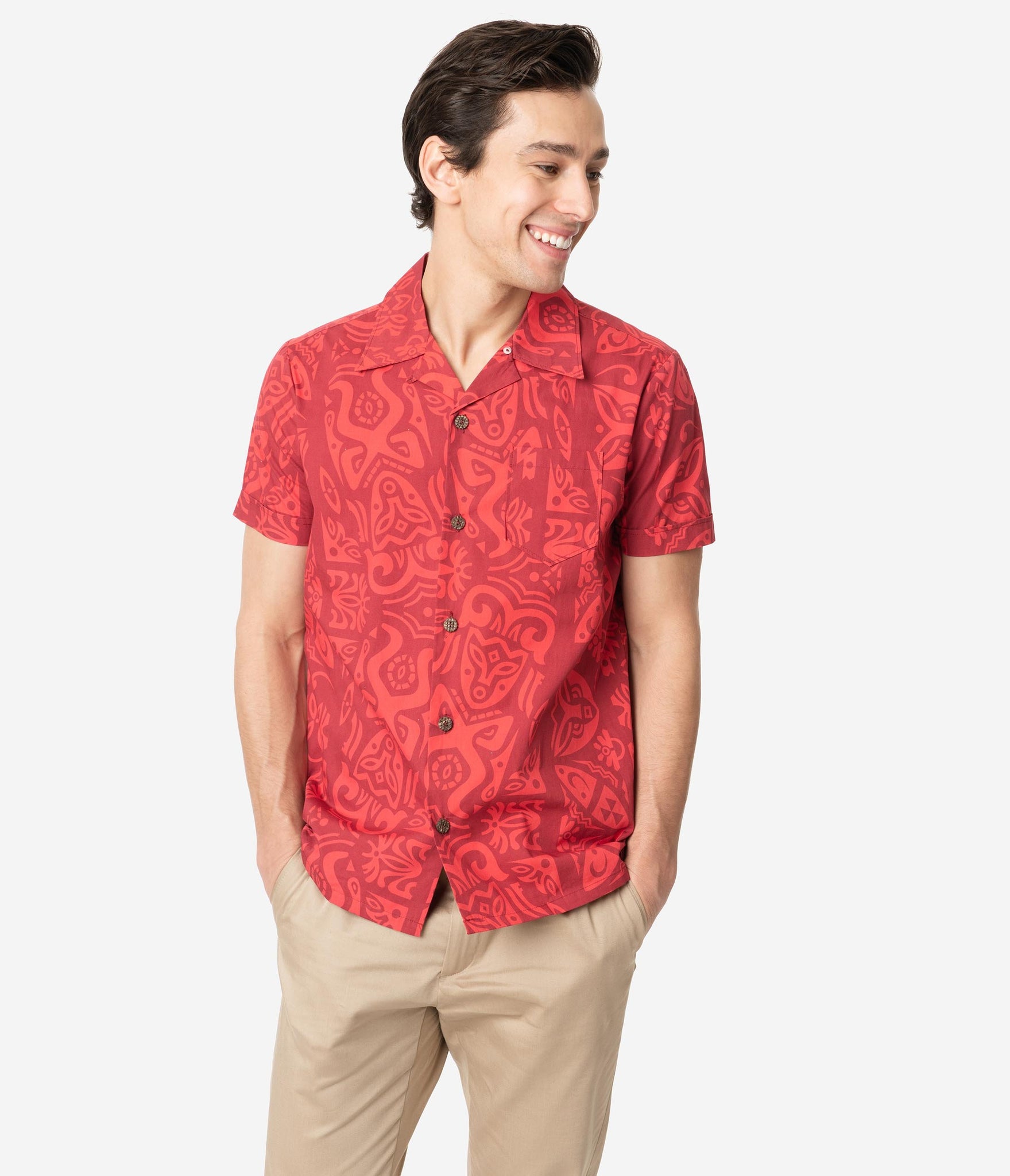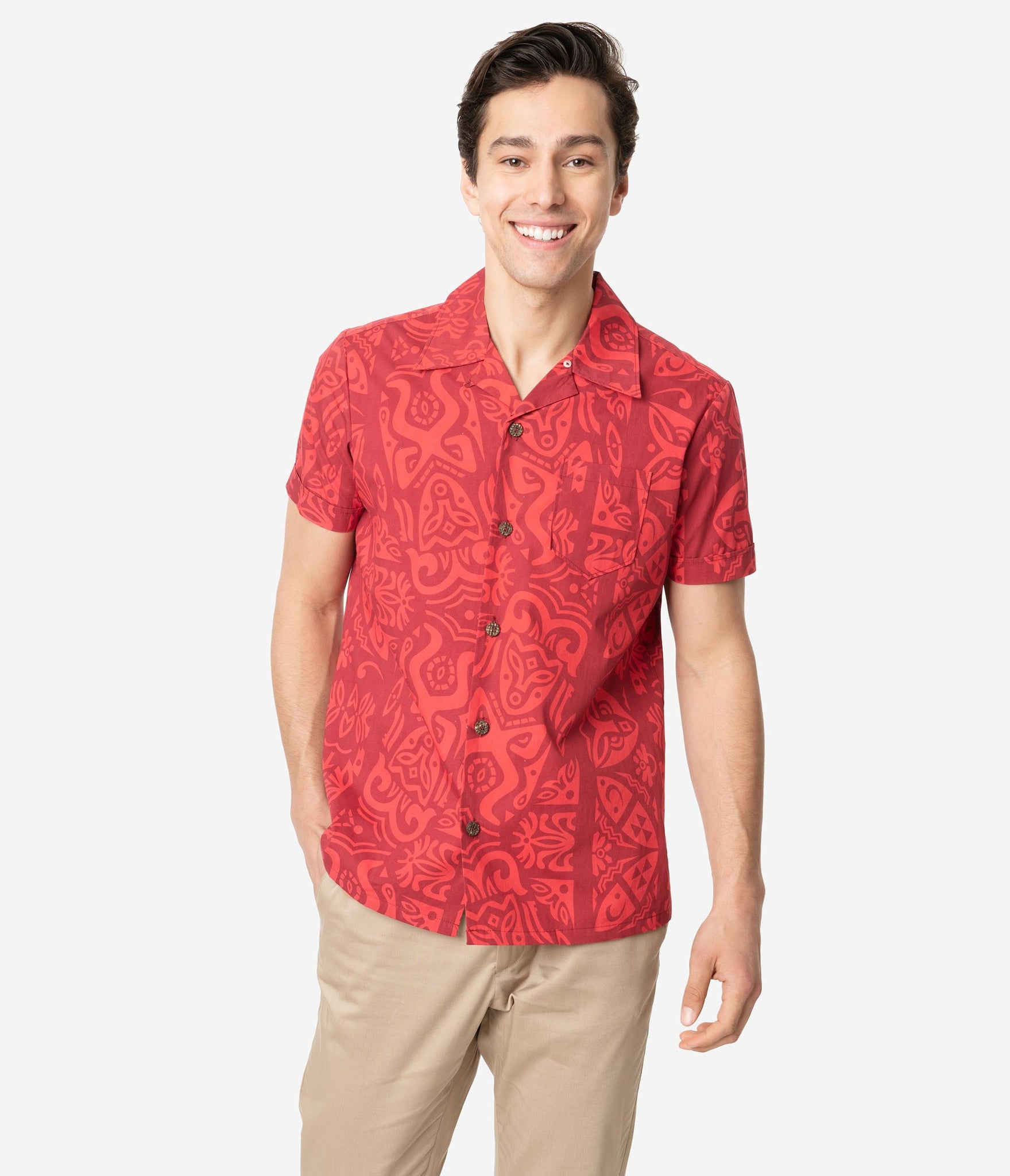 Fulfill your sightseeing dreams! Sailing in from Alfred Shaheen for Unique Vintage, this retro mens cabana shirt is a classic 1950s style piece that is a gorgeous officially licensed reproduction of the Alfred Shaheen original. The gorgeous Tiki Pareau print is cast in an eye-catching red cotton and boasts delightful wooden style buttons on the front and a classic breast pocket. Crafted with sweet short sleeves, a back yoke, and a notched collar, this brilliant mix of vintage styling and world-wide travel will get those tickets booked!