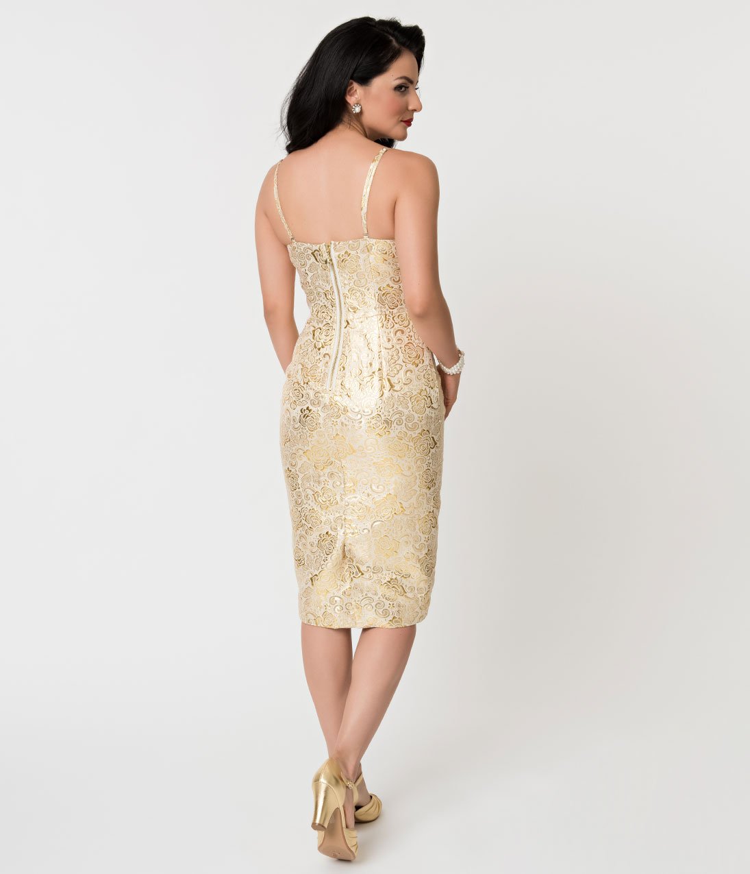 You’re golden, darling! Become the icon of vintage glamour with the elegant Golden Girl from Unique Vintage, a glowing life-sized reproduction of Barbie’s enchanting ensemble for a special occasion, originally released in 1959. A slim sheath dress shimmers in a striking gold and ivory brocade floral pattern with sparkling golden metallic threading, weaving it’s way through the vintage silhouette. The darted bodice features a straight neckline with adjustable and removable spaghetti straps for versatile wear as the seamed waist cinches your hourglass. Fully lined for lavish comfort and crafted with a back vent to allow for sultry struts, a back zipper and an exclusive gold Barbie lapel pin complete this splendid piece. A color to match your heart!