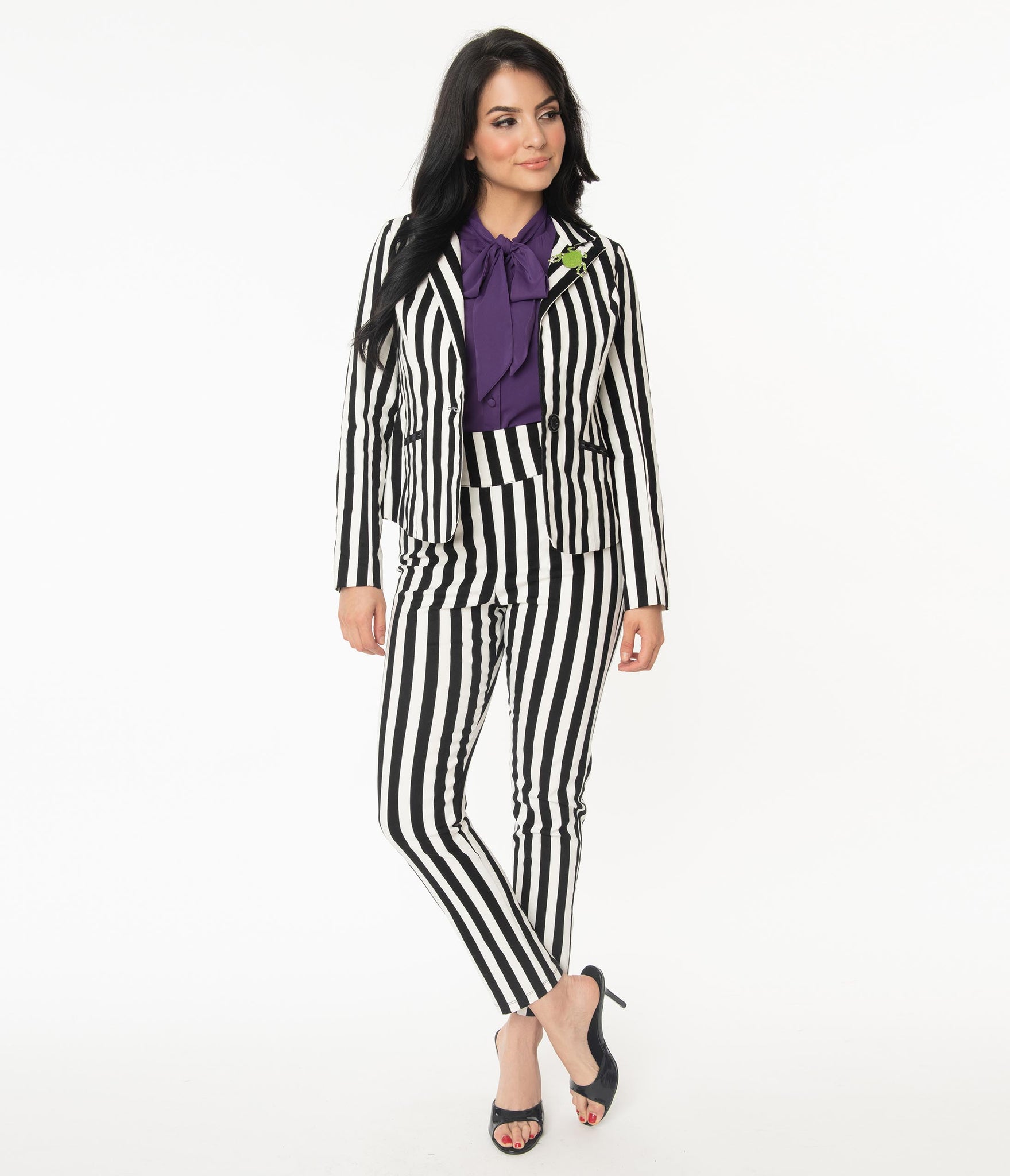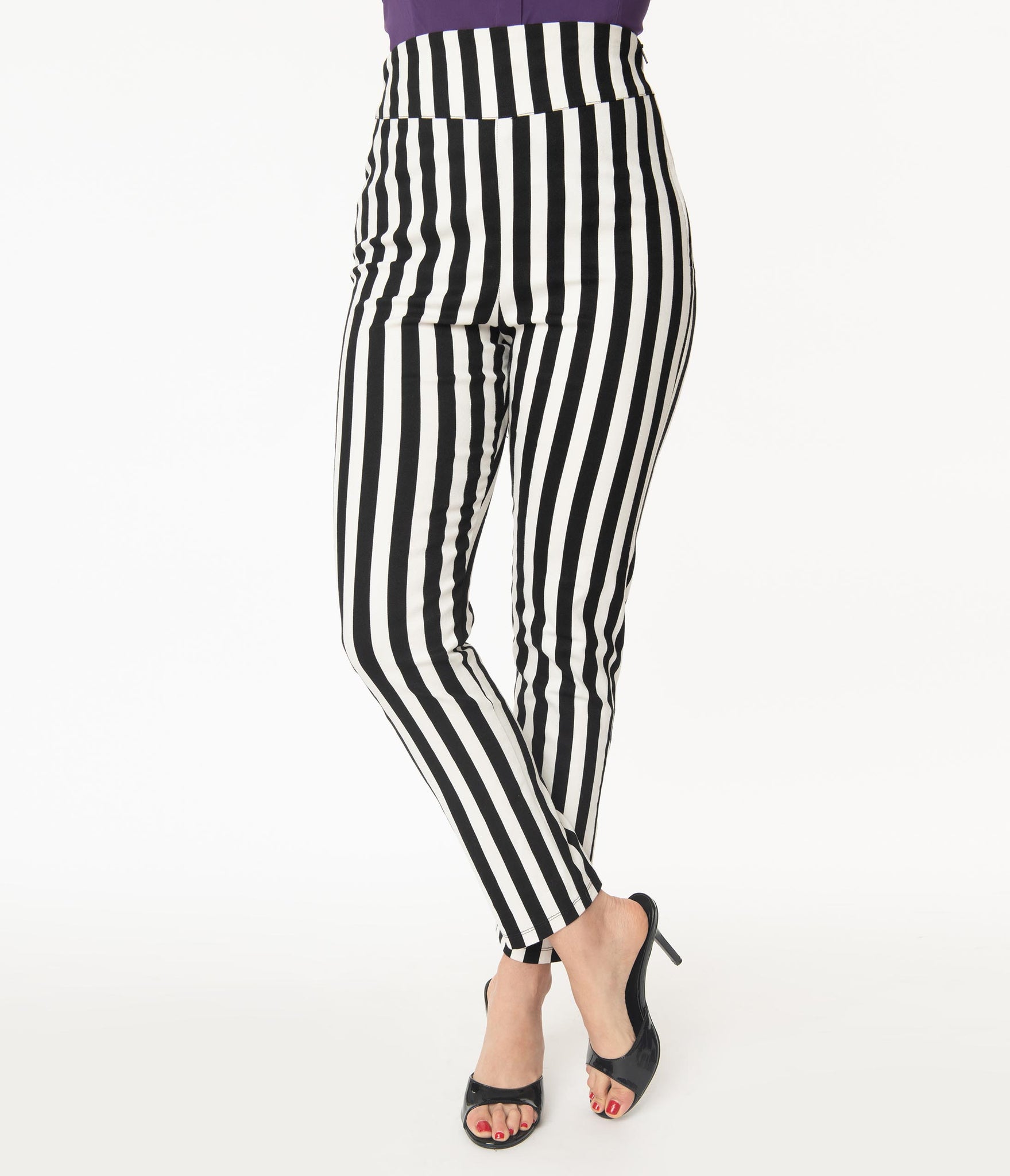 Glorify your gams, ladies! Full of sass and class in a chilling collaboration with Beetlejuice, the Rizzo Pants from Unique Vintage are crafted in a fabulous cotton stretch blend that flatters your feminine figure in a black and white stripe pattern. The dramatic high waist slims and elongates your form as the cigarette skinny leg glides to your ankles, complete with a side zipper to nip in your pin-up silhouette. Eat your heart out!