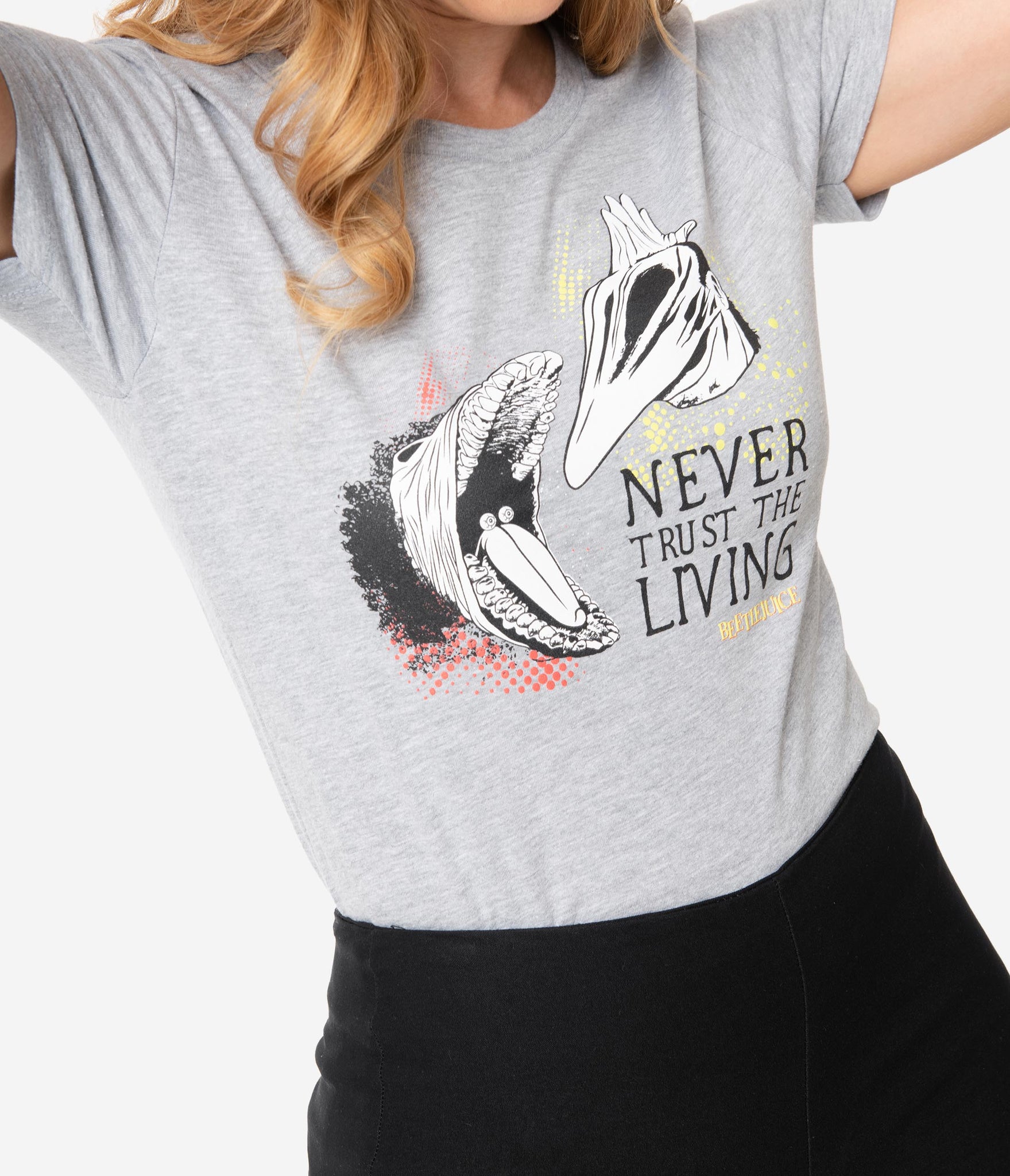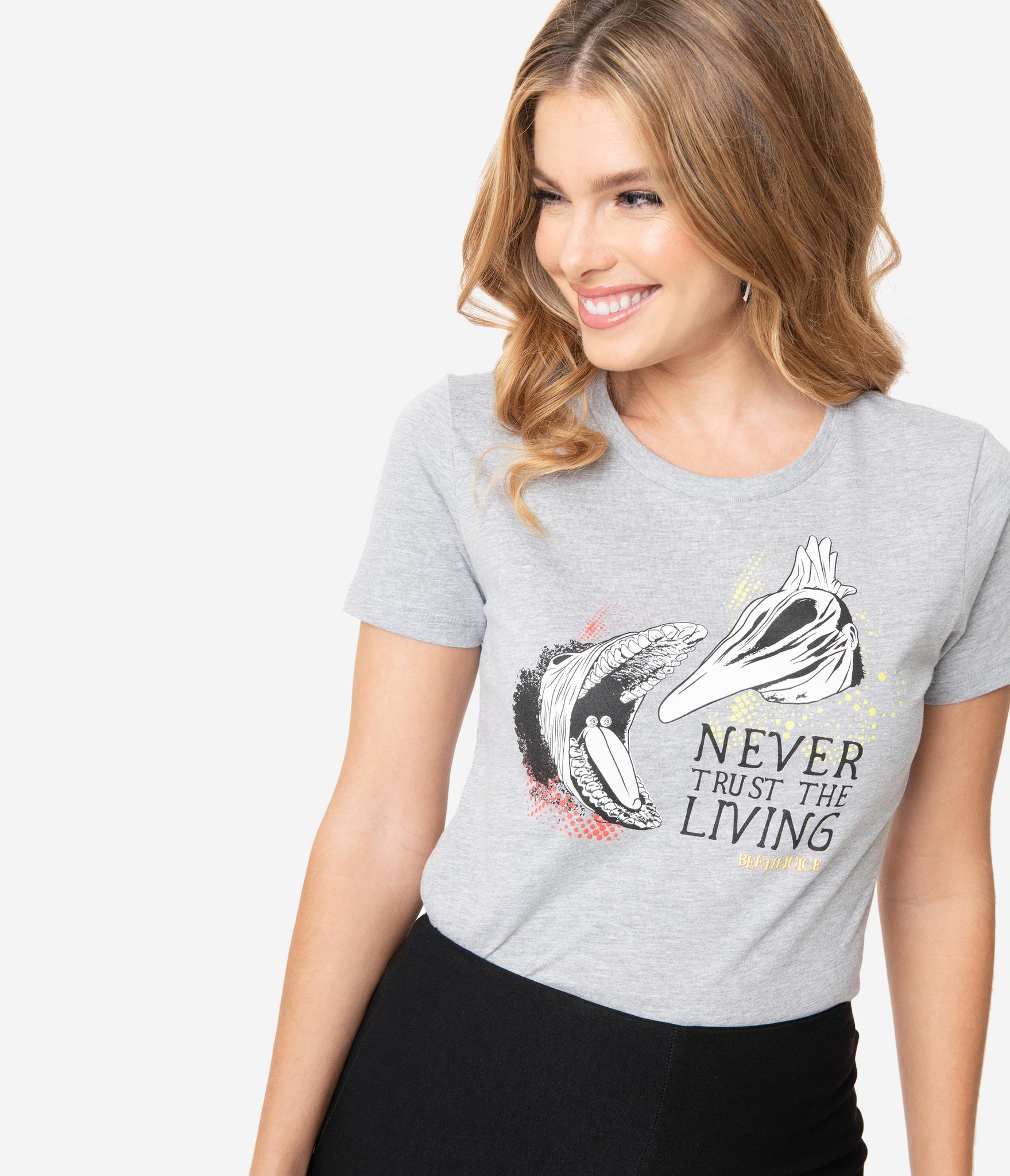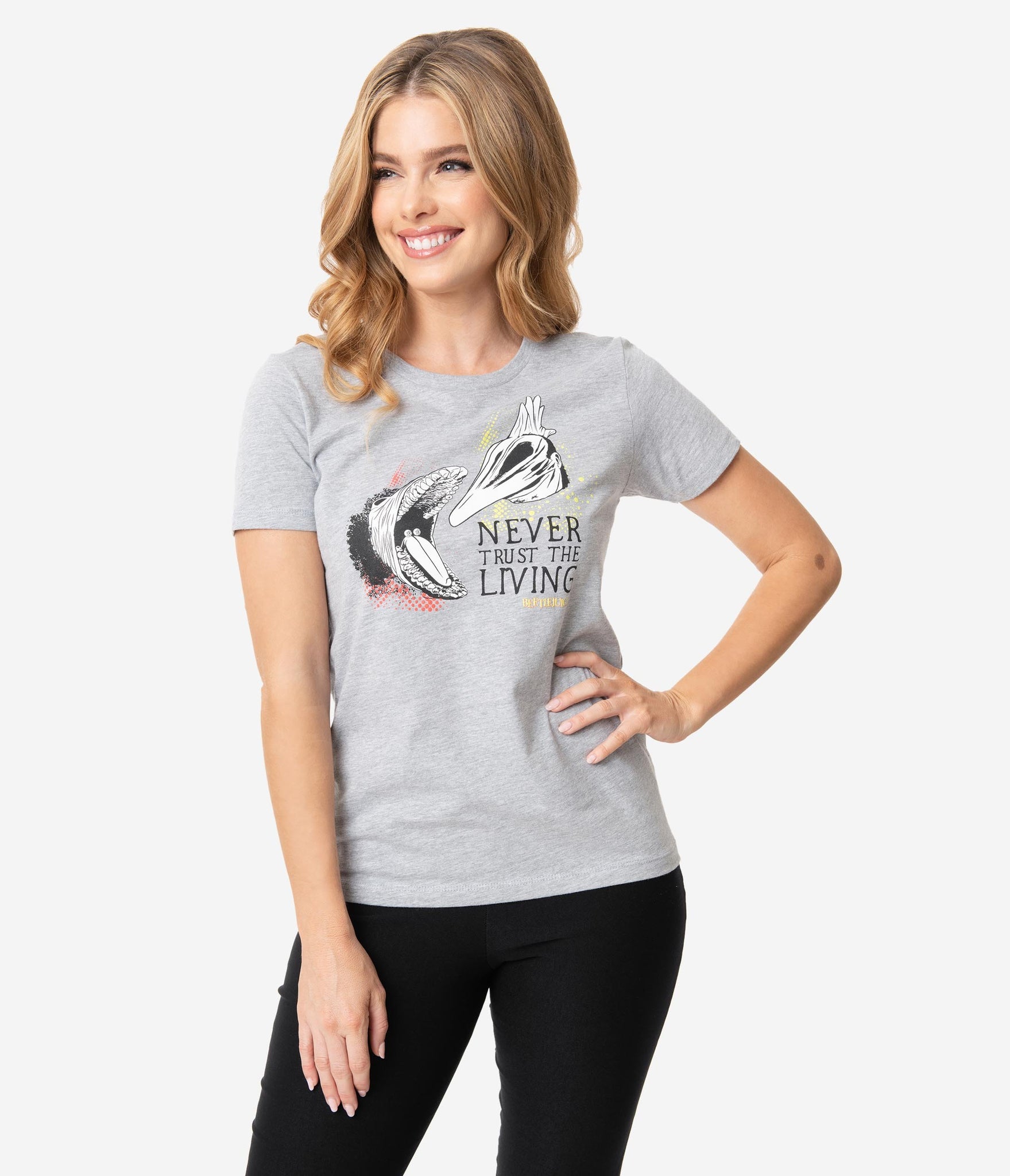 It’s not stupid, you’re ghosts! An adorable women’s tee from Unique Vintage, this chilling collaboration with Beetlejuice features the ghastly screen print of Adam and Barbara in their horrifying transformations with the font, ‘Never Trust The Living’. Cast in a soft grey cotton knit with a crew neckline, long torso, and short sleeves, just don’t leave The Handbook lying around!