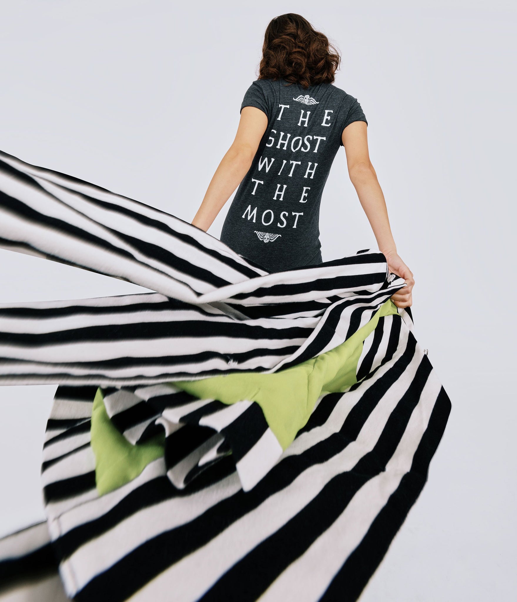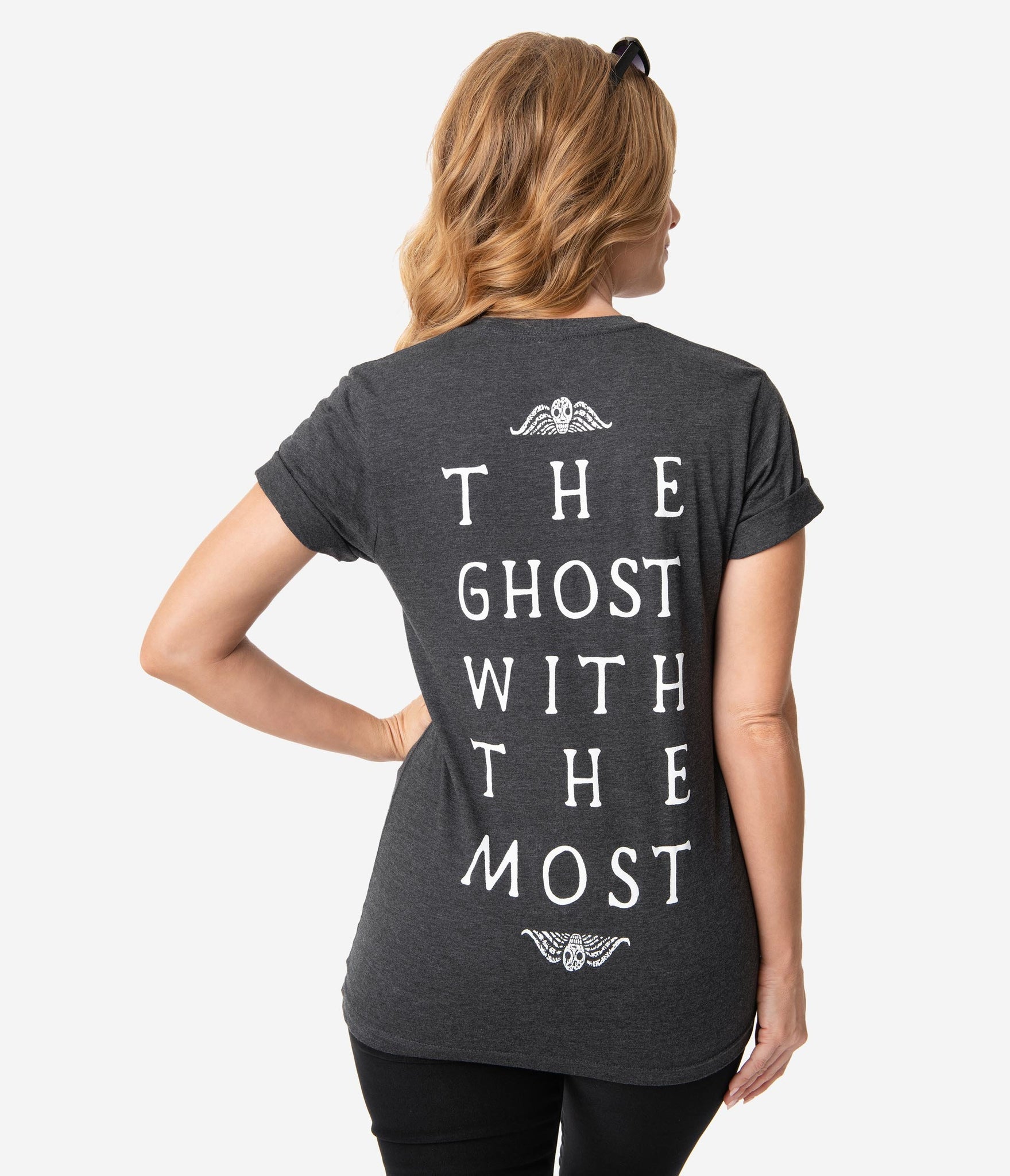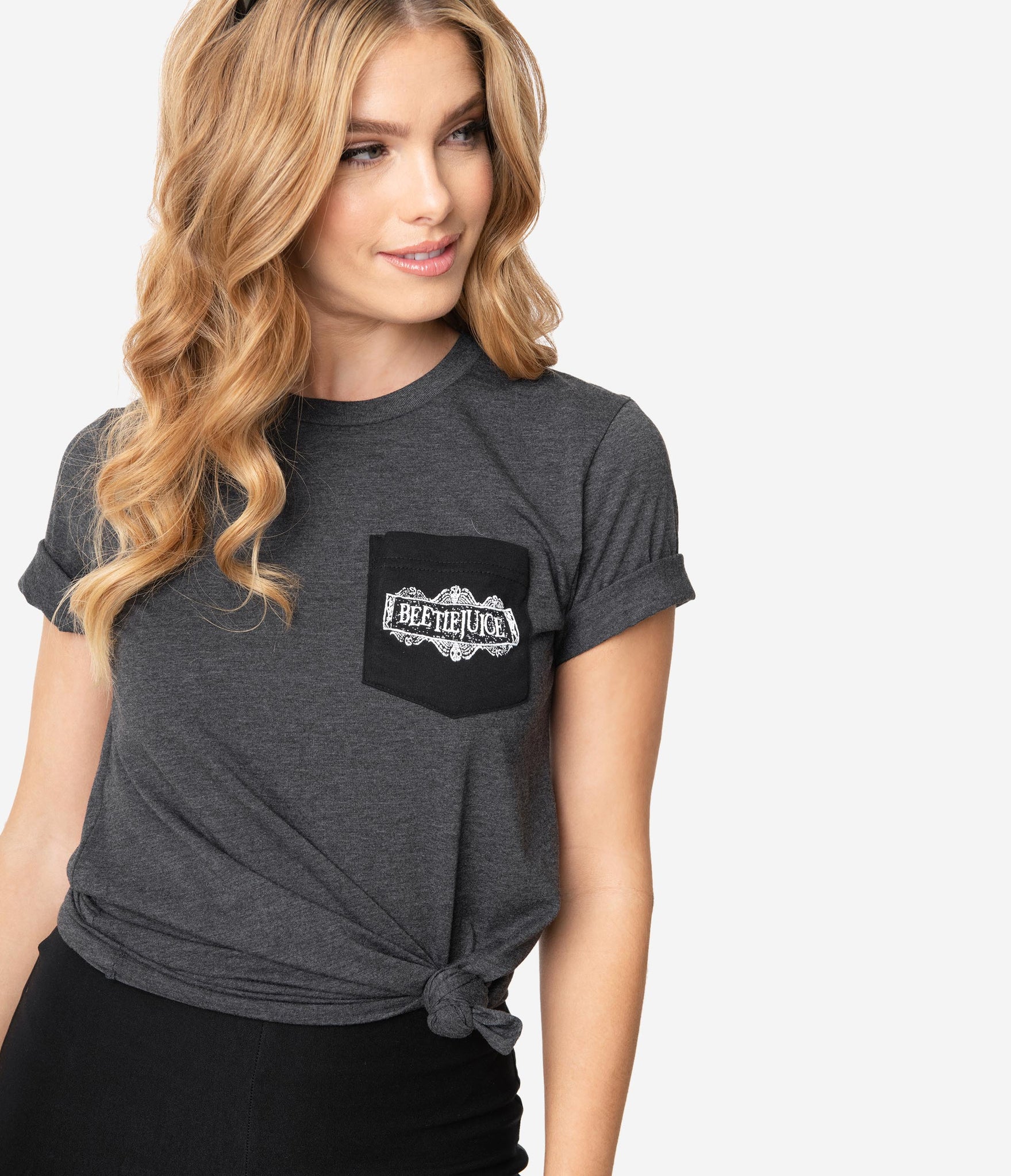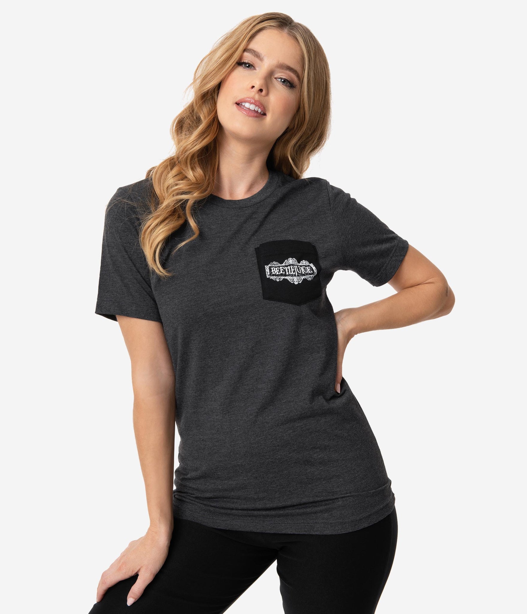 Anything you can do, he can do deader! A ghostly collaboration with Beetlejuice, this grey unisex tee from Unique Vintage features an adorable black chest pocket with the screen printed Beetlejuice title art in white. The long torso boasts the iconic quote, ‘The Ghost With The Most’ on the back while the crew neckline and short sleeves keep you cozy. Just say it one more time, won’t you?