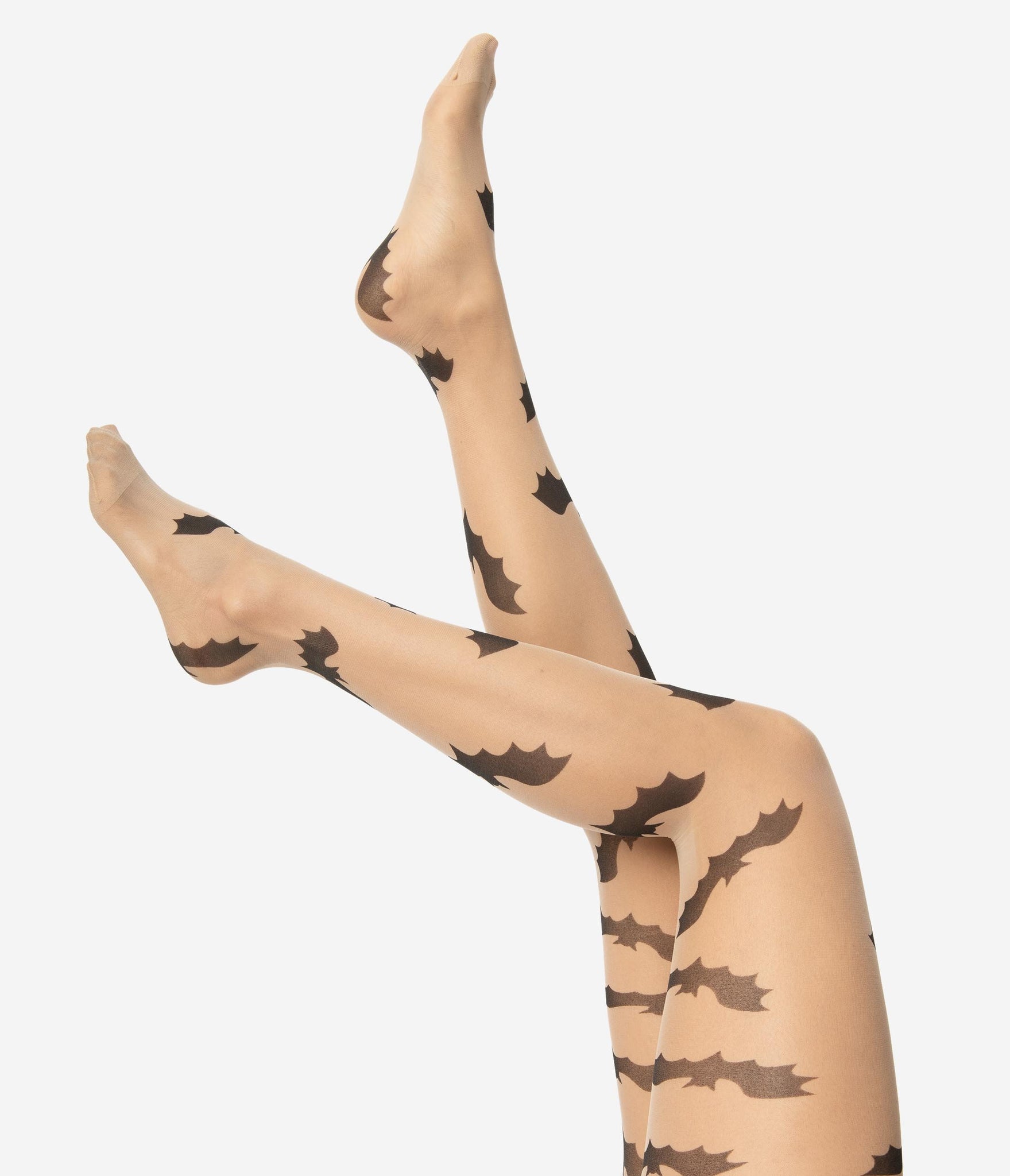 For the supernatural maven! A stretchy pair of beige nylon pantyhose teeming with flittering black bats!