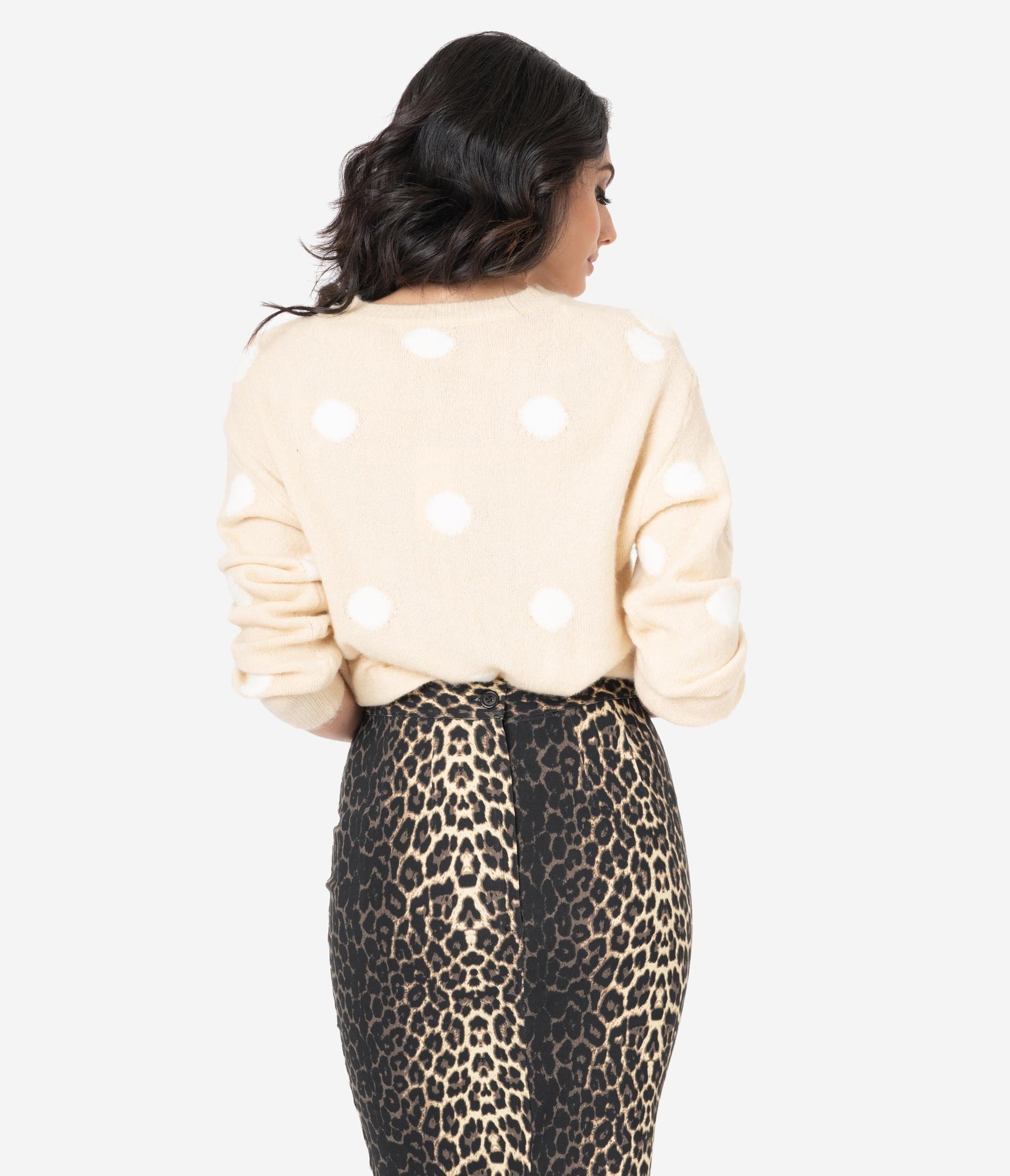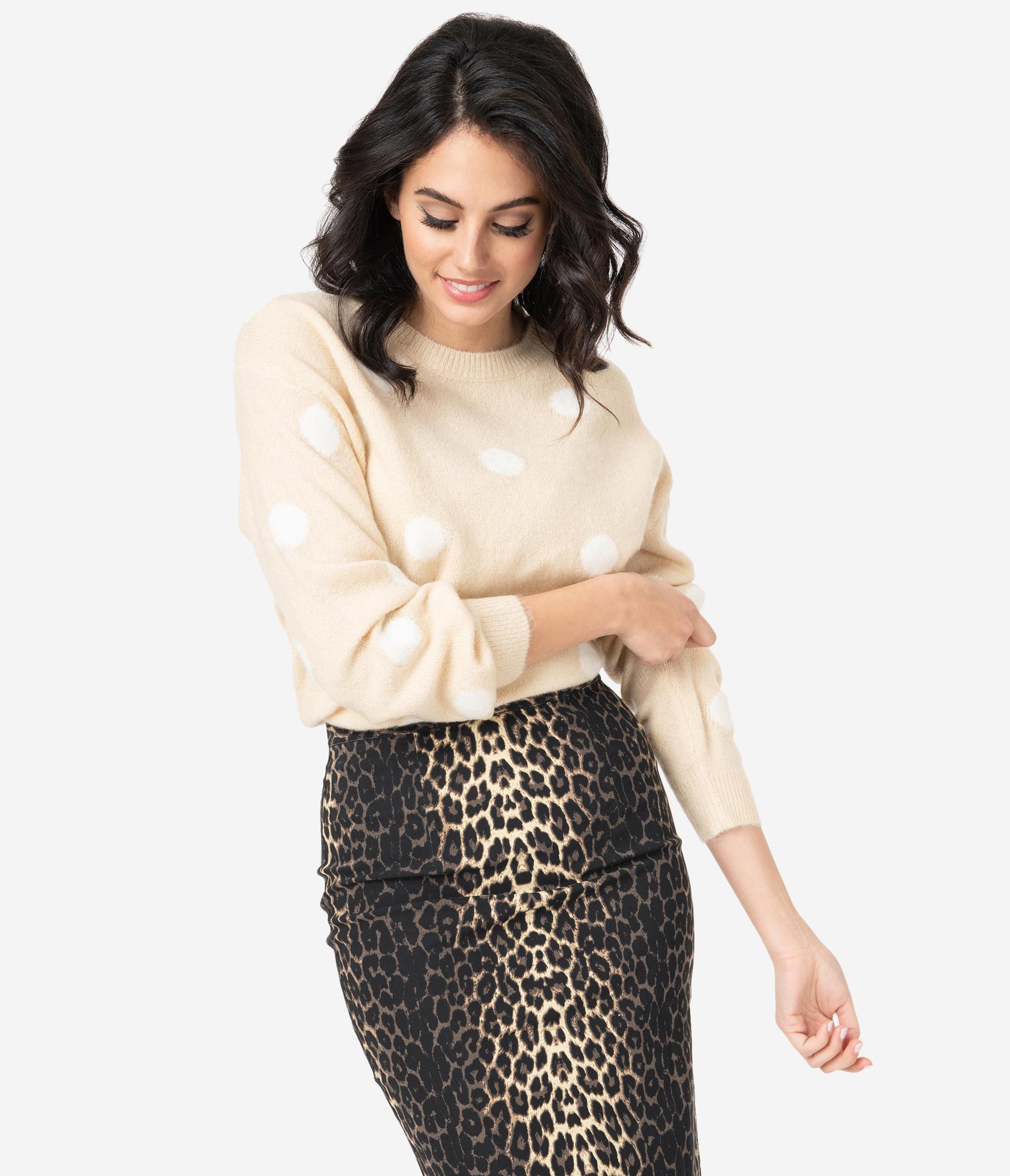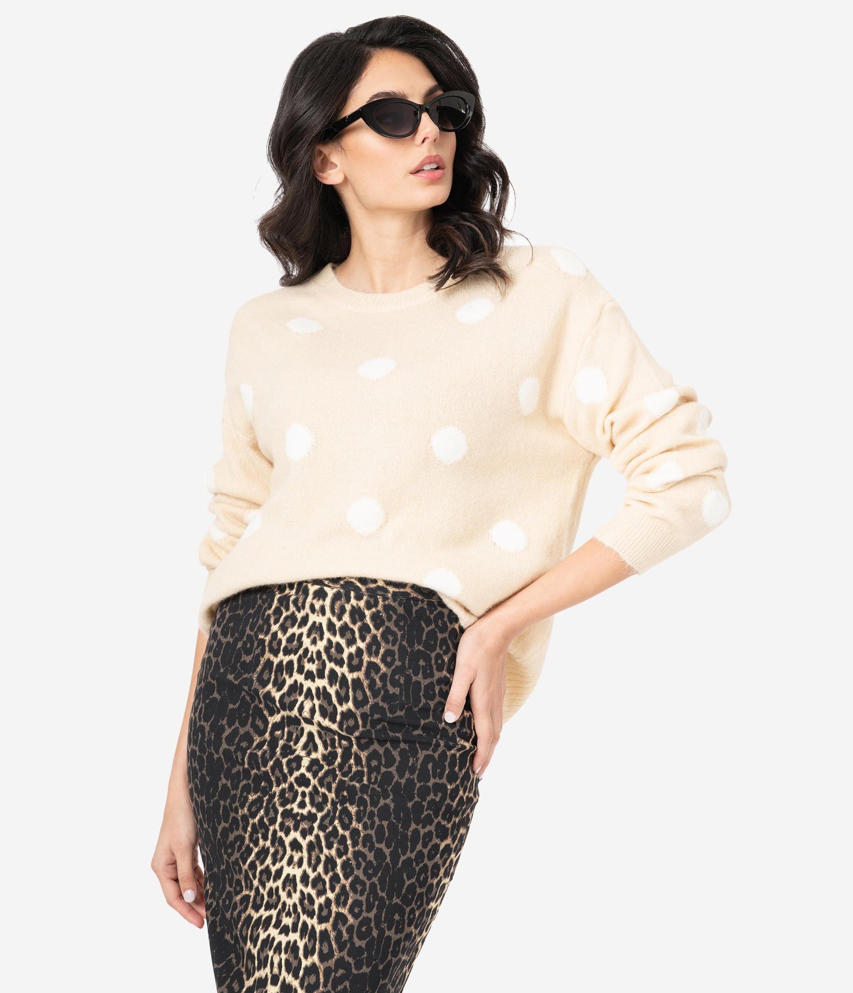 A welcomed essential! A soft and lightweight separate for cozy snuggles, this beige sweater is crafted in a fuzzy knit blend that dances with ivory polka dots throughout. Cast in a relaxed design, the crew neckline is framed by comfortable long sleeves and drops to a stay in place hemline.