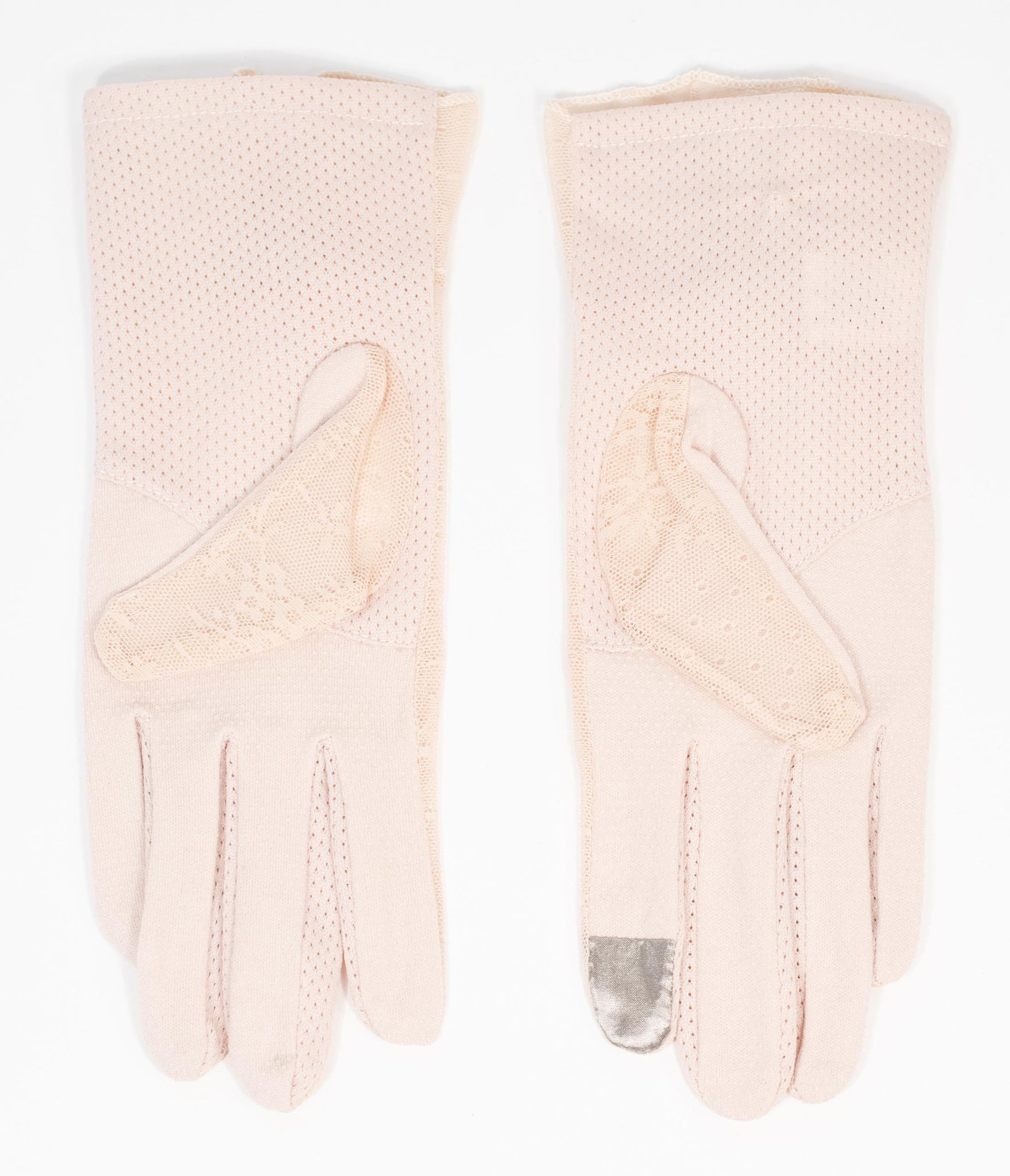 A beautiful addition! These lovely vintage pair are crafted in a fabulous sheer beige lace, embellished with a sweet floral on the wrist. The perforated palms features silicone stippling for easy grip and a touchscreen pointer finger for modern mobility!