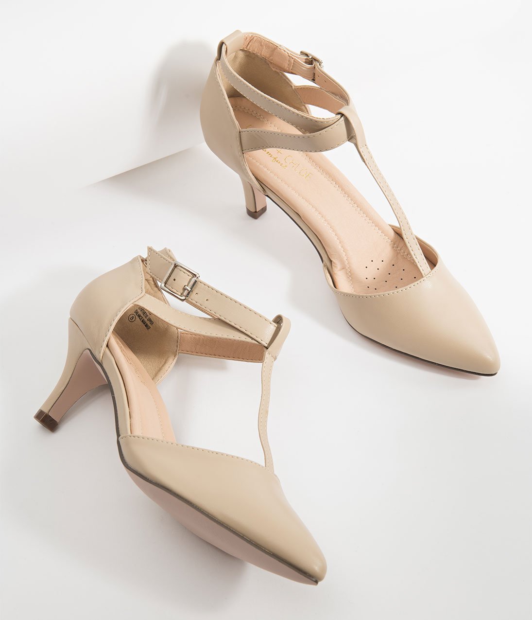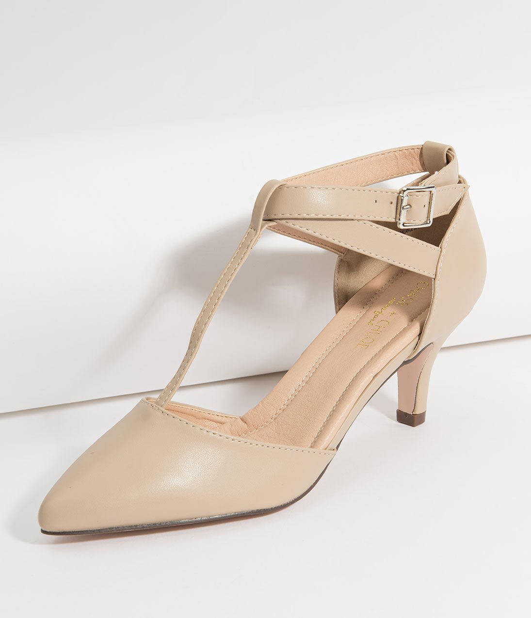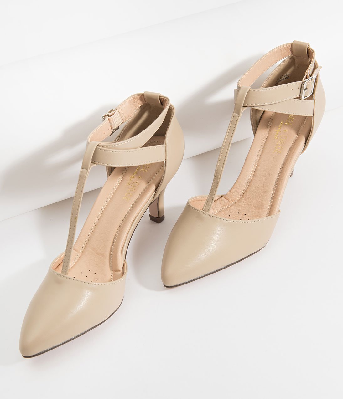 We never cease to amuse ourselves with these feminine retro T-straps. Chic and swank, the soft leatherette beige heels are an elegant match to any vintage ensemble. Featuring a ladylike 2.5in. pump, these flapper beauties have an adjustable ankle strap that wraps around for a unique style while the pointed toe and soft sole inlay keep your kicks comfortable!