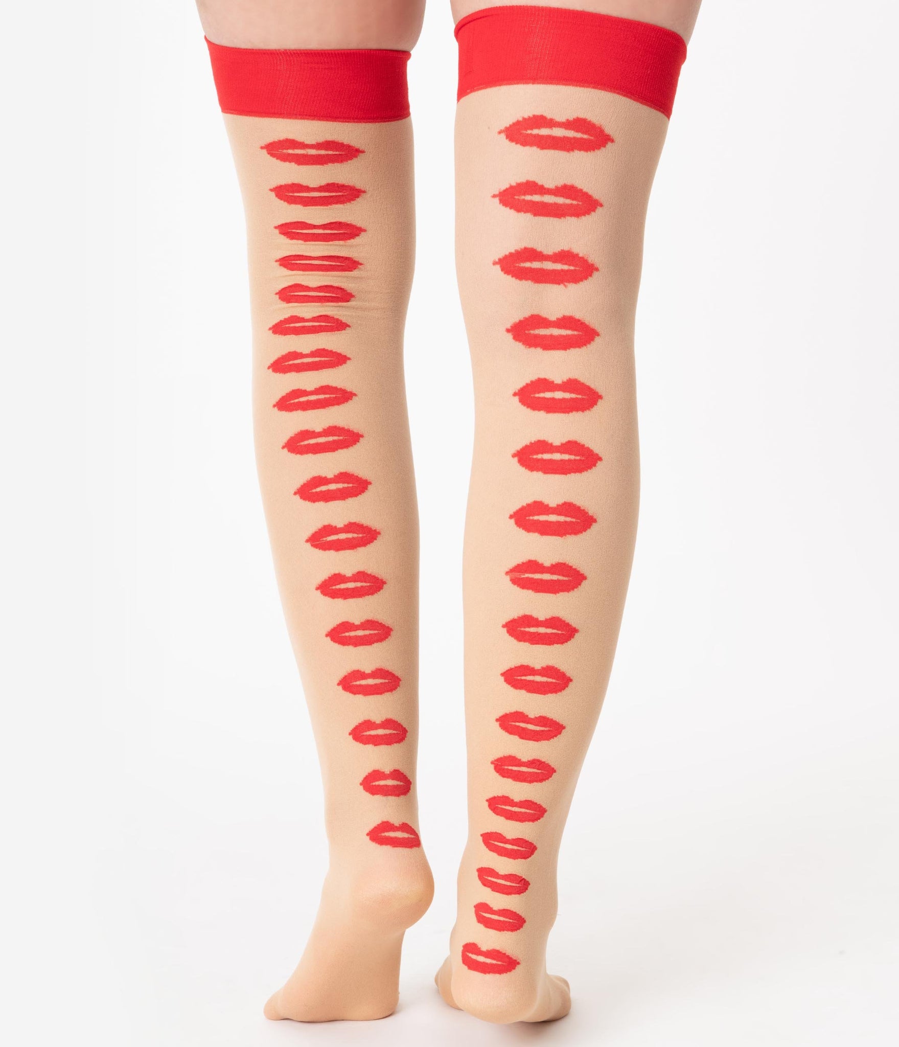 A master of make outs! These flirtatious stockings are crafted in a beige nylon that extend thigh high to a wide red banded top and boast an eye-catching back seam of red lips. With a seamed toe, the endearment is real! One size fits most. Available while supplies last.