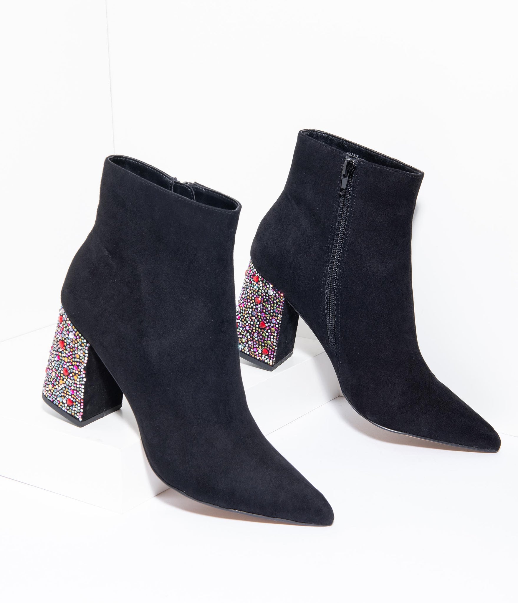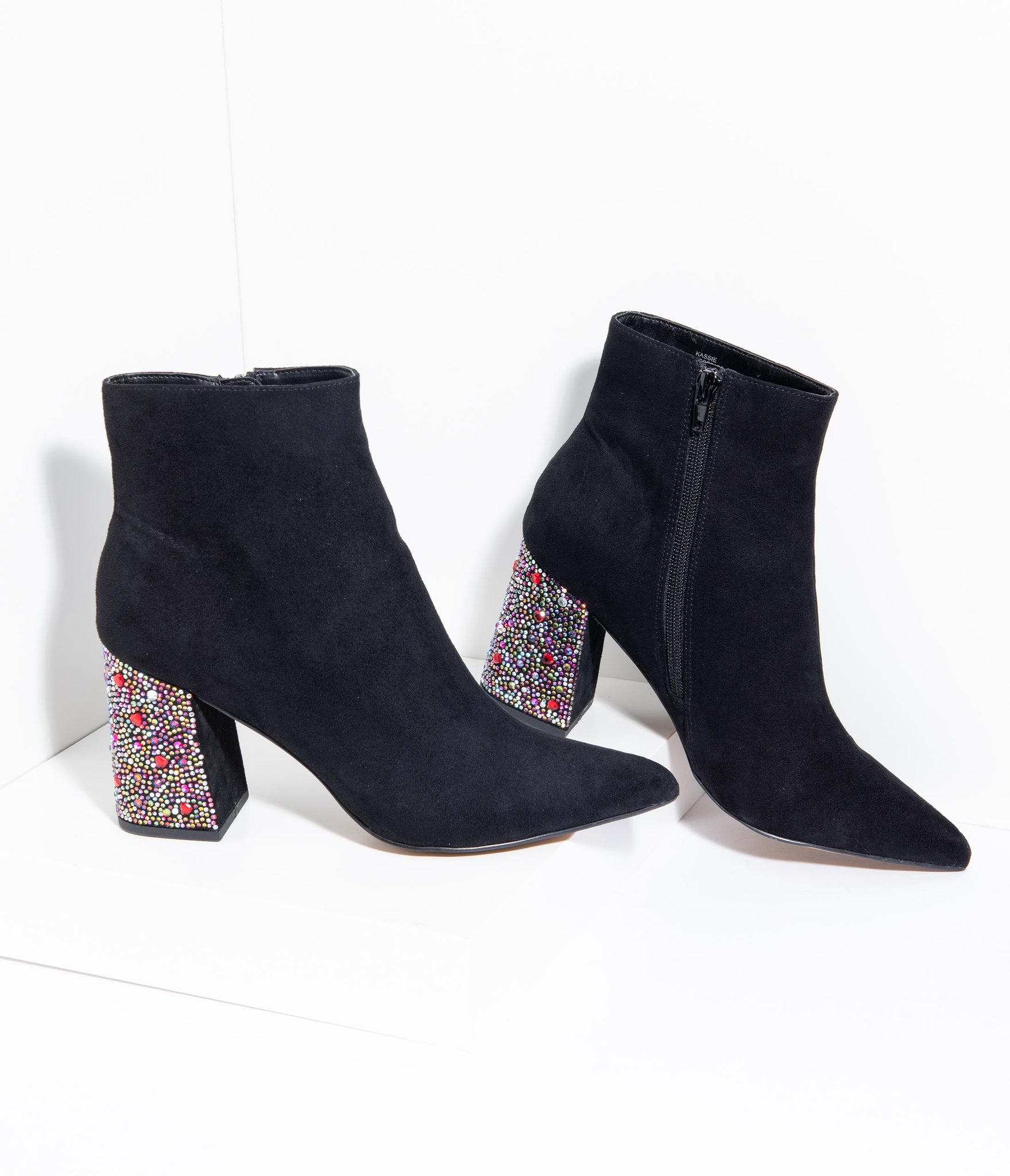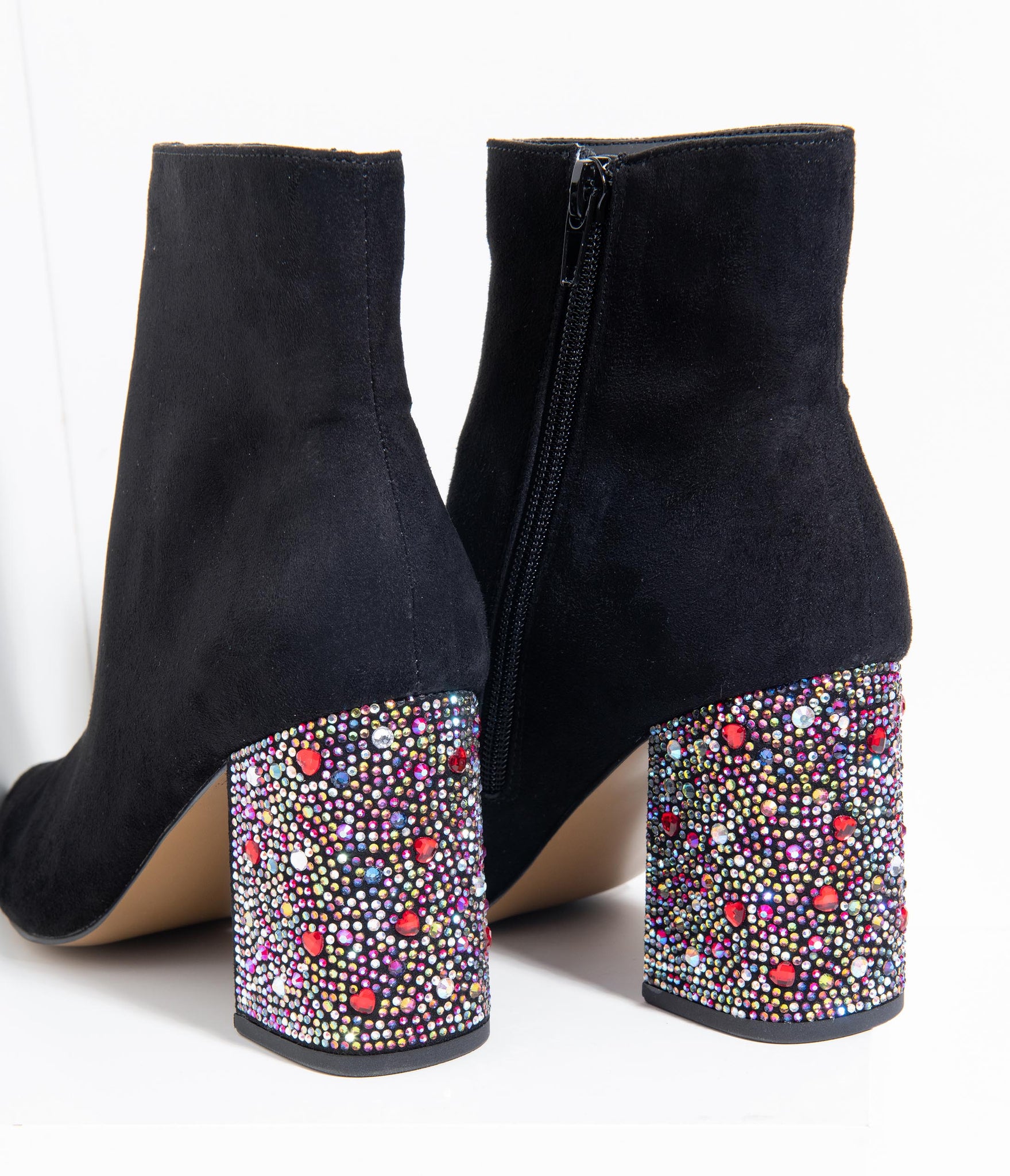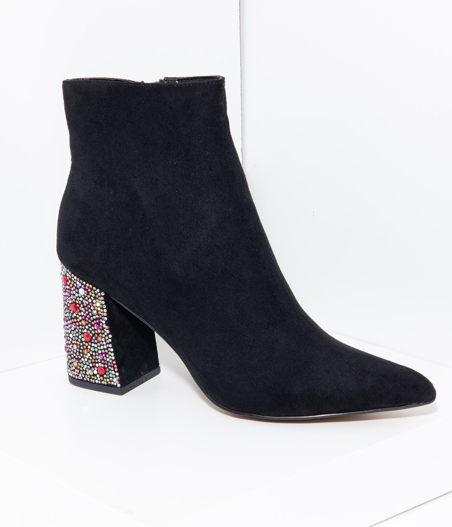 Kick up your heels, gals! These pose ready booties from Betsey Johnson are crafted in a soft faux suede and boast a sparkling 3.5” block heel, bedazzled with a colorful array of rhinestones. The pointed toe keeps you looking sharp while a side zipper make these heels an easy addition to your ensemble.