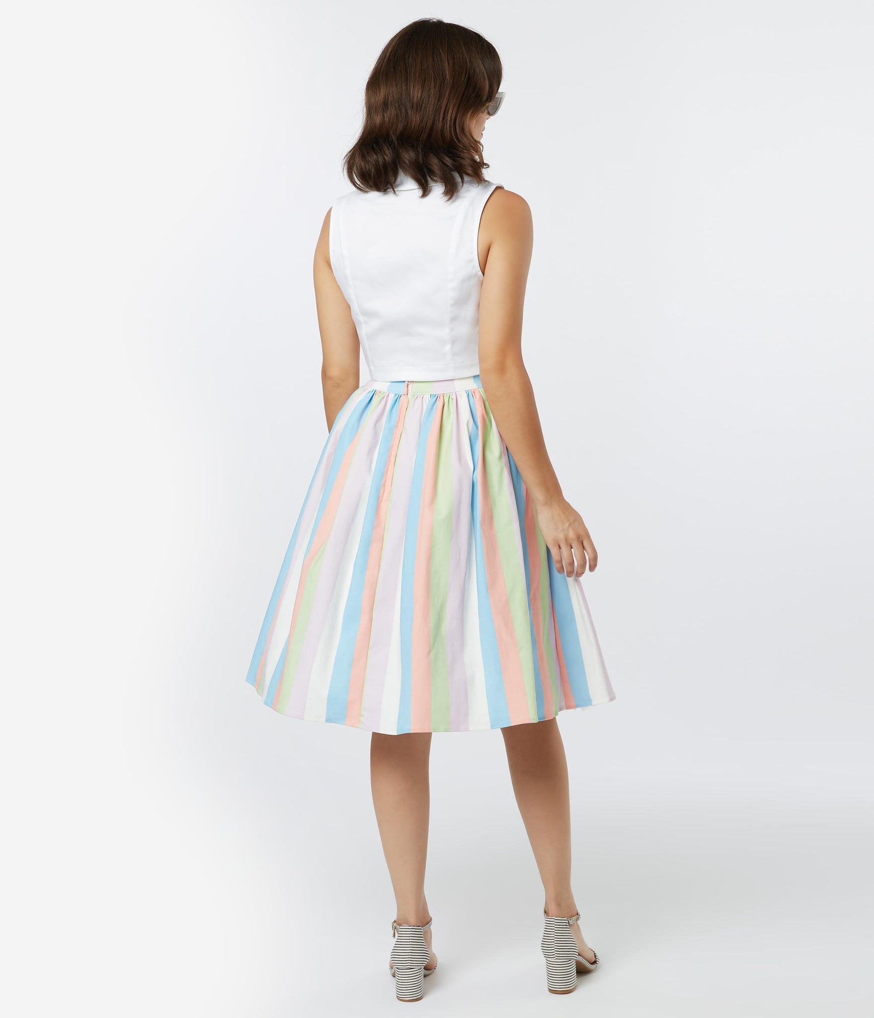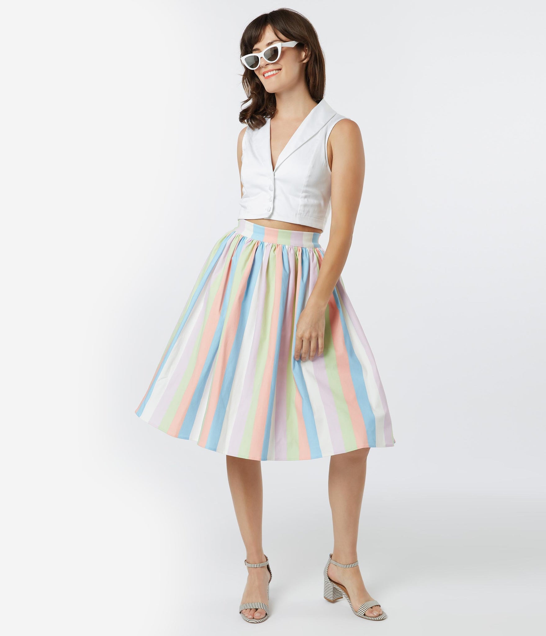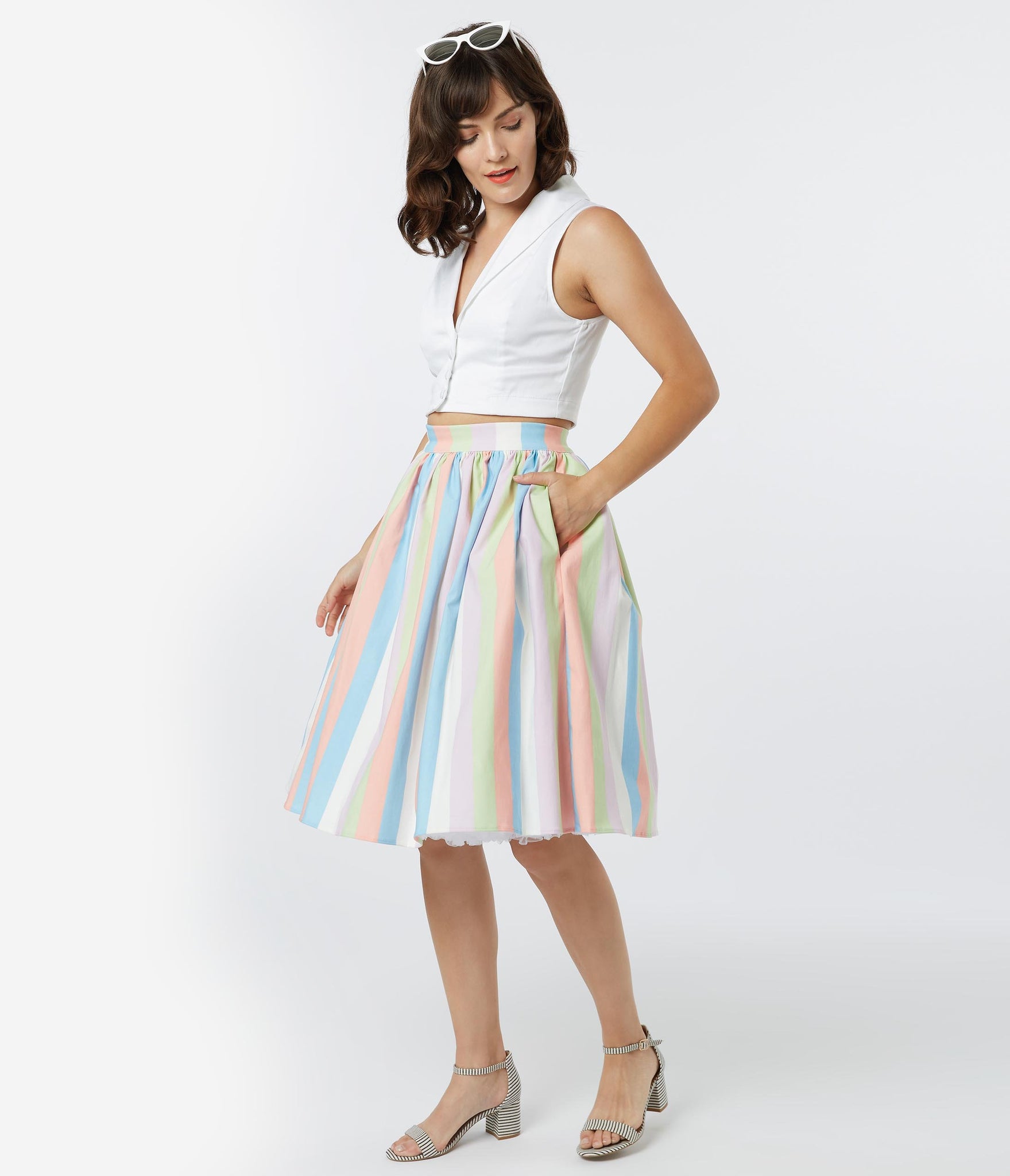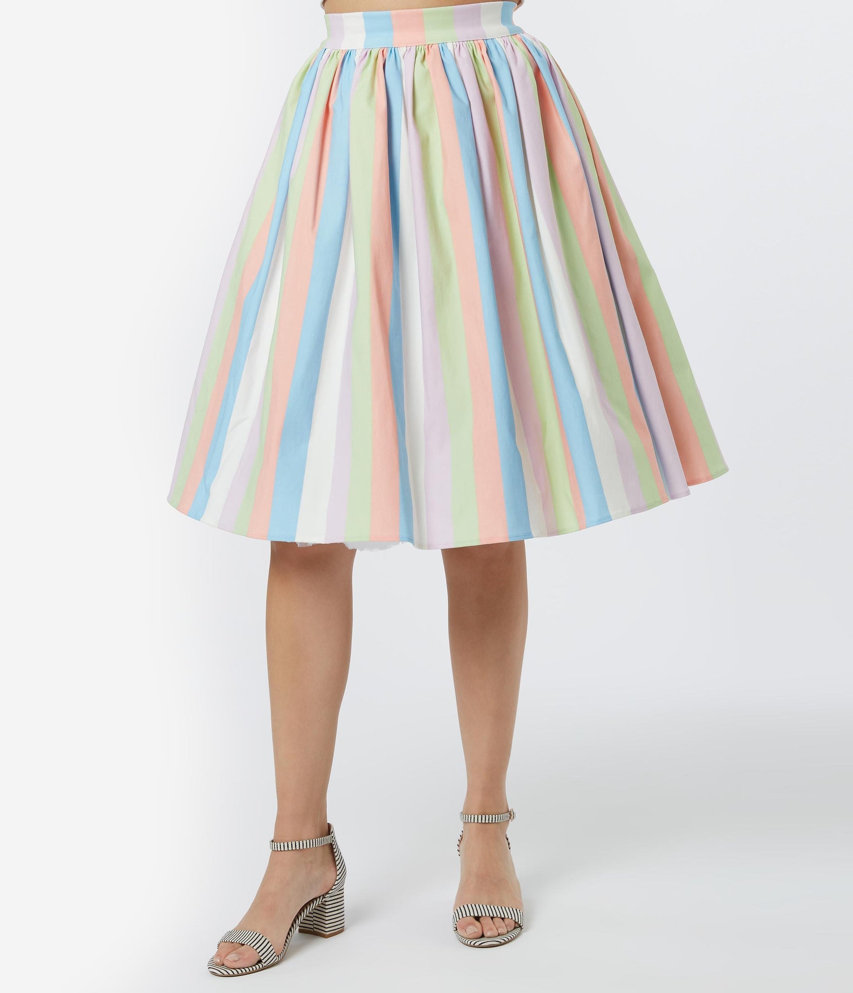 Give your classics a new twist, ladies! Become a retro gem in this beautiful swing skirt from Bettie Page, set in a graceful pastel stripe of pink, blue, green, and ivory white. Crafted in a marvelous blend, the banded high waist is nipped in by a back zipper and tops out the charming gathering that cascades into a mid-century swing skirt. Outfitted with side pockets, it’s pure vintage charm!