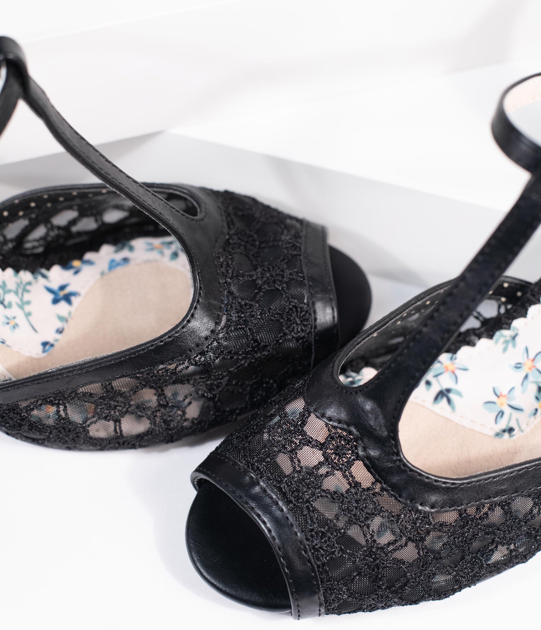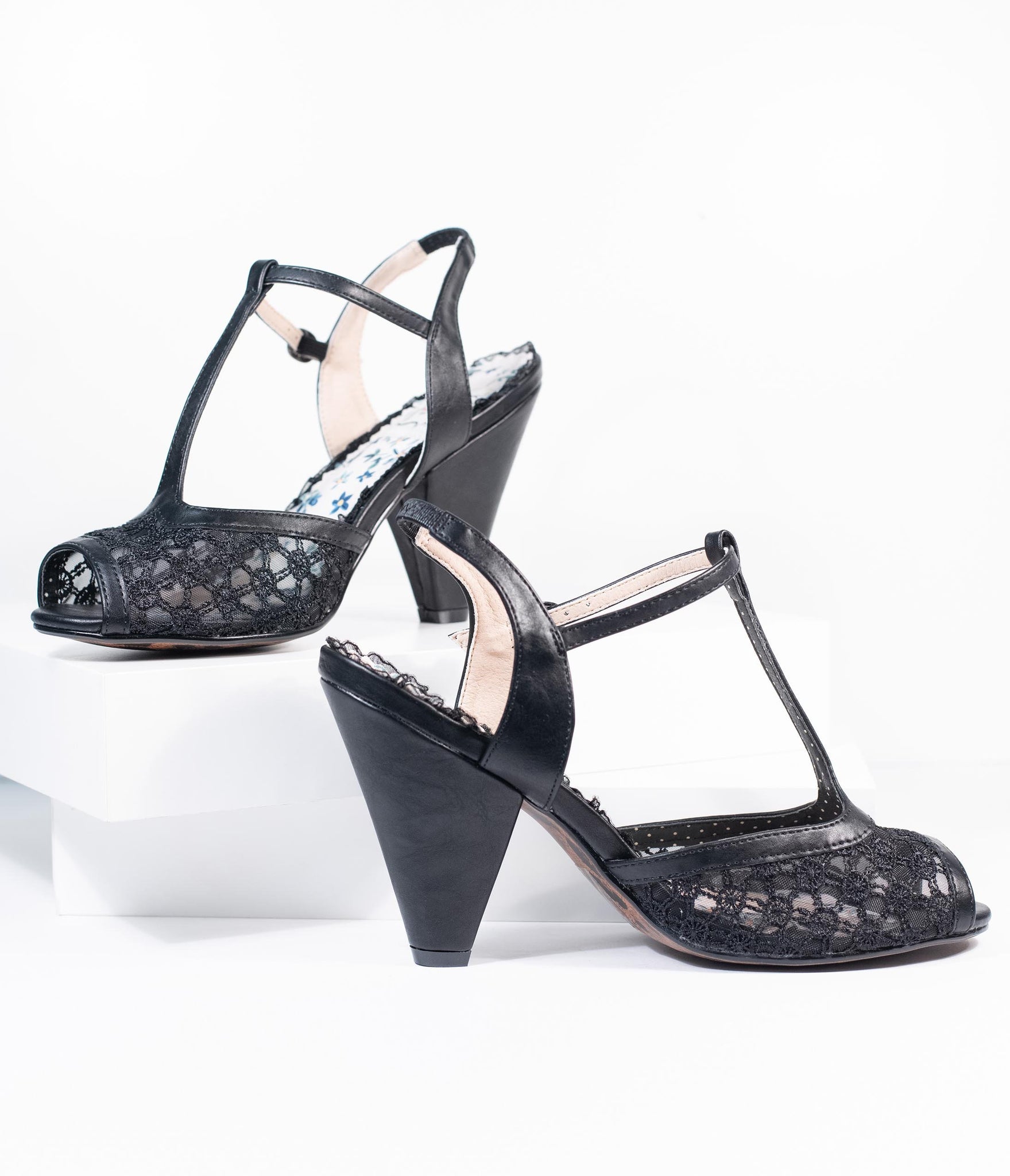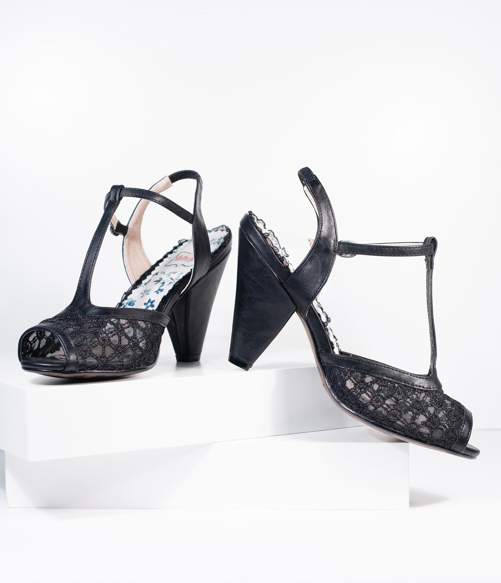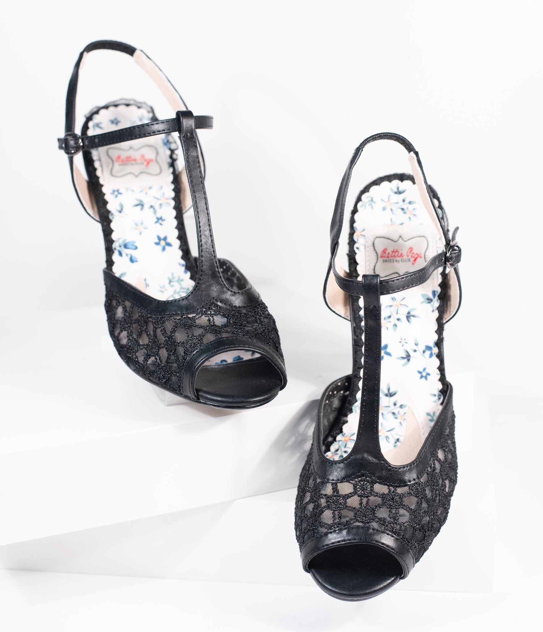 Charm and grace, gals! The graceful kicks are a gorgeous pair from Bettie Page in a beautiful black leatherette. The flirtatious peep toe vamp boasts lovely lace for feminine flair while the t-strap lends retro elegance. Complete with a gored and adjustable ankle strap, the 4 inch cone heel and cushion insole keeps you standing statuesque!